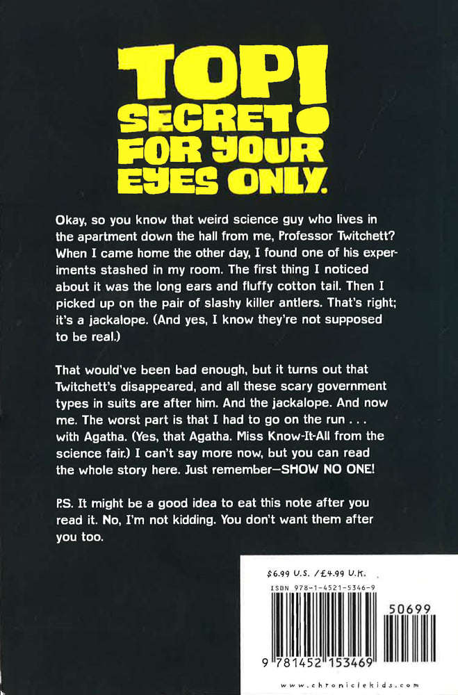 Jeremy's troubles begin when his eccentric neighbor leaves him an experiment for safekeeping: a jackalope! This so-called mythological creature looks like a bunny rabbit, but comes with razor-sharp antlers and is purported to be a ruthless killer. When government agents show up at Jeremy's house seeking the jackalope for their own nefarious purposes, Jeremy must find a way to protect the jackalope, and himself. So he reluctantly joins forces with Agatha, his holier-than-thou genius neighbor. Together, with the jackalope (and his weapons-grade antlers) tucked away in a backpack, they have only one chance to save Jack and still get their science fair projects in on time.