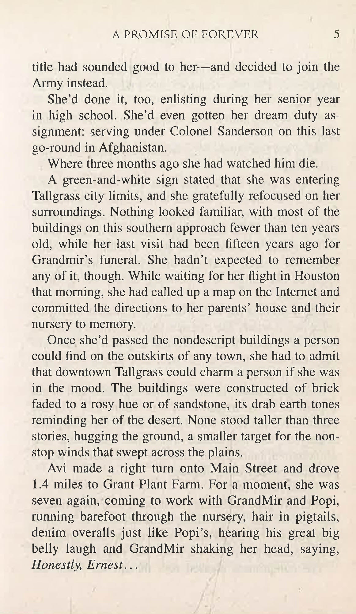 Sergeant First Class Avi Grant's return to Tallgrass, Oklahoma is a long-deferred wish come true. With her final tour in Afghanistan over, Avi can focus on her future-a job here at home and a family of her own. There's just one thing she has to do first: visit her beloved commanding officer's widow and share her grief. The last thing she expected was to feel an instant attraction to the woman's son. Too bad the sexy surgeon is impossible to ignore . . . and even harder to resist.
