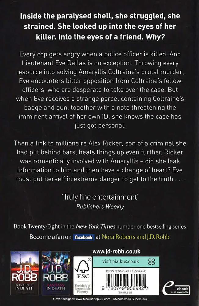 Inside the paralysed shell, she struggled, she strained. She looked up into the eyes of her killer. Into the eyes of a friend. Why? Every cop gets angry when a police officer is killed. And Lieutenant Eve Dallas is no exception. Throwing every resource into solving Amarylis Coltraine's brutal murder, Eve encounters bitter opposition from Coltraine's fellow officers, who are desperate to take over the case. But when Eve receives a strange parcel containing Coltraine's badge and gun together with a note threatening the imminent arrival of her own ID, she knows the case has just got personal. Then a link to millionaire Alex Ricker, son of a criminal she had put behind bars, heats things up even further. Ricker was romantically involved with Amarylis - did she leak information to him and then have a change of heart? Eve must put herself in extreme danger to get to the truth...