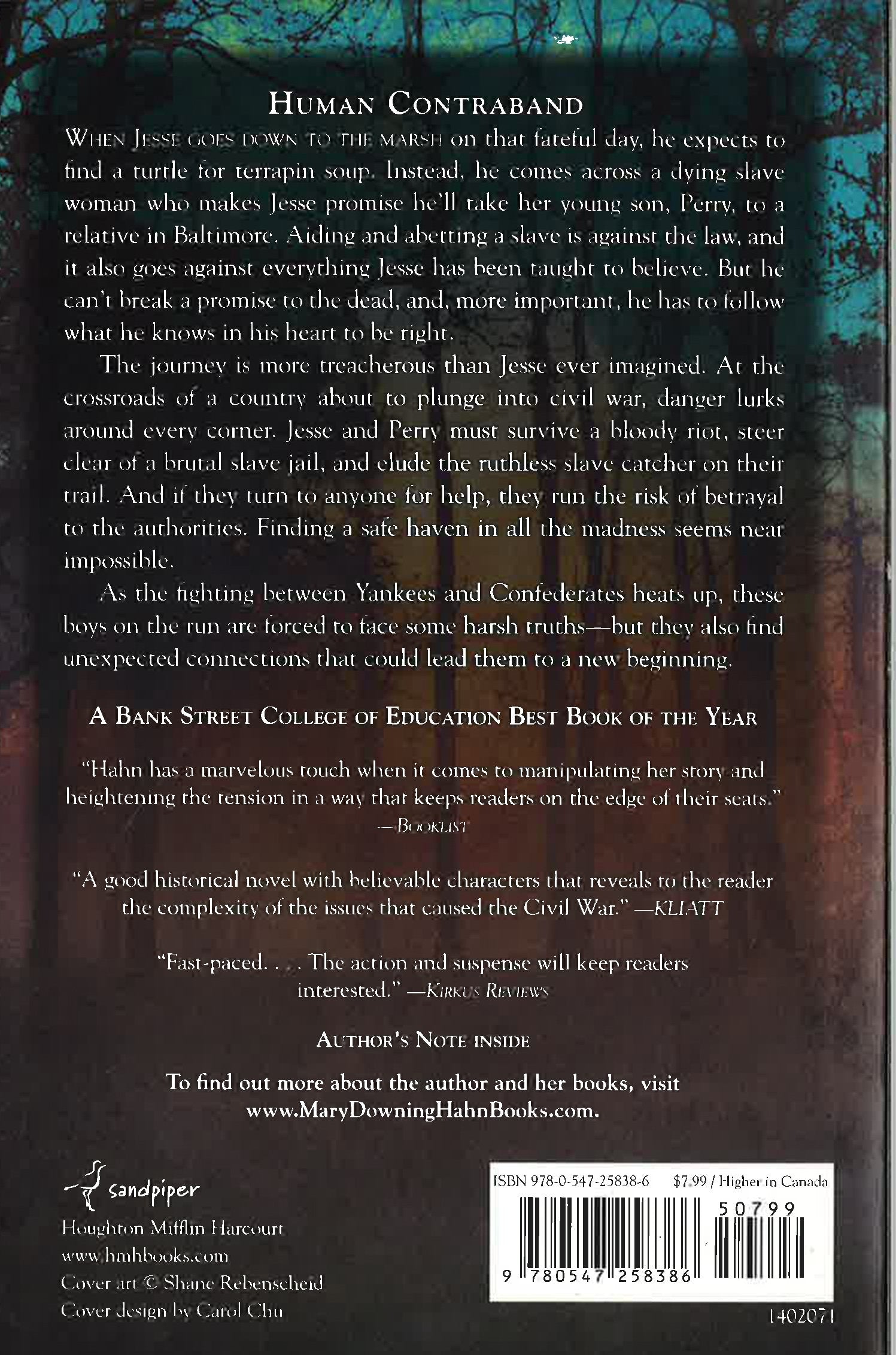 When Jesse went down to the marsh on that fateful day, he expected to find a turtle for terrapin soup. Instead, he comes across a dying slave woman who makes Jesse promise he'll take her young son, Perry, to a relative in Baltimore. Aiding and abetting a slave is against the law, and it also goes against everything Jesse has been taught to believe. But he can't break a promise to the dead, and, more important, he has to follow what he knows in his heart to be right. The journey is more treacherous than Jesse ever imagined. At the crossroads of a country about to plunge into civil war, danger lurks around every corner. Will these boys on the run ever find a safe haven? Includes an author's note.