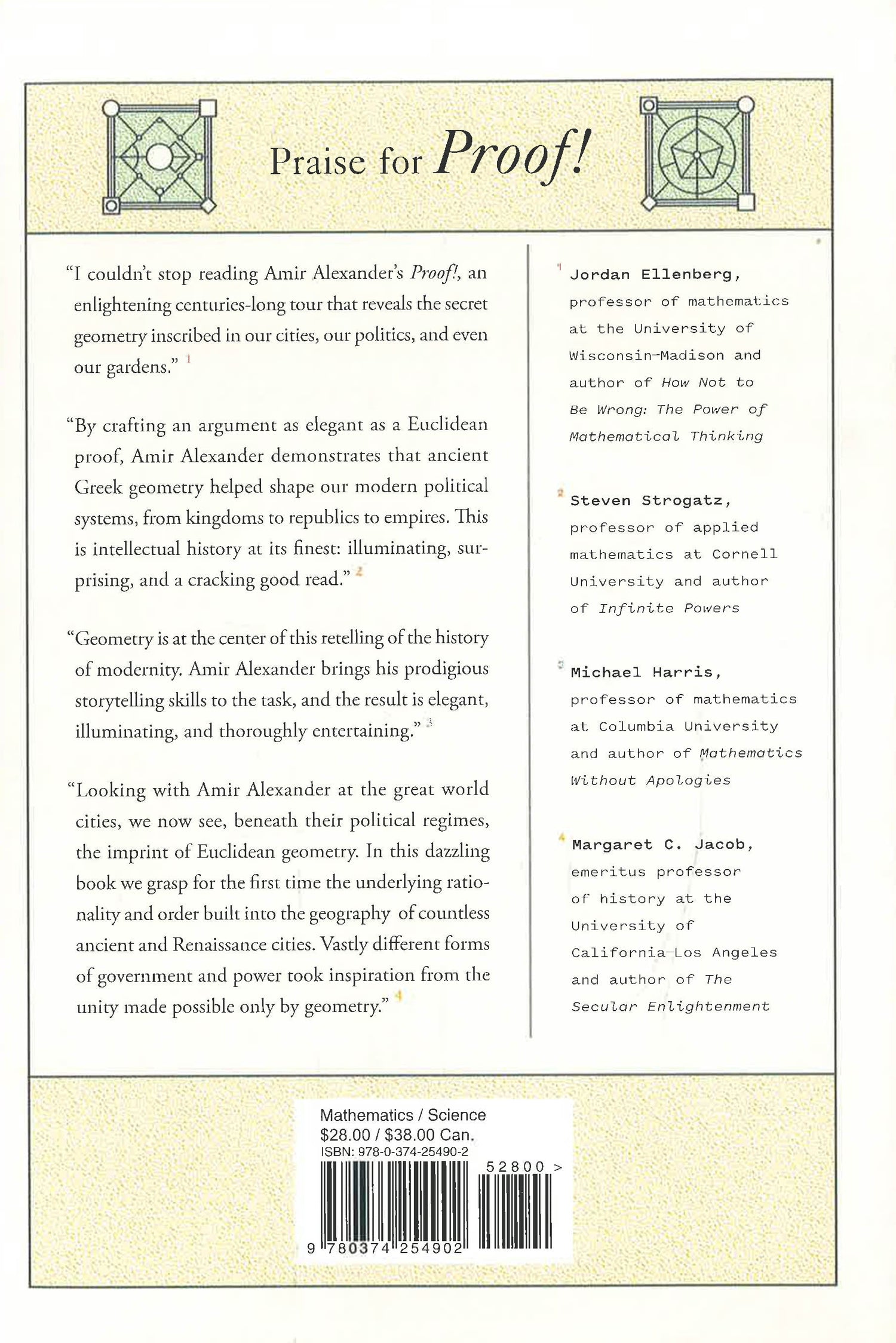 In Proof!, the award-winning historian Amir Alexander traces the path of the geometrical vision of the world as it coursed its way from the Renaissance to the present, shaping our societies, our politics, and our ideals. Geometry came to stand for a fixed and unchallengeable universal order, and kings, empire-builders, and even republican revolutionaries would rush to cast their rule as the apex of the geometrical universe. For who could doubt the right of a ruler or the legitimacy of a government that drew its power from the immutable principles of Euclidean geometry?