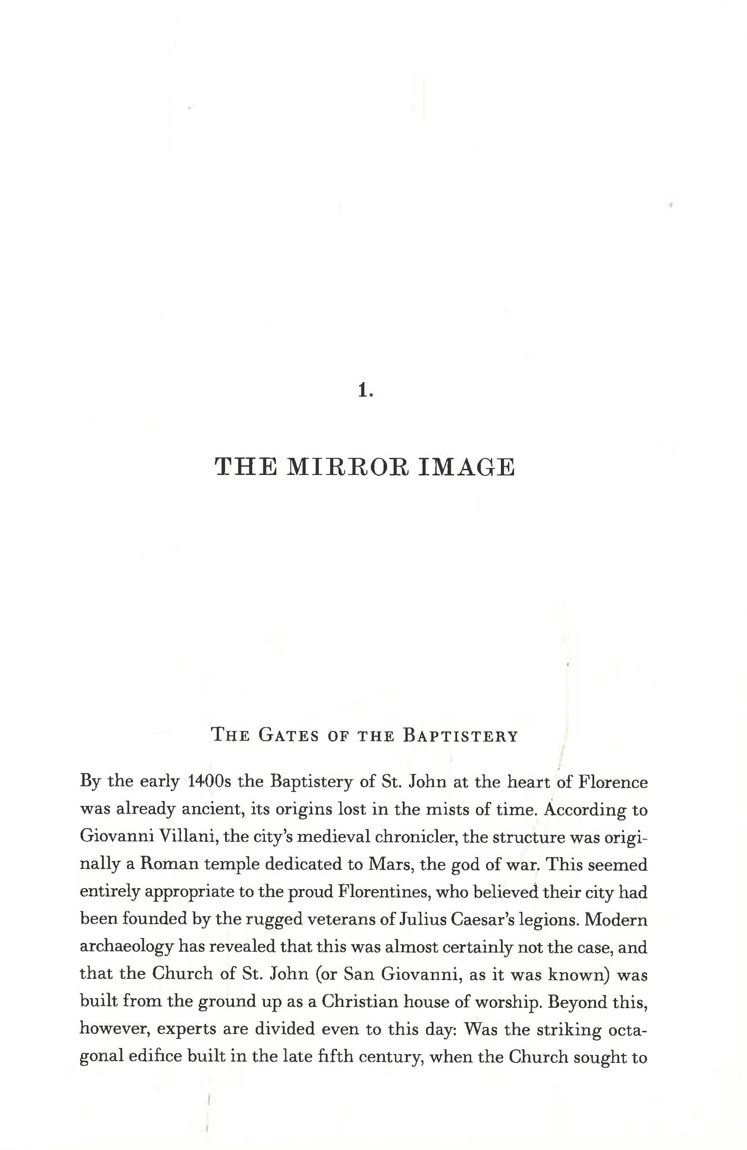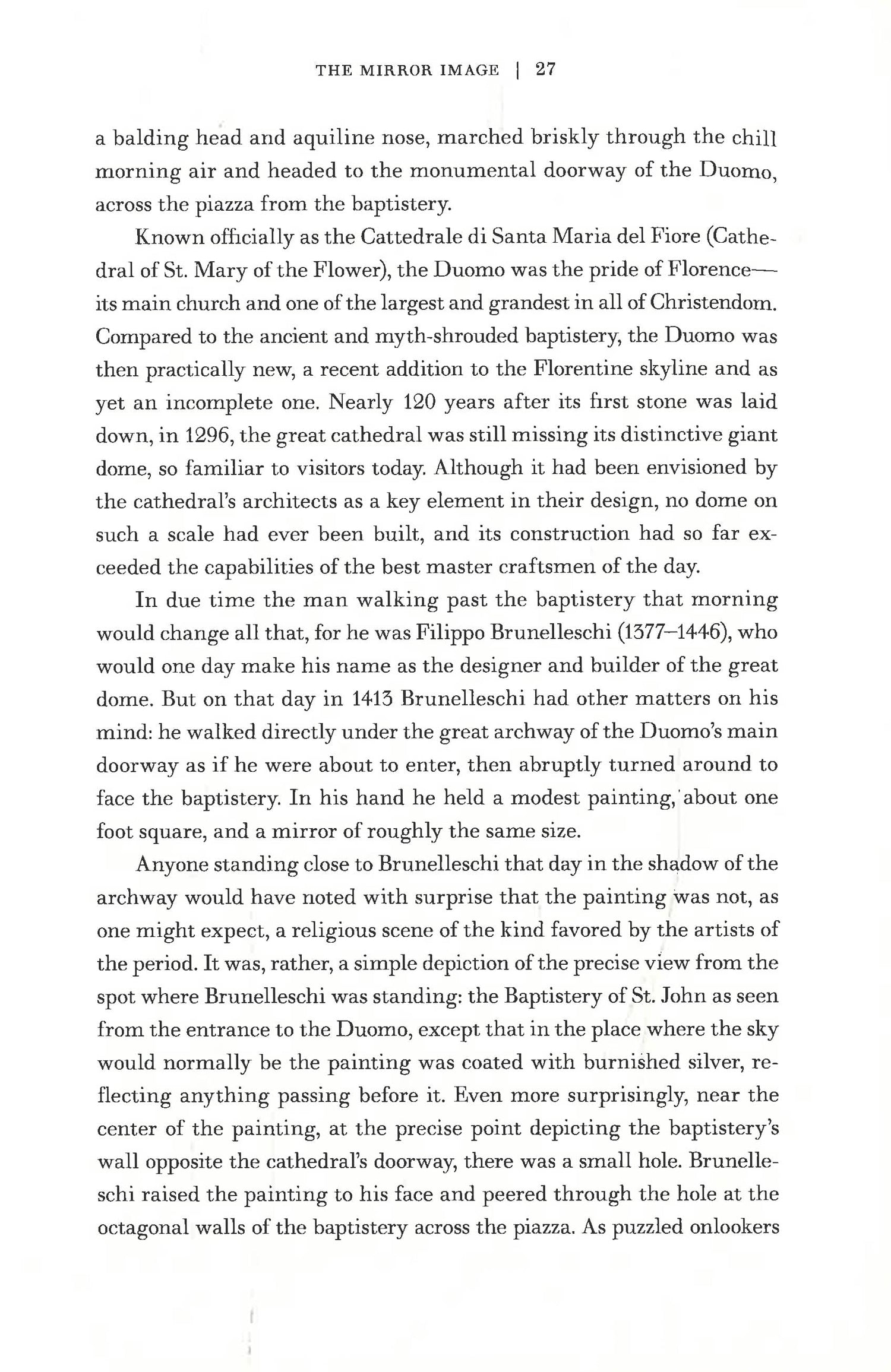 On a cloudy day in 1413, a balding young man stood at the entrance to the Cathedral of Florence, facing the ancient Baptistery across the piazza. As puzzled passers-by looked on, he raised a small painting to his face, then held a mirror in front of the painting. Few at the time understood what he was up to; even he barely had an inkling of what was at stake. But on that day, the master craftsman and engineer Filippo Brunelleschi would prove that the world and everything within it was governed by the ancient science of geometry.