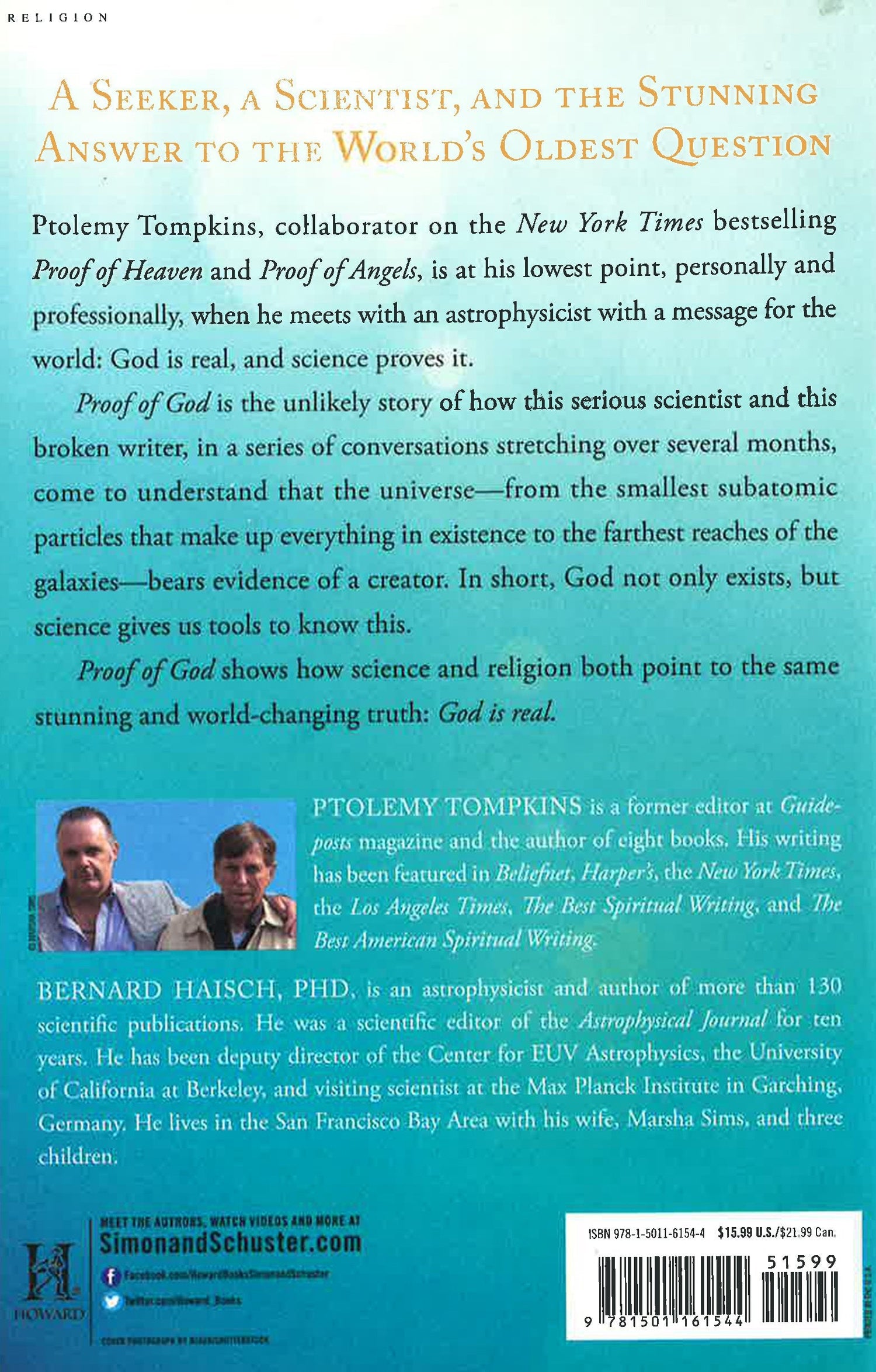 A Seeker, a Scientist, and the Stunning Answer to the World's Oldest Question. Ptolemy Tompkins, collaborator on the New York Times bestselling Proof of Heaven and Proof of Angels, is at his lowest point, personally and professionally, when he meets with an astrophysicist with a message for the world: God is real, and science proves it. Proof of God is the unlikely story of how this serious scientist and this broken writer, in a series of conversations stretching over several months, come to understand that the universe--from the smallest sub-atomic particles that make up everything in existence to the farthest reaches of the universe--bears evidence of a creator. In short, God not only exists, but science gives us tools to know this. Proof of God shows how science and religion both point to the same stunning and world-changing truth: God is real.