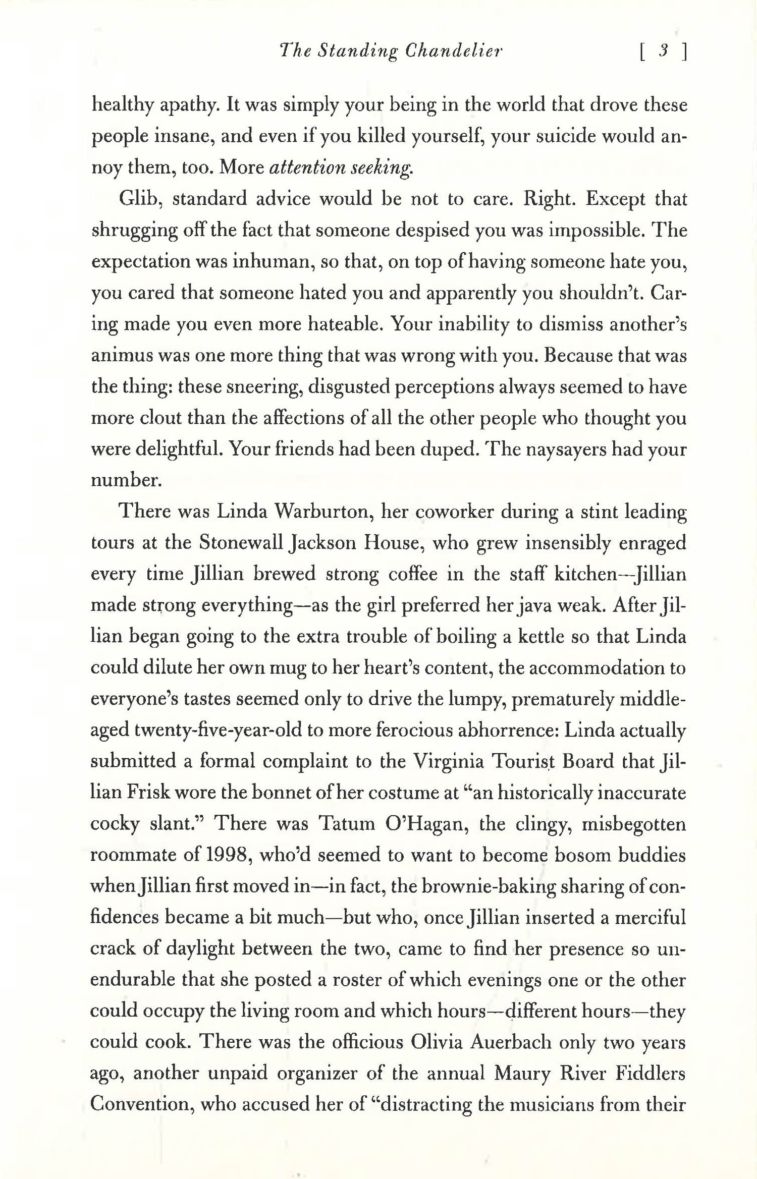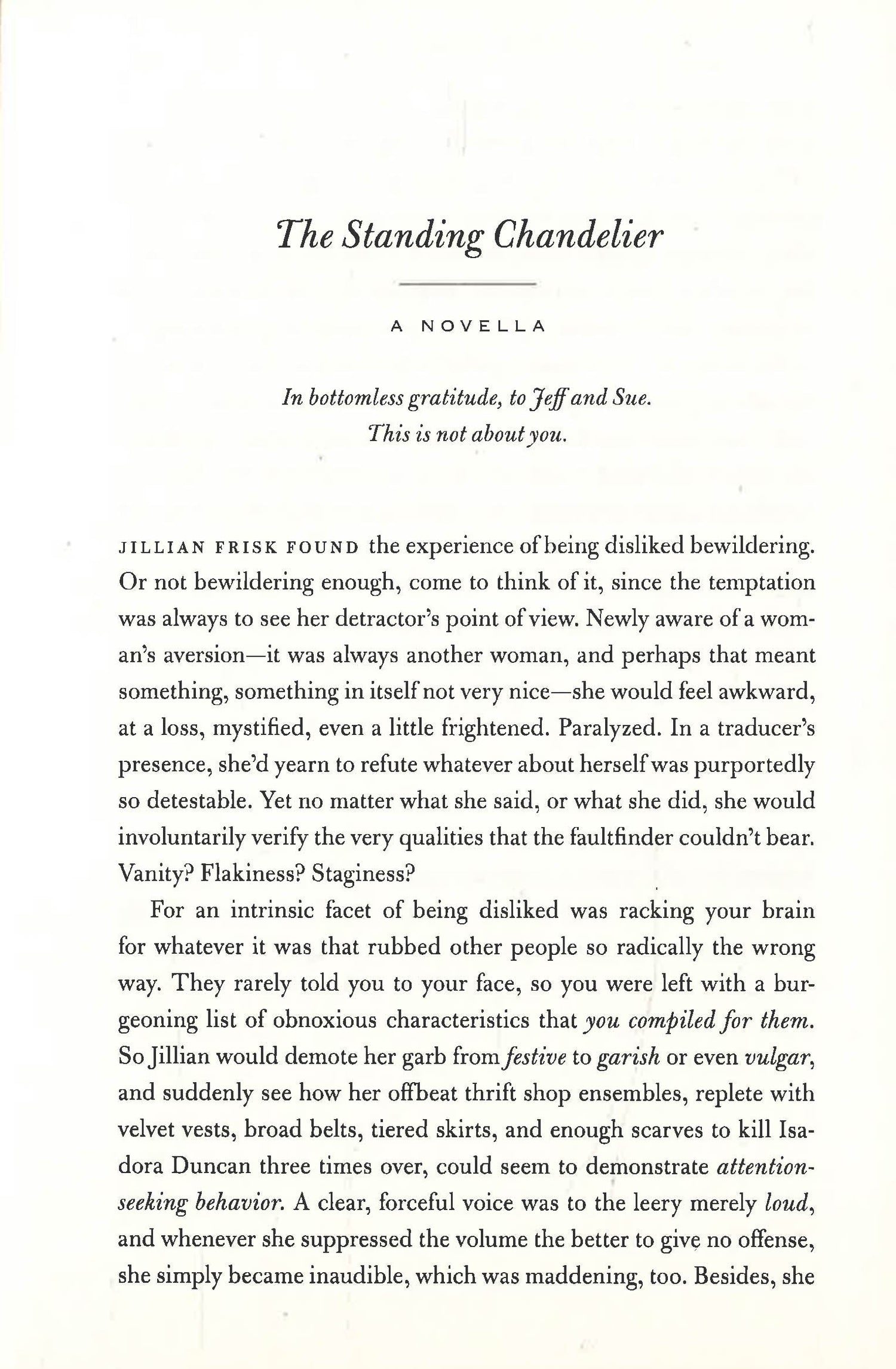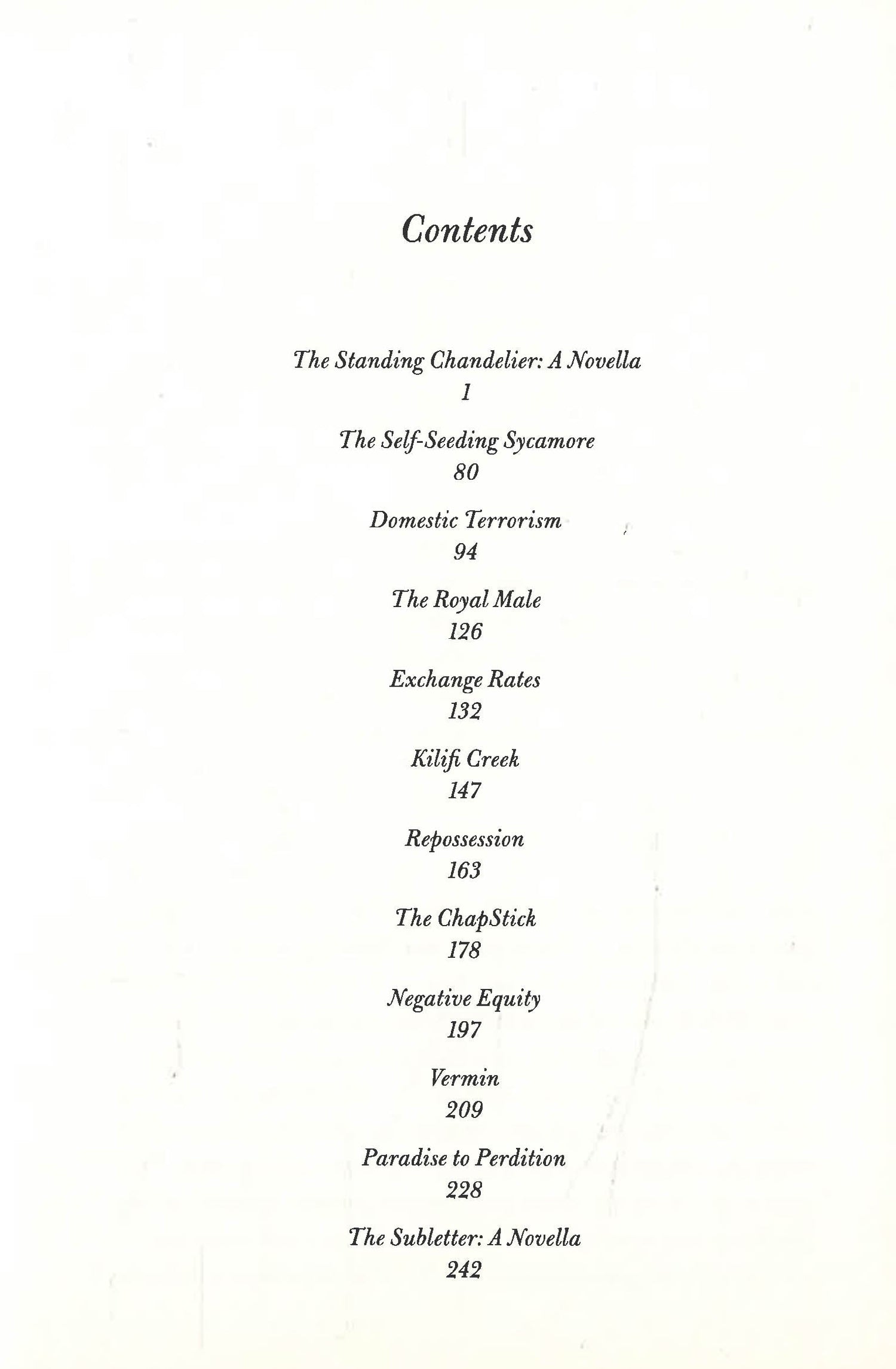 In the stunning novella "The Standing Chandelier," a woman with a history of attracting other women’s antagonism creates a deeply personal wedding present for her best friend and his fiancée—only to discover that the jealous fiancée wants to cut her out of their lives. In "Domestic Terrorism," a thirty-something son refuses to leave home, resulting in a standoff that renders him a millennial cause célèbre. In "The ChapStick," a middle-aged man subjugated by service to his elderly father discovers that the last place you should finally assert yourself is airport security. In "Vermin," an artistic Brooklyn couple’s purchase of a ramshackle house destroys their once-passionate relationship. In "The Subletter," two women, both foreign conflict junkies, fight over a claim to a territory that doesn’t belong to either.