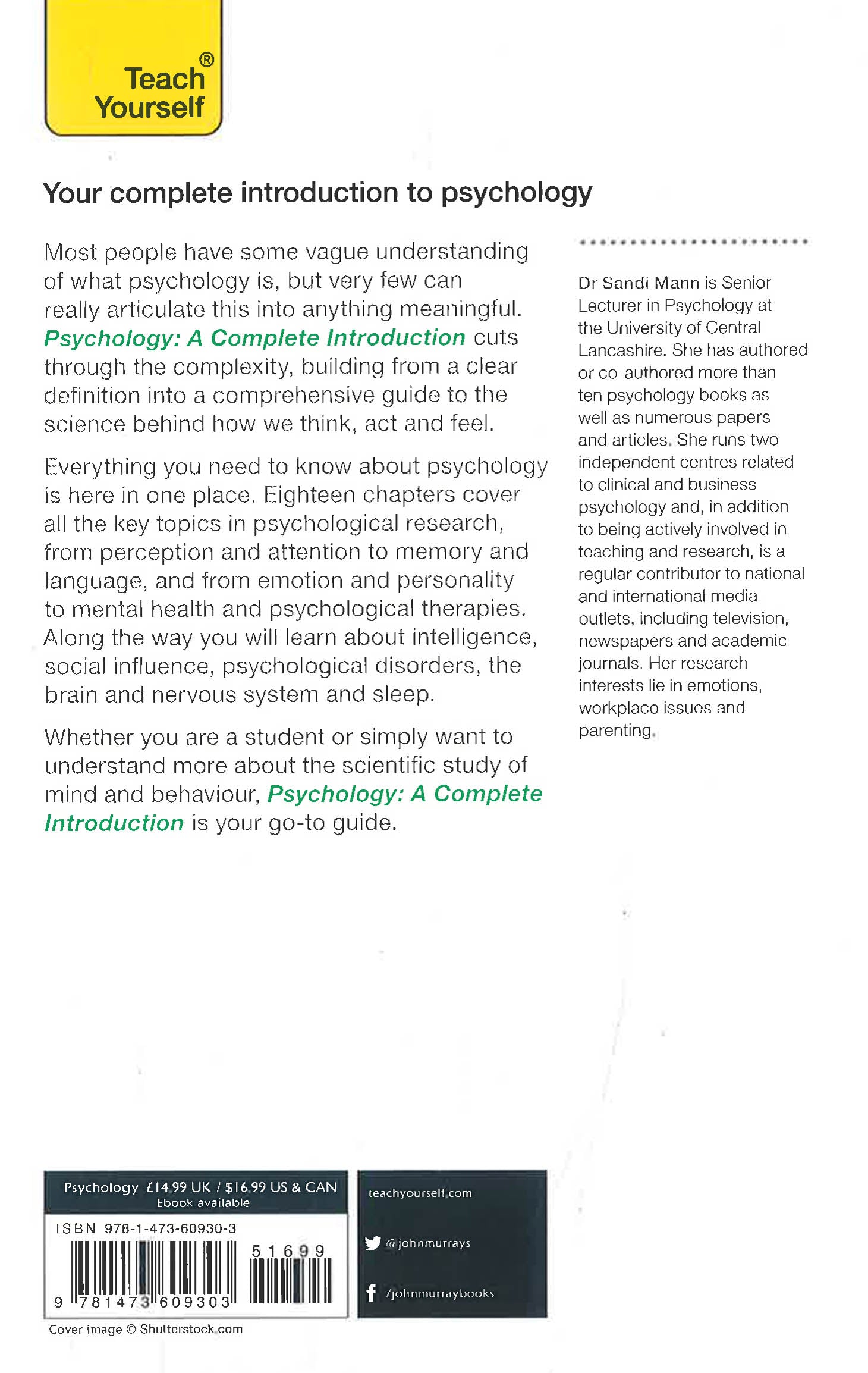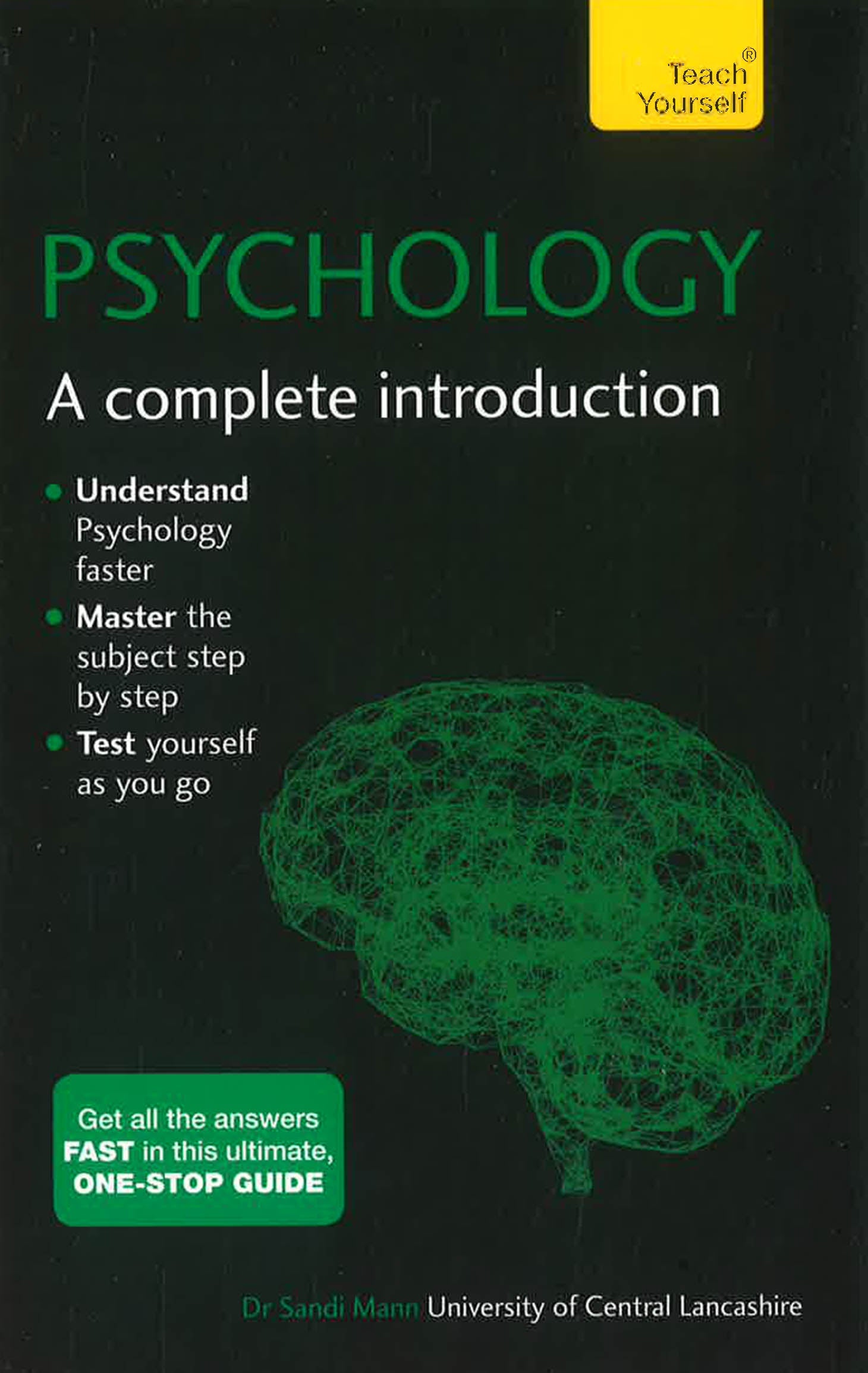 "The masterclass for the faster pass" - written by a leading expert and practising university teacher, this book gives you all the key knowledge and information you need to succeed quickly and easily. Written by Dr Sandi Mann, Senior Lecturer at the University of Central Lancashire, Psychology: A Complete Introduction is designed to give you everything you need to succeed, all in one place. It covers the key areas that students are expected to be confident in, outlining the basics in clear jargon-free English, and then providing added-value features like summaries of key experiments, and even lists of questions you might be asked in your seminar or exam.The book uses a structure that mirrors the way Psychology is taught on many university courses. Chapters include key topics in psychology research; cognitive issues, including language, emotion, memory and perception; individual differences - intelligence, personality and gender; social psychology; mental health and psychological disorders/abnormal psychology and the treatment of such; the nervous system; and sleep.