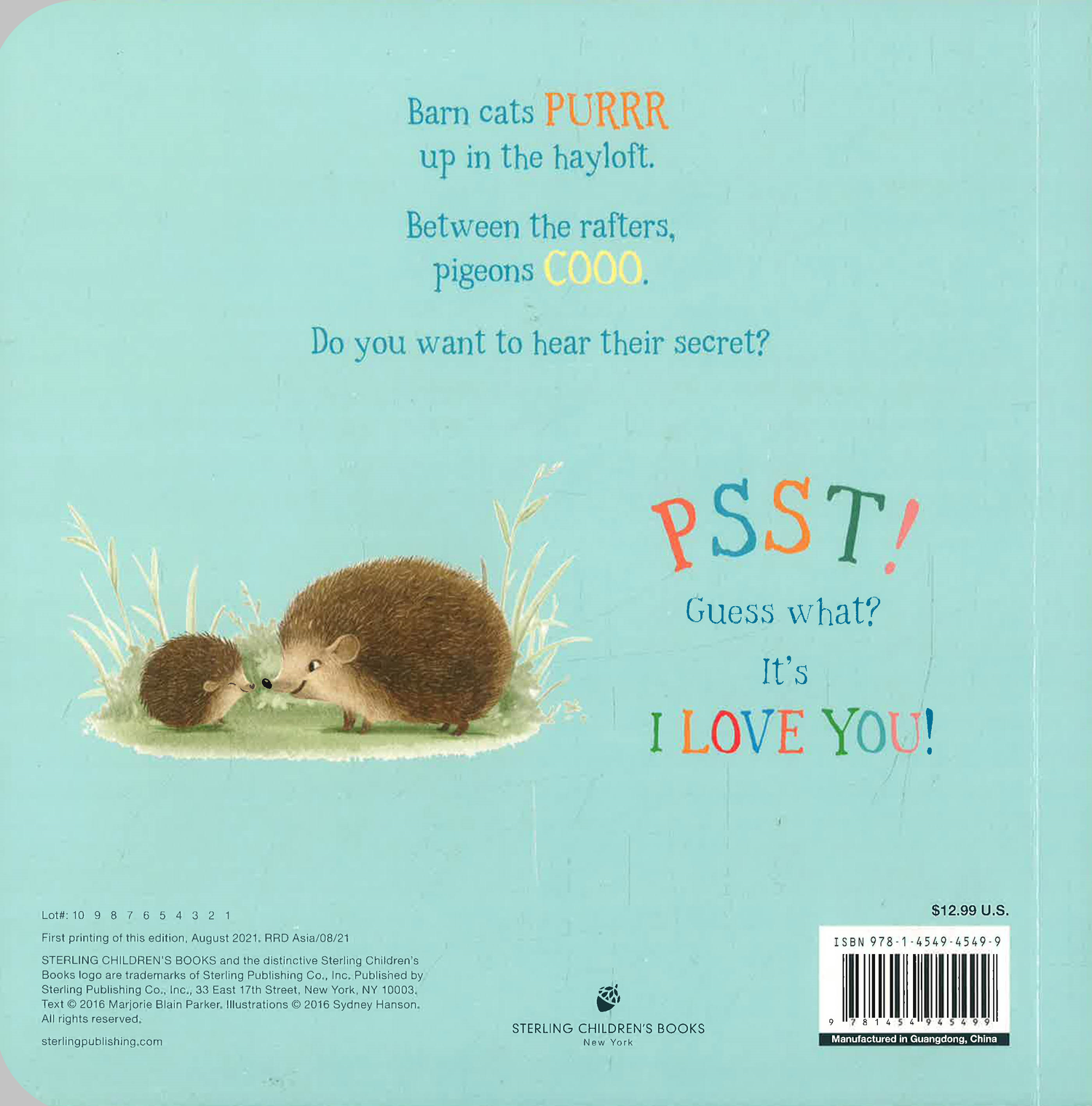 This sweet addition to our successful Snuggle Time Stories series celebrates the love between parents and children of every species. In lilting rhyme, the book introduces toddlers to an array of super-adorable animal parents and babies - including cows, horses, sheep, cats, owls, ducks, roosters, and, of course humans. What do they all say to each other? I LOVE YOU! This is the perfect read-aloud and goodnight story.