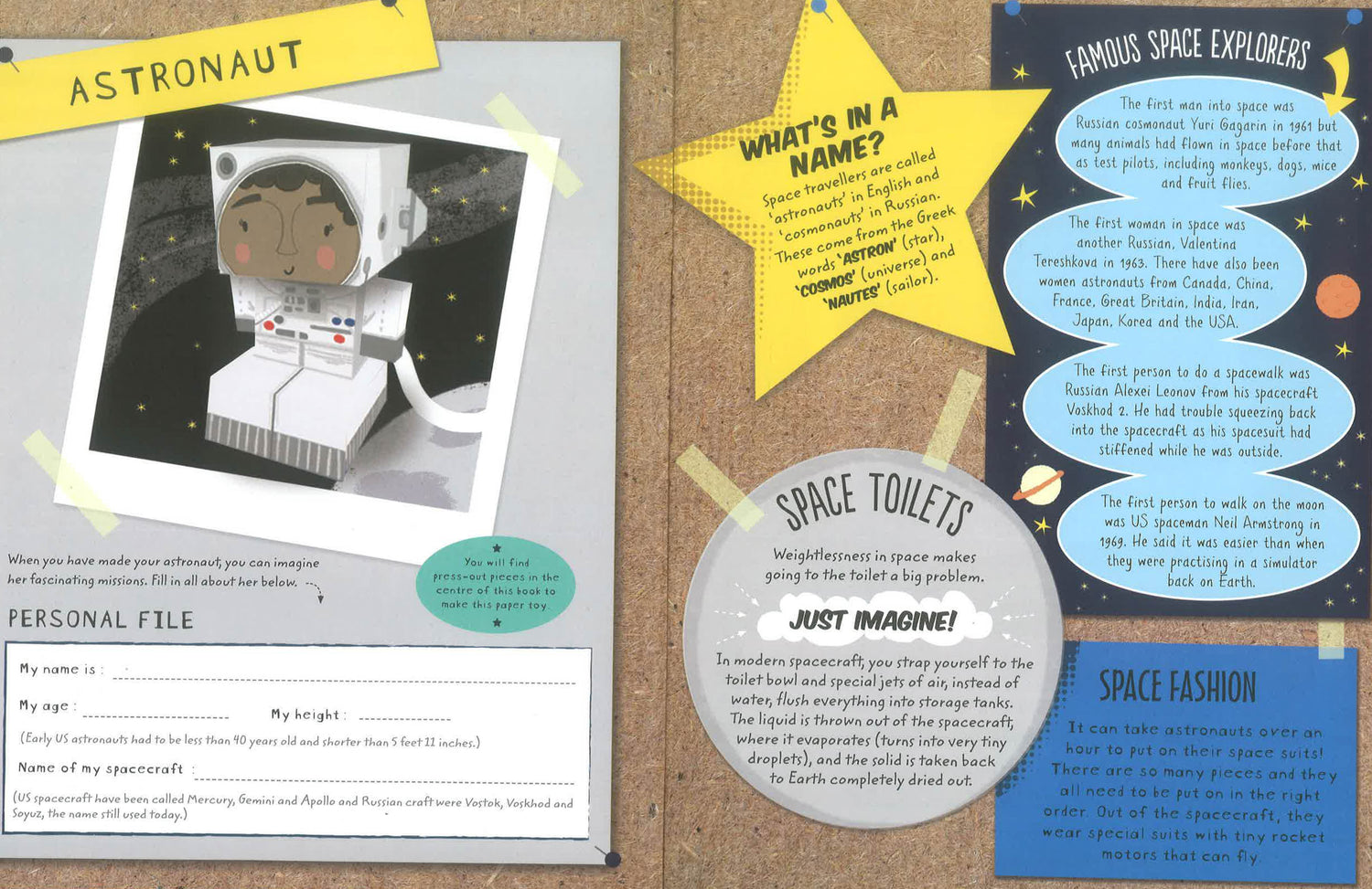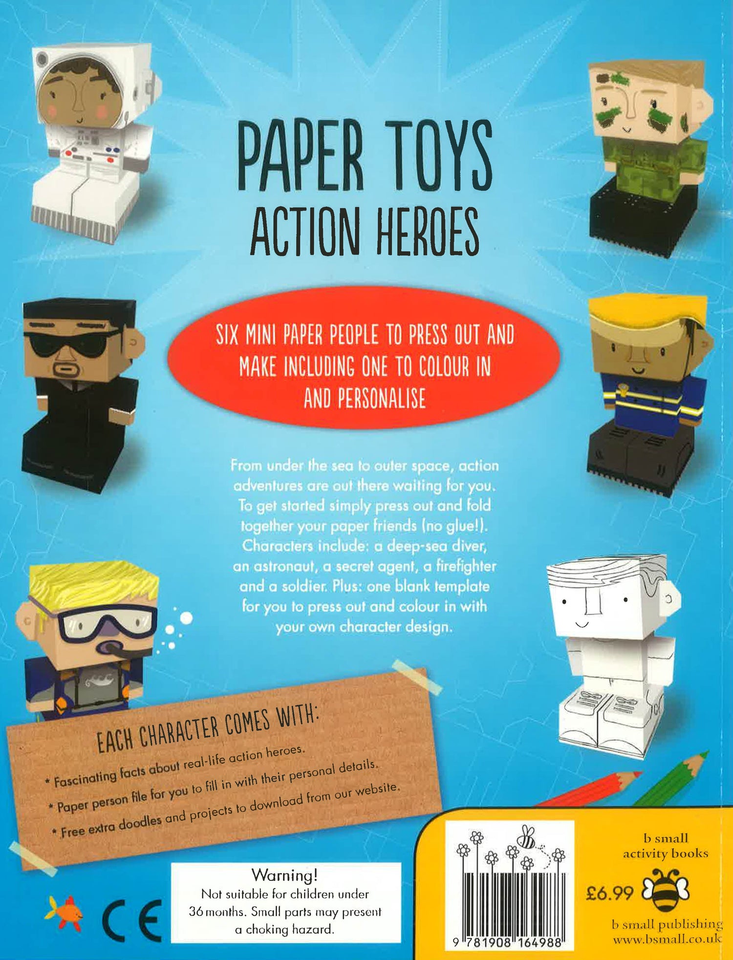 From under the sea to outer space, these action heroes are ready and waiting for their first adventure. To get started, simply press out and fold together the paper friends (no glue!). Each character also comes with fascinating facts about real-life superstars, a personal file for their details and some doodle projects to download from our website. Characters include: A deep sea diver, an astronaut, a secret agent, a fire fighter and a soldier plus one blank template for you to press out and colour in with your own character design.