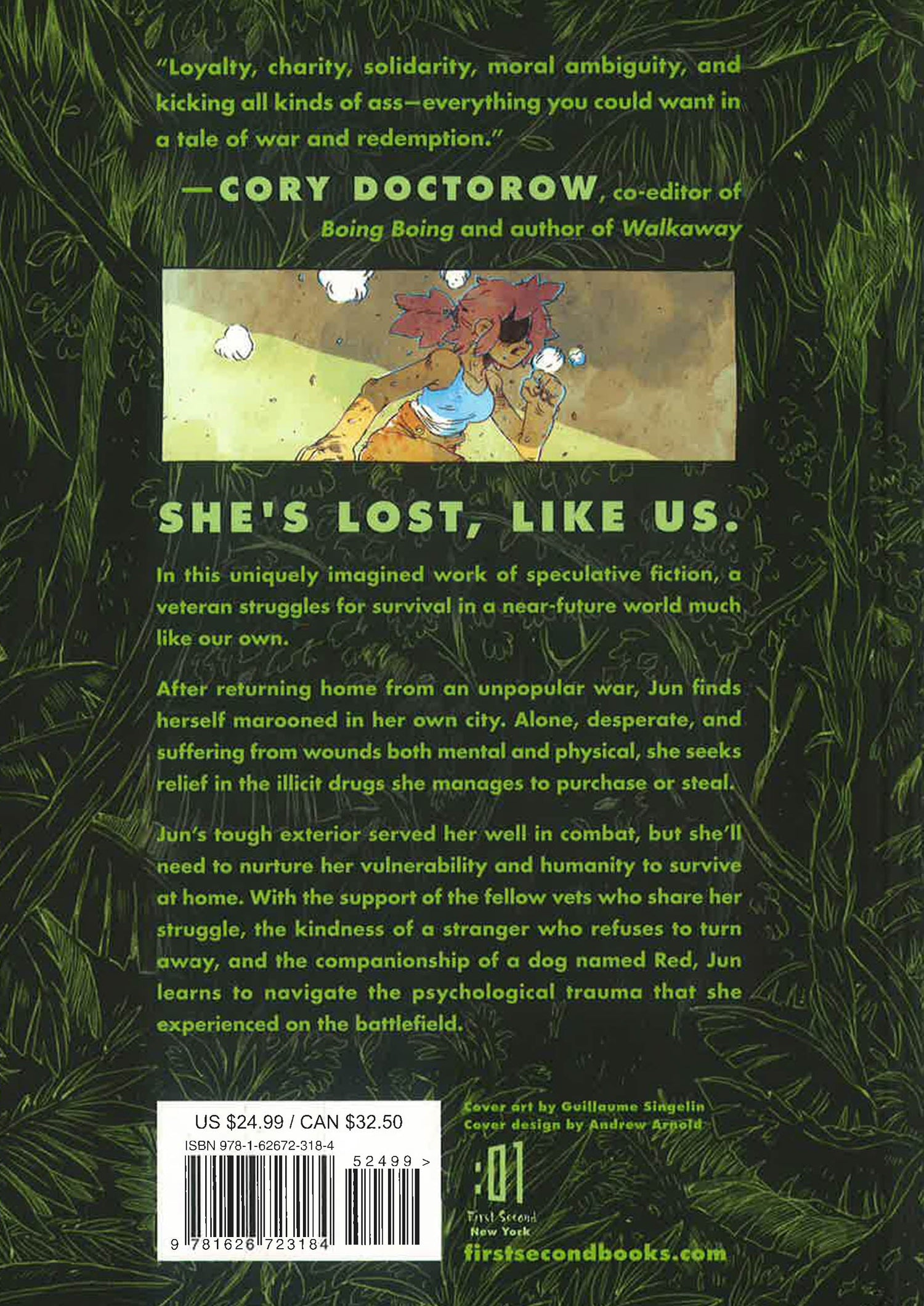 After returning home from an unpopular war, Jun becomes an outsider in an indifferent world. Alone, desperate, and suffering from wounds both mental and physical, she seeks relief in the illicit drugs she manages to purchase or steal. Jun’s tough exterior served her well in combat, but she’ll need to nurture her vulnerability and humanity to survive at home. With the support of her fellow vets, the kindness of a stranger who refuses to turn away, and the companionship of a dog named Red, Jun learns to navigate the psychological trauma that she experienced in the war.