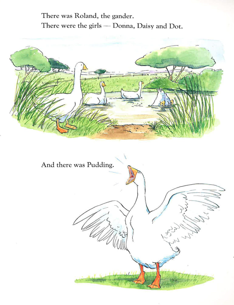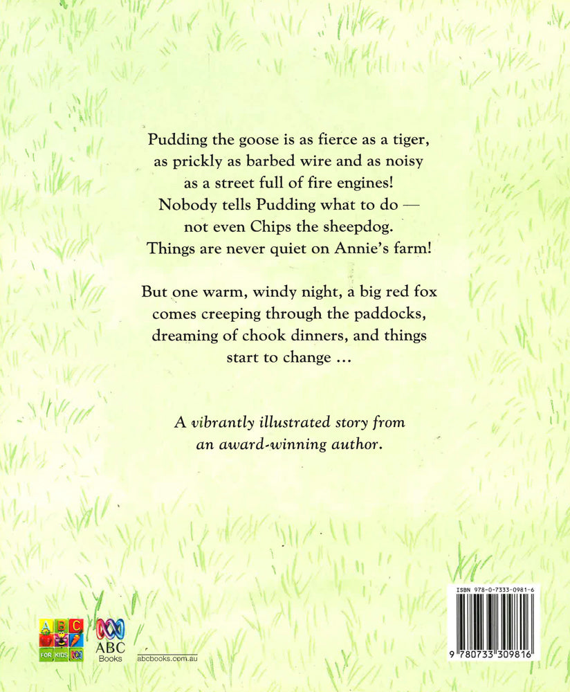 When, on warm, windy nights a big red fox starts to come creeping through the paddocks, things change on the farm. Pudding changes too, all the honk seems to have gone out of her. then one night, just like the other geese, Donna and Dot, she just disappears.