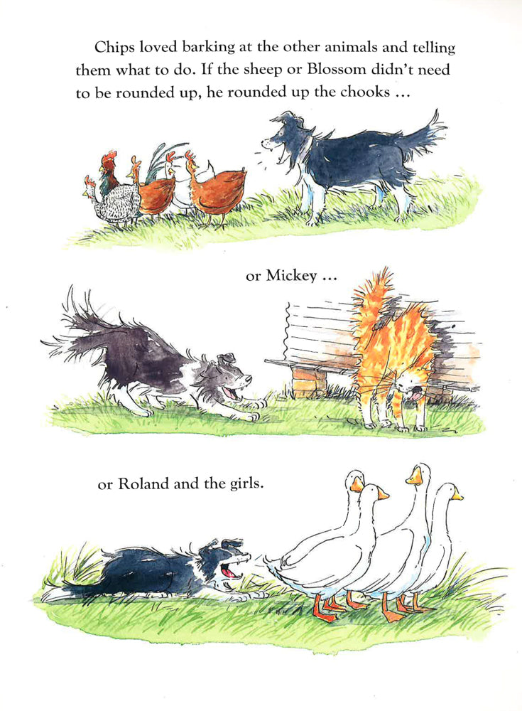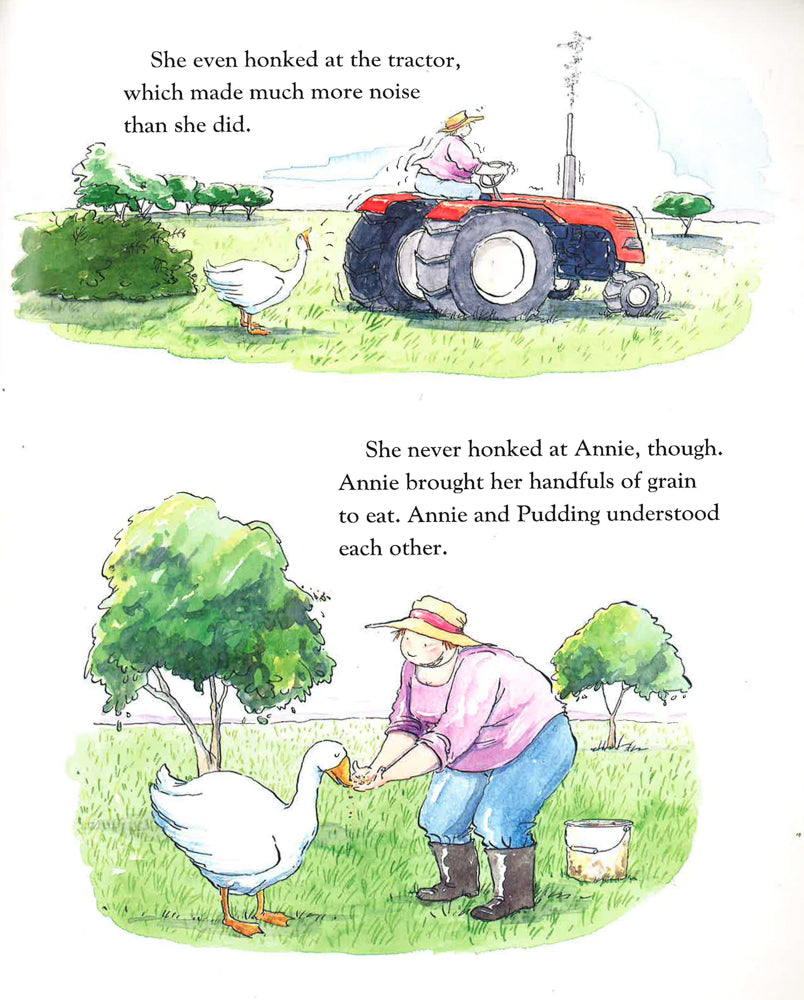 Pudding the goose is as fierce as a tiger, as prickly as barbed wire and as noisy as a street full of fire engines! the only animal on the farm who isn't afraid of Pudding is the sheepdog, Chips. they live in a constant state of humorous conflict and harmony on the farm with Old Annie and all the other animals.