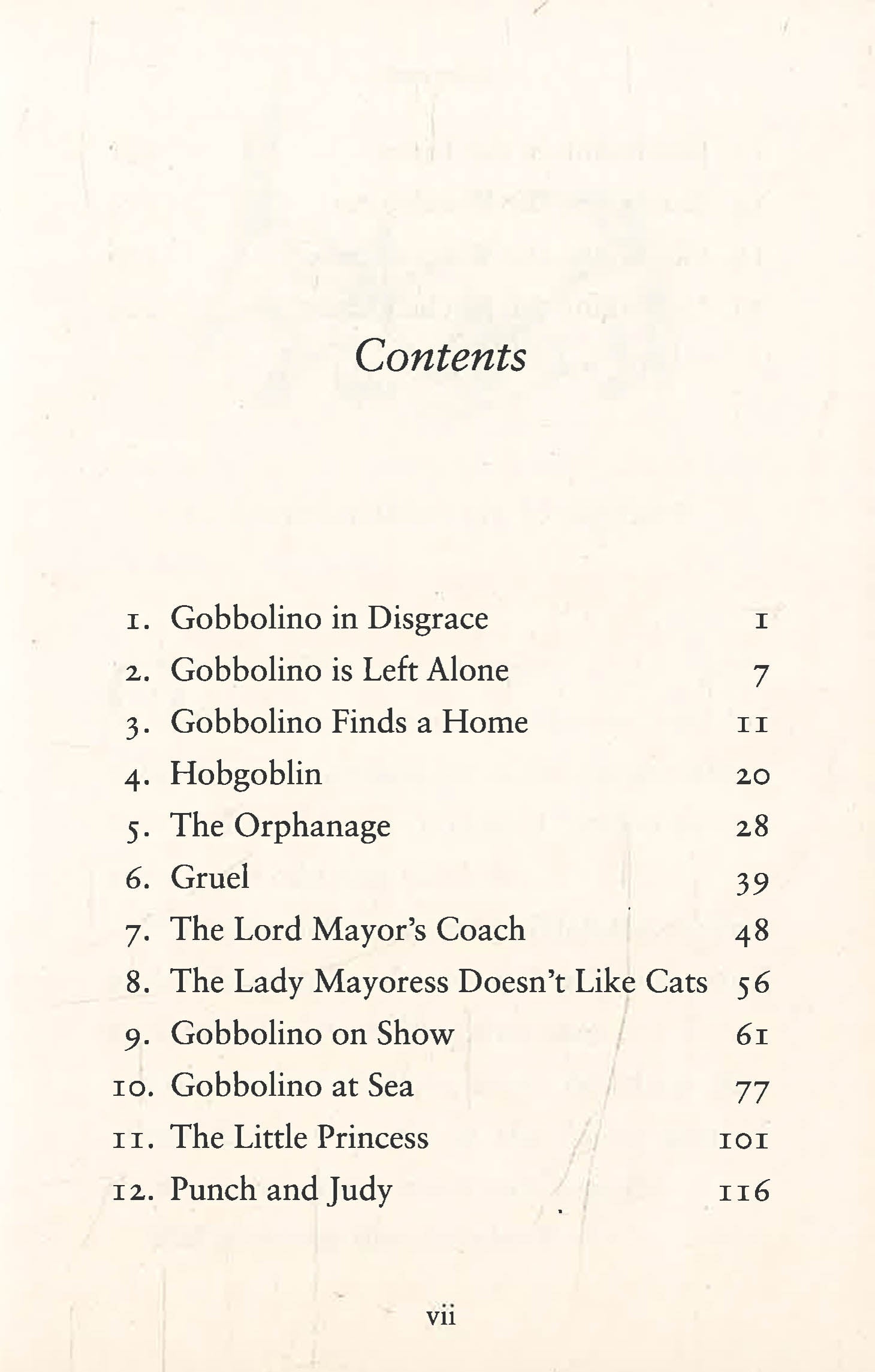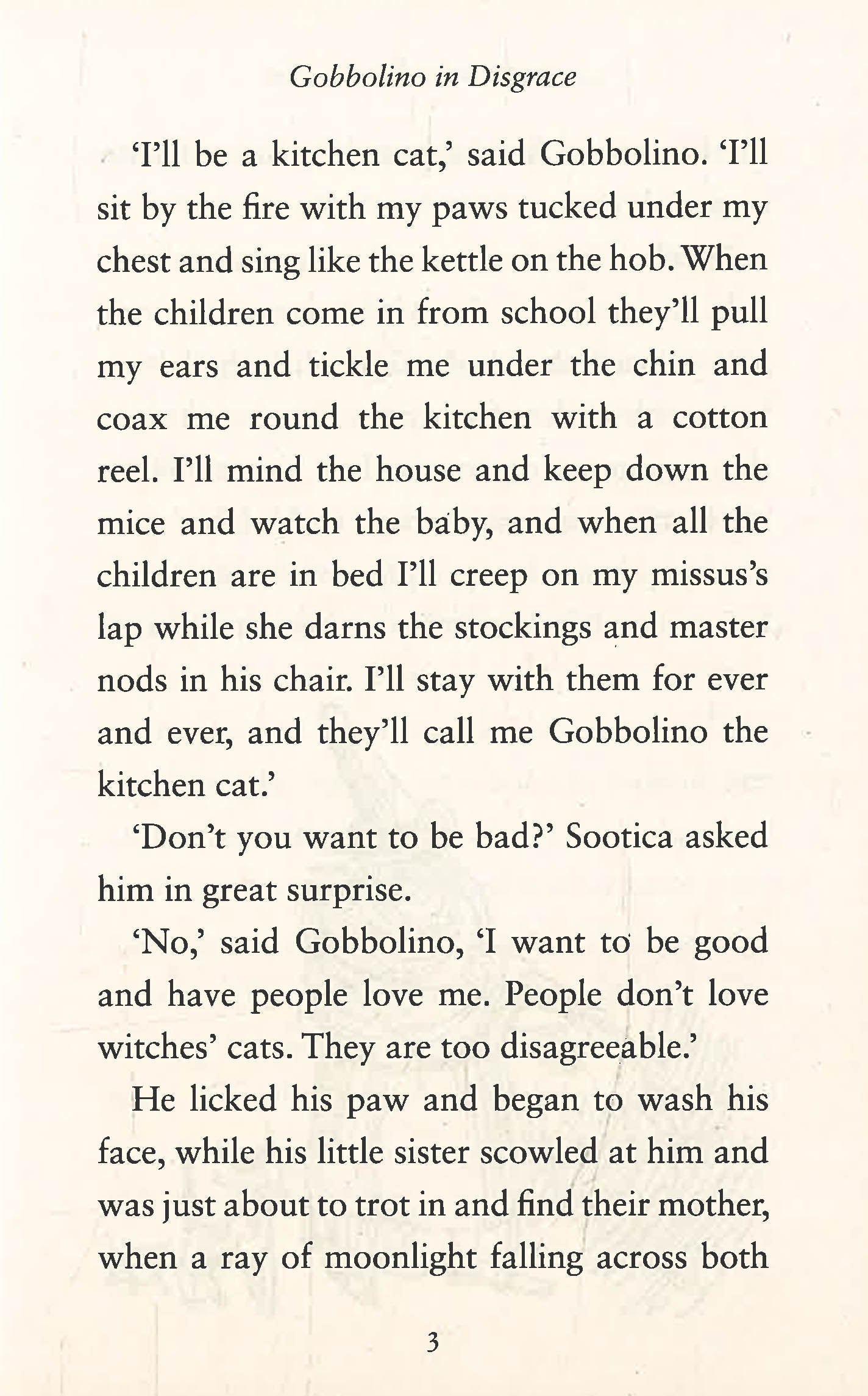 Gobbolino, the witch's cat with one white paw and bright blue eyes, would rather be a quiet cat who sits by the kitchen fireside all day. So he sets out on a journey to find a new home, but when people discover he is a witch's cat he is blamed for mysterious happenings, such as the farmer's milk turning sour and the orphanage children's gruel turning into chocolate. Will Gobbolino ever find the loving, trusting home of his dreams?
