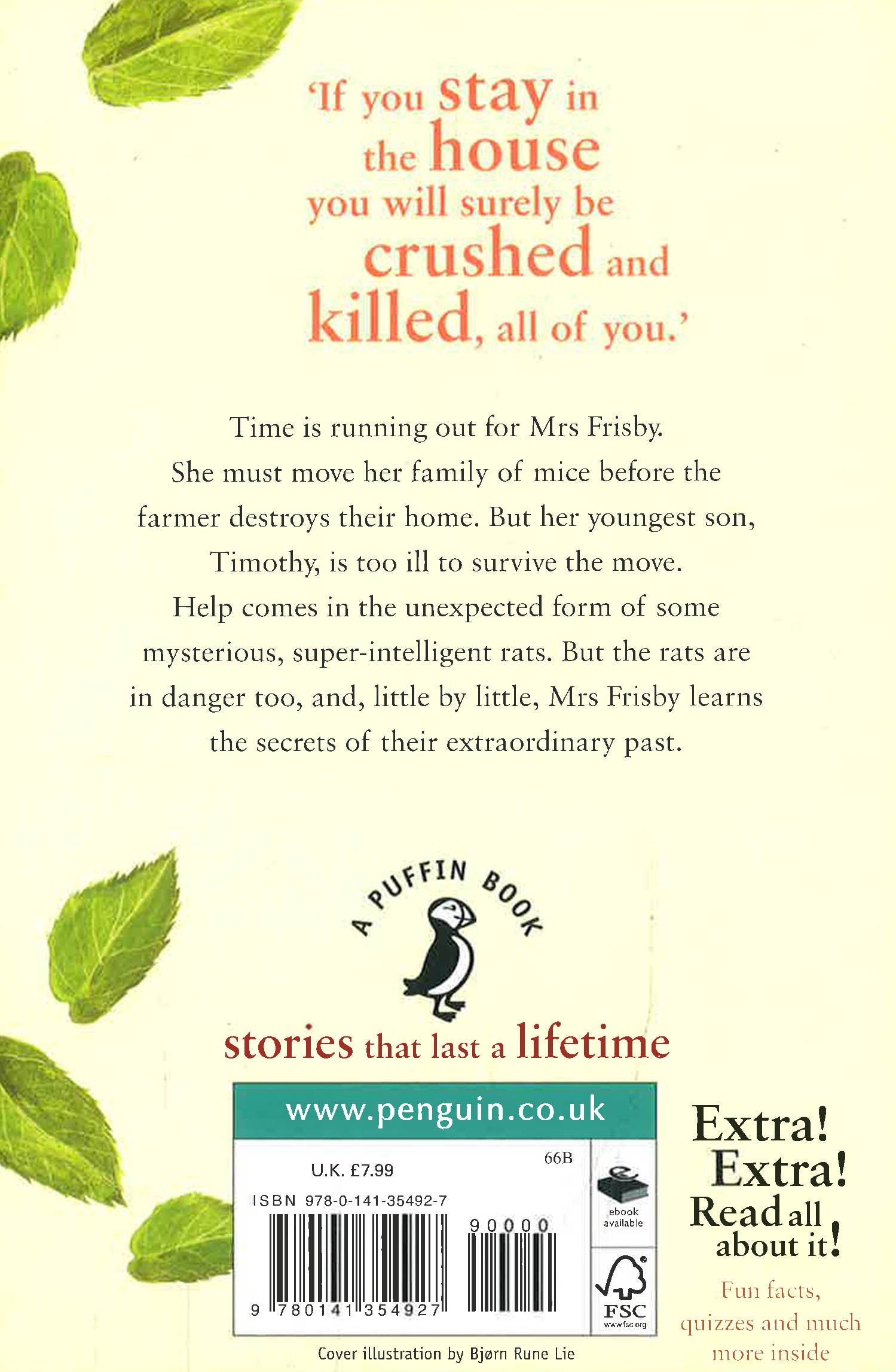 Help comes in the unexpected form of a highly extraordinary breed of super-intelligent rats. The rats of NIMH come up with a brilliant solution to Mrs Frisby's problem but the rats are in danger too, and little by little Mrs Frisby discovers their extraordinary past . . .