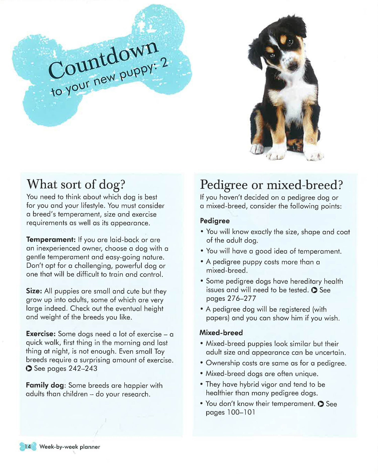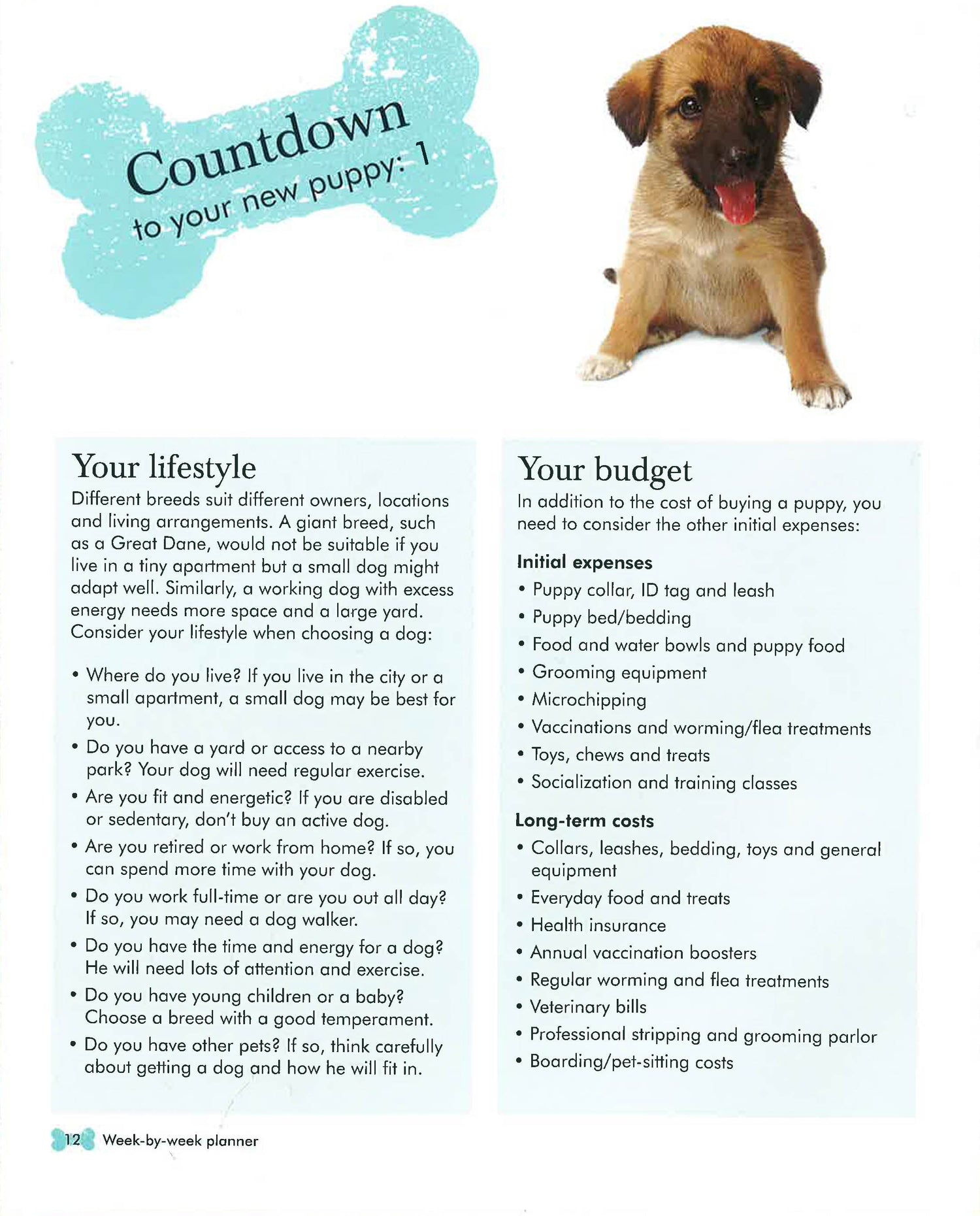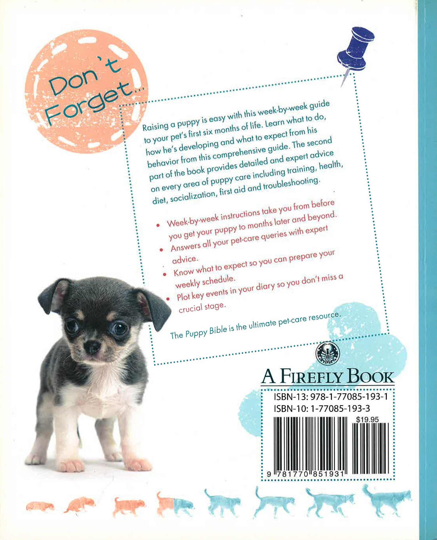 An owner's guide to giving a puppy a successful start to life. Puppy Bible is uniquely designed to guide new puppy owners on a week-by-week basis from the all-important planning and decision stages, up to those exciting first days at home, through the first six months of a puppy's life and beyond. The book is divided into two parts. First, a clearly illustrated, week-by-week planner that educates the owner about a number of important topics, including: The puppy's physical and mental development What the owner should do at every stage of the puppy's growth Newborn: 8-week countdown to puppy's arrival Toddler: weeks 9 to 12 Juvenile: weeks 13 to 18 Adolescent: weeks 19 to 24 Six months and beyond Common problems that may occur. The information in part one is cross-referenced to part two of the book, a comprehensive encyclopedia covering all areas of puppy care with detailed expert advice on a wide number of topics, such as: House training General care and grooming Health Breed-specific considerations Behavior Socialization Obedience training Diet Socialization and troubleshooting Canine first aid. When it comes to puppies, it's important to do it right from the very first day. What happens in the first sixteen weeks of its life sets the tone for the rest of the dog's life. While Puppy Bible is designed primarily for those first 16 weeks, it will be useful at any stage of the dog's life: training needs occasional reinforcement, general care and grooming are always important, and a source of first aid care is essential.