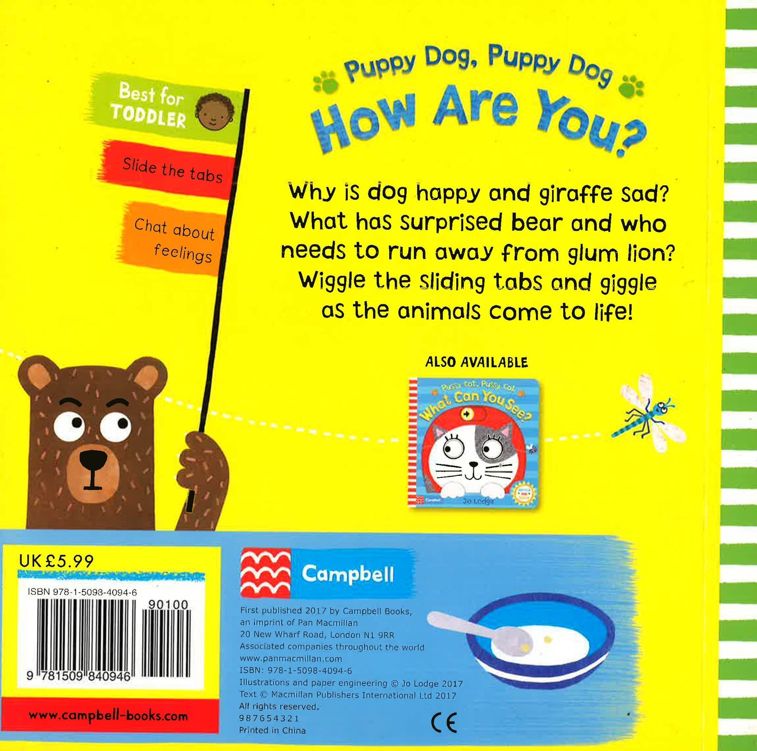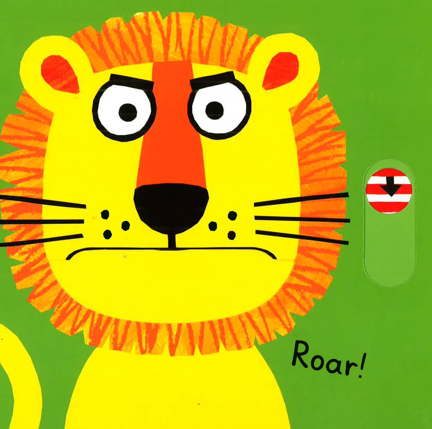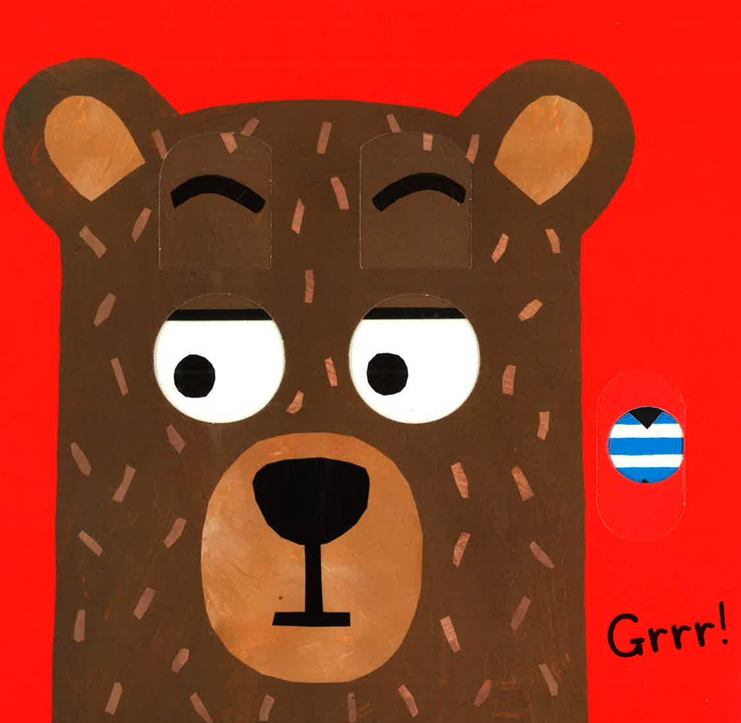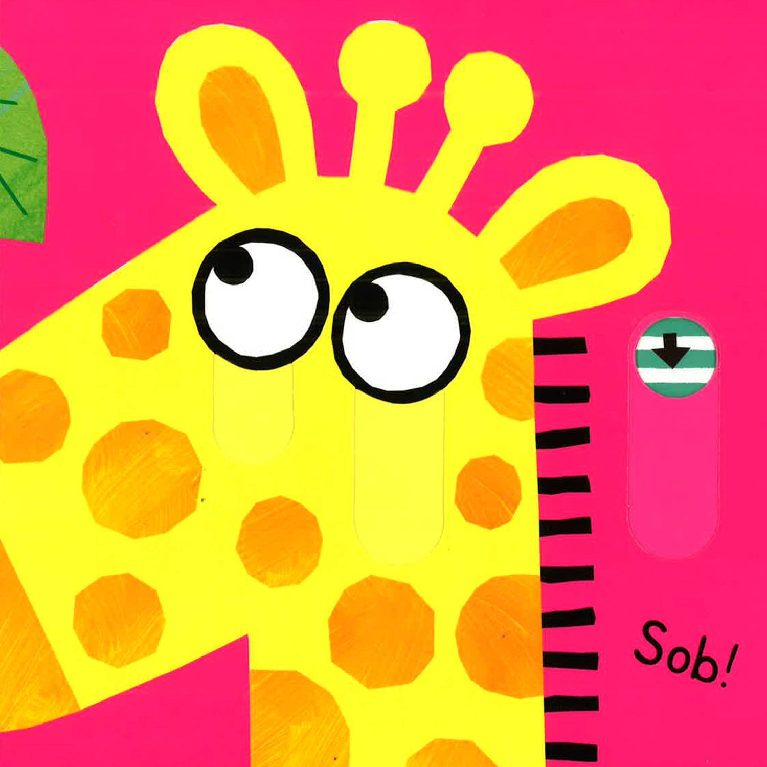 Why is dog happy and giraffe sad? What has surprised bear and who needs to run away from glum lion? Wiggle the sliding tabs and giggle as the animals come to life!