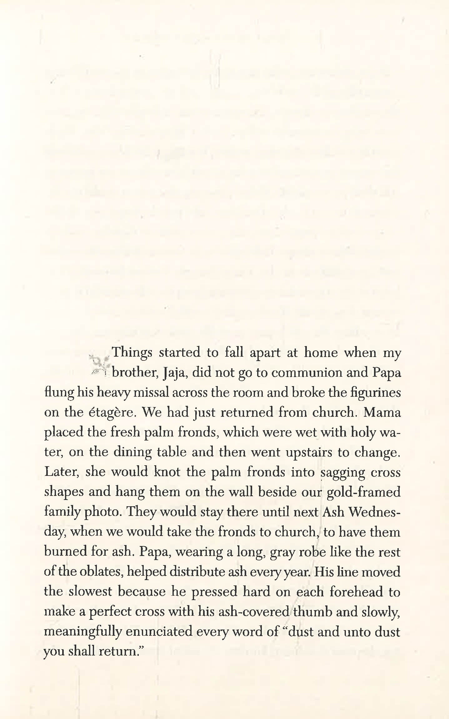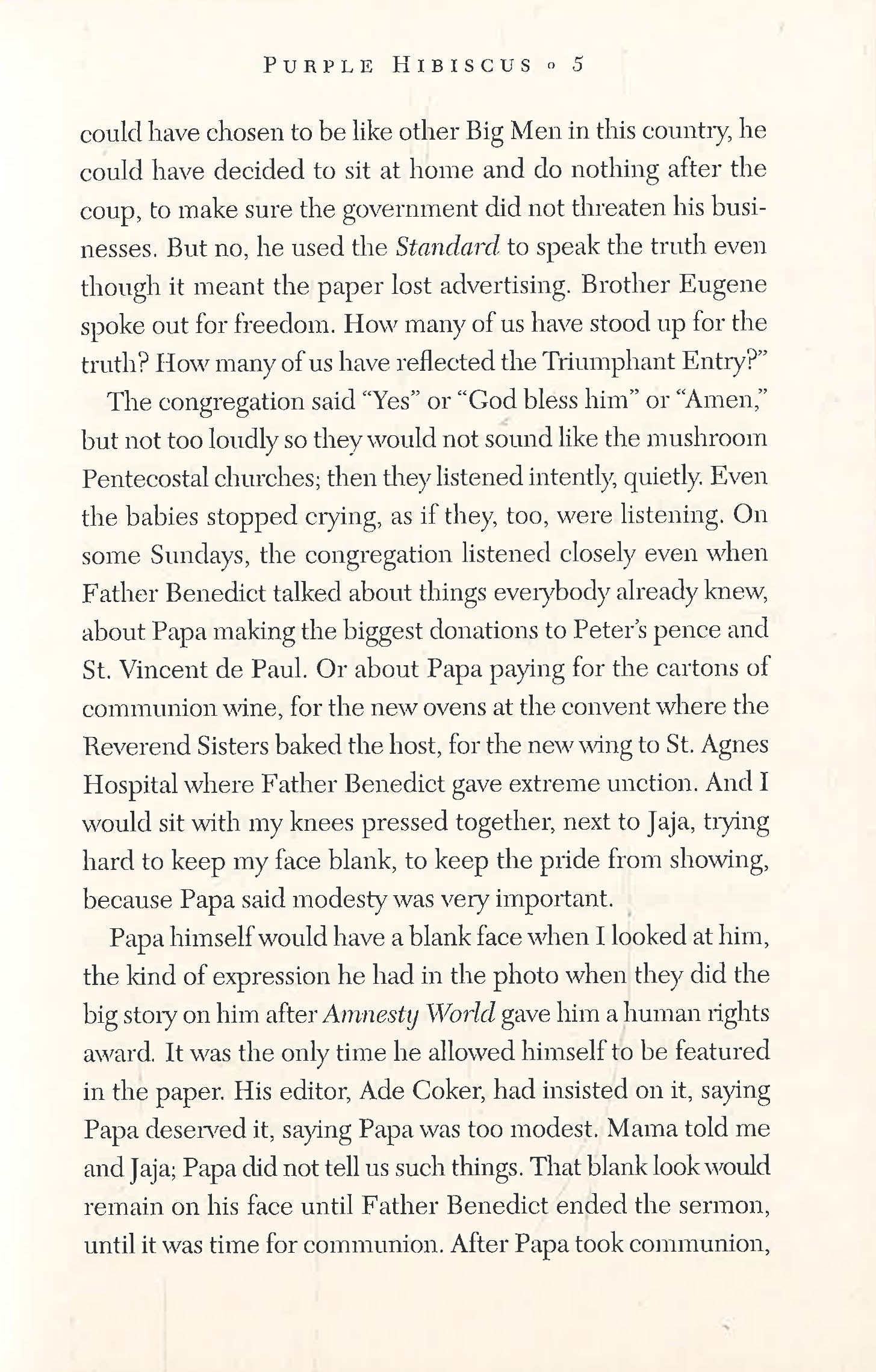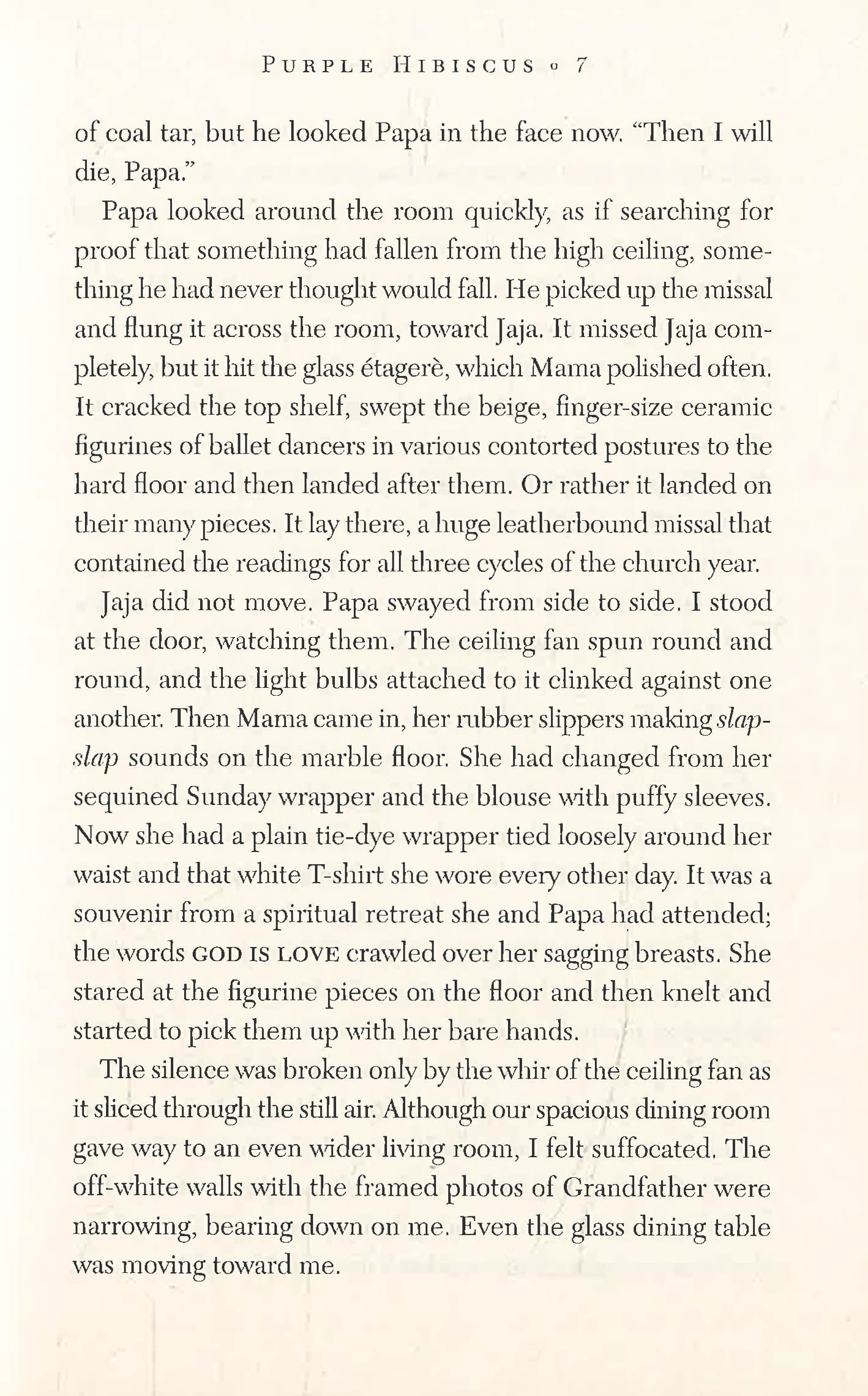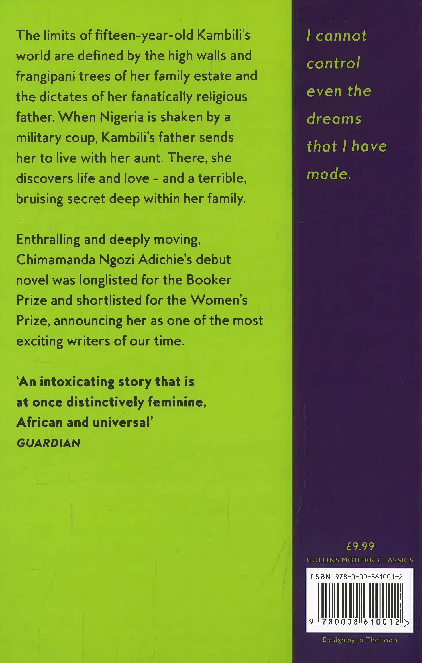 Fifteen-year-old Kambili's world is circumscribed by the high walls of her family compound and the frangipani trees she can see from her bedroom window. Her wealthy Catholic father, although generous and well-respected in the community, is repressive and fanatically religious at home. Her life is lived under his shadow and regulated by schedules: prayer, sleep, study, and more prayer. She lives in fear of his violence and the words in her textbooks begin to turn to blood in front of her eyes.