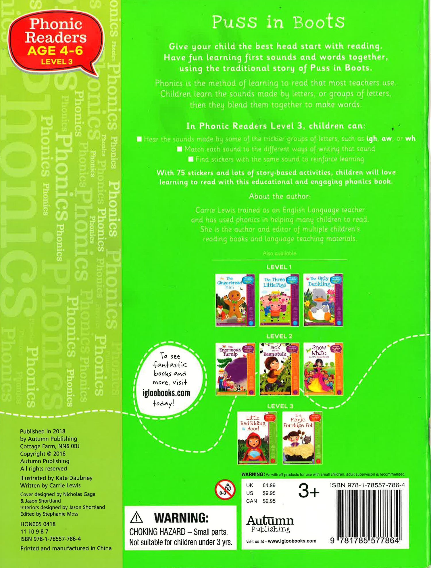 Give your child the best head start with reading. Have fun learning first sounds and words together, using the traditional story of Puss in Boots. Phonics is the method of learning to read that most teachers use. Children learn the sounds made by letters, or group of letters, then they blend them together to make words. With 75 stickers and lots of story-based activities children will love learning to read with this educational and engaging phonics book.