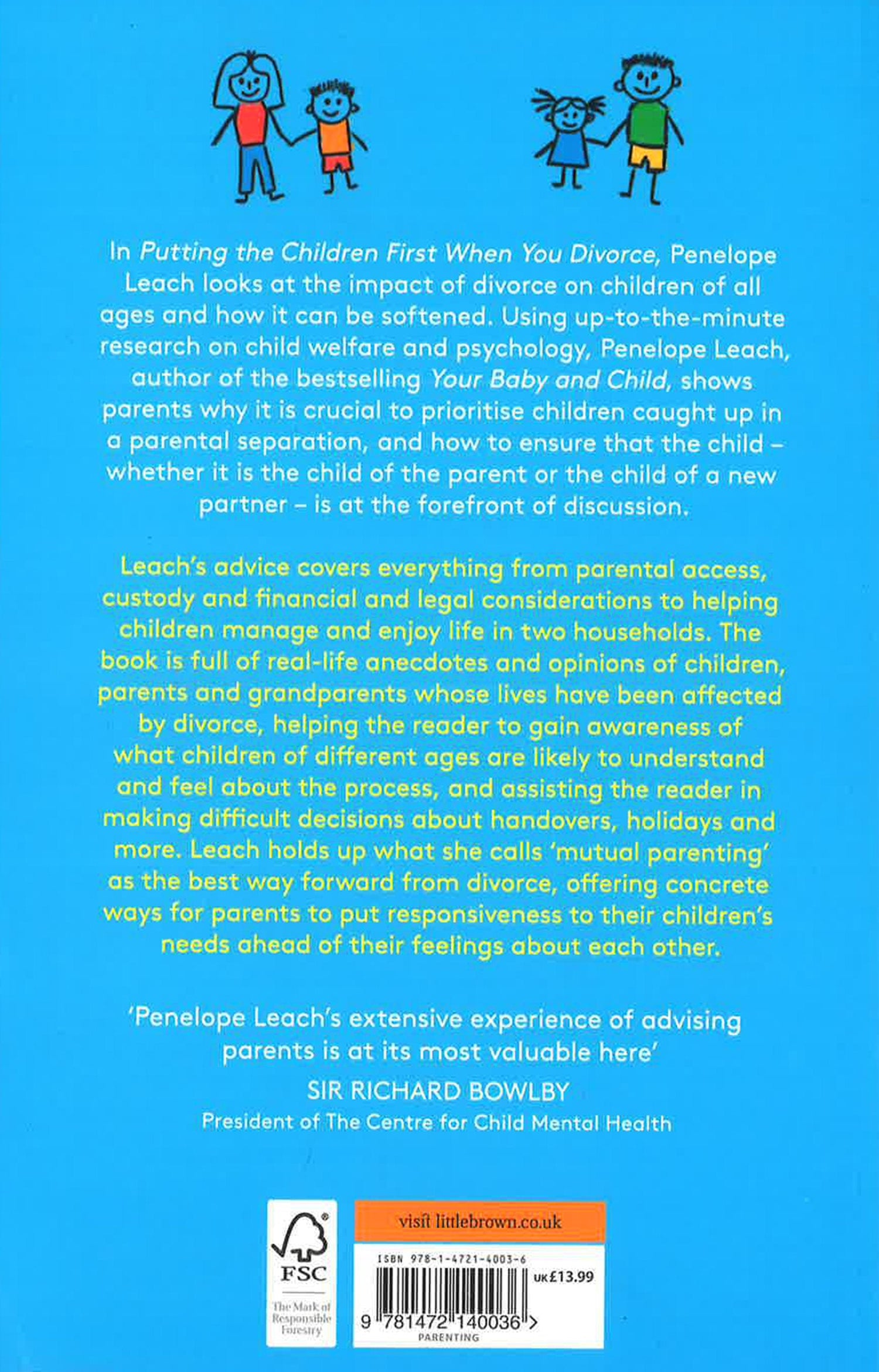 Using up-to-the-minute research on child welfare and psychology, Penelope Leach, author of the best-selling Your Baby & Child, shows parents why it is crucially important to prioritise children involved in parental separation, and how this can best be done. The reader will discover - often in their own words - what children of different ages are likely to understand and feel about the process, along with ways to help them cope. The book provides help with those difficult decisions about "access"; information about money and legal matters; and suggestions about handovers, holidays, and more.