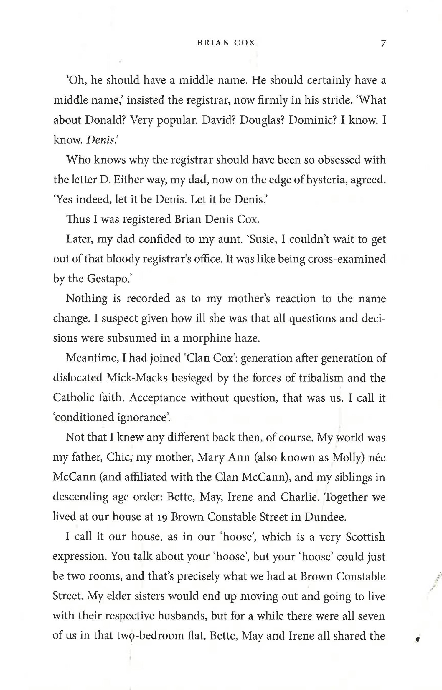Growing up in Dundee, Scotland, Cox lost his father when he was just eight years old and was brought up by his three elder sisters in the aftermath of his mother's nervous breakdowns and ultimate hospitalization. After joining the Dundee Repertory Theatre at the age of fifteen, you could say the rest is history - but that is to overlook the enormous graft that has gone into the making of the legend we know today.