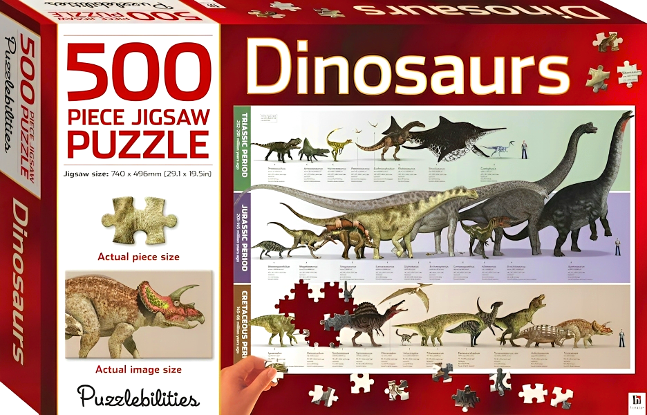 Featuring a detailed image of dinosaurs from the Triassic, Jurassic and Cretaceous peropds along with species information, and a handy reference image on both the front and back of the jigsaw puzzle box, making the puzzle easy to complete in a group.