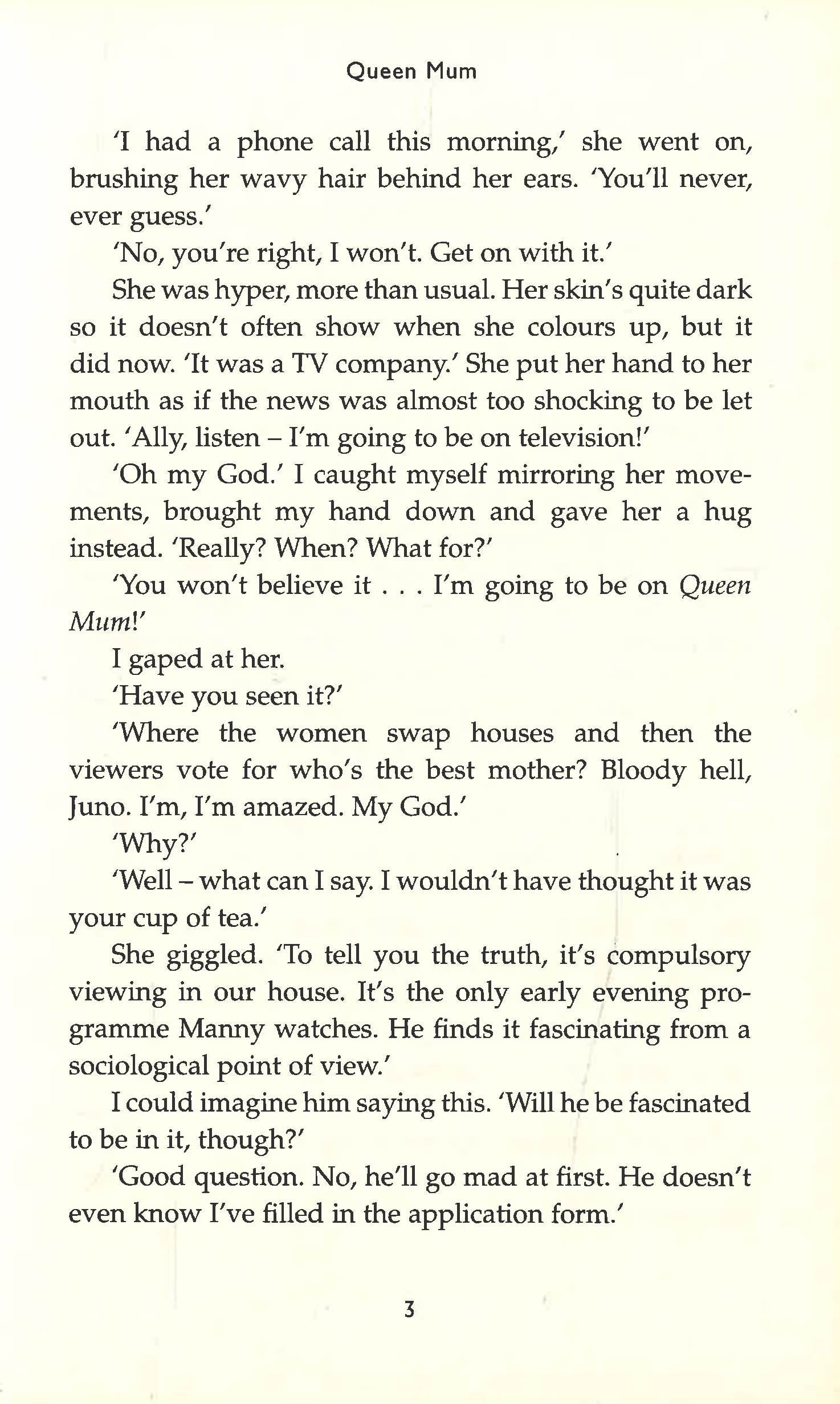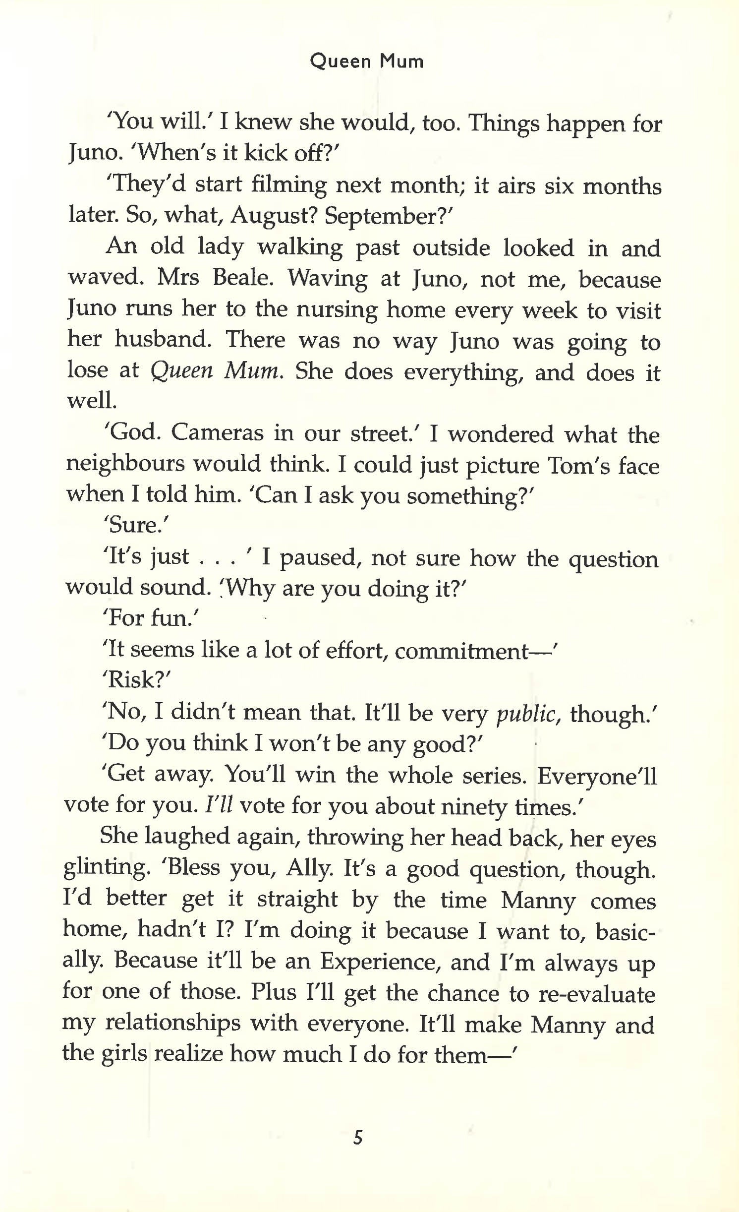 But Juno has suddenly made a surprising decision: she has signed up for a reality TV show, Queen Mum. For two weeks, she will be going to live with another family in another town, while her opposite number will be moving in next door to Ally. Juno is excited; she thinks it will be a `fascinating cultural exchange'. Ally isn't so sure; how will she manage without her best friend? But that isn't the only reason why she is worried. She doesn't like change. She has seen too much of it to find it interesting, and she knows from bitter experience how something precious can be lost in a moment.