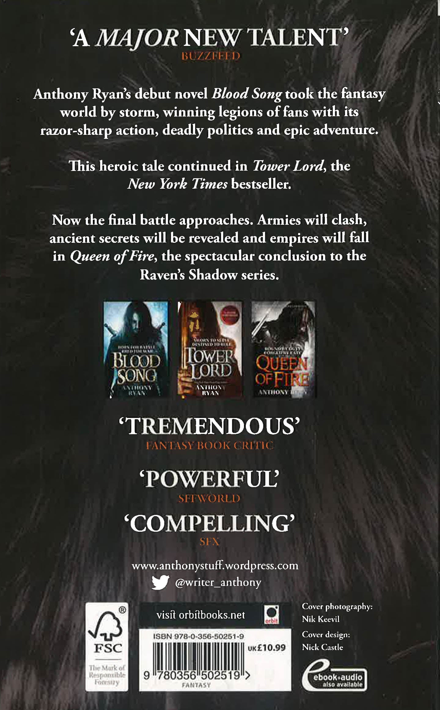 Queen of Fire is the spectacular conclusion to the internationally bestselling Raven's Shadow series - a powerful tale of desperate battles, deadly politics and epic adventure. EMPIRES WILL FALLQueen Lyrna has survived the bloody siege of Alltor. Now she must rally her troops and take back the capital from the Volarian invaders. But driving her hated enemy out of the Realm will not satisfy her lust for vengeance - she wants to pursue them across the ocean and burn their empire to ashes. To do so, she must place her faith in the Seventh Order: men and women who wield terrible powers, born of the Dark itself. Vaelin Al Sorna would sacrifice his life for his queen - and may yet have to. Only by unmasking the Volarians' mysterious Ally can the tide of war be turned. To this end, Vaelin must travel deep into the icebound north, in search of a man who cannot die - and he must do it without the aid of his blood song, which has fallen ominously silent . . . Praise for Raven's Shadow: 'Engrossing' - Buzzfeed'Powerful' - SFFWorld'Compelling' - SFXBooks by Anthony Ryan:Raven's ShadowBlood SongTower LordQueen of FireRaven's BladeThe Wolf's Call The Black Song The Draconis MemoriaThe Waking FireThe Legion of FlameThe Empire of AshesThe Covenant of SteelThe Pariah