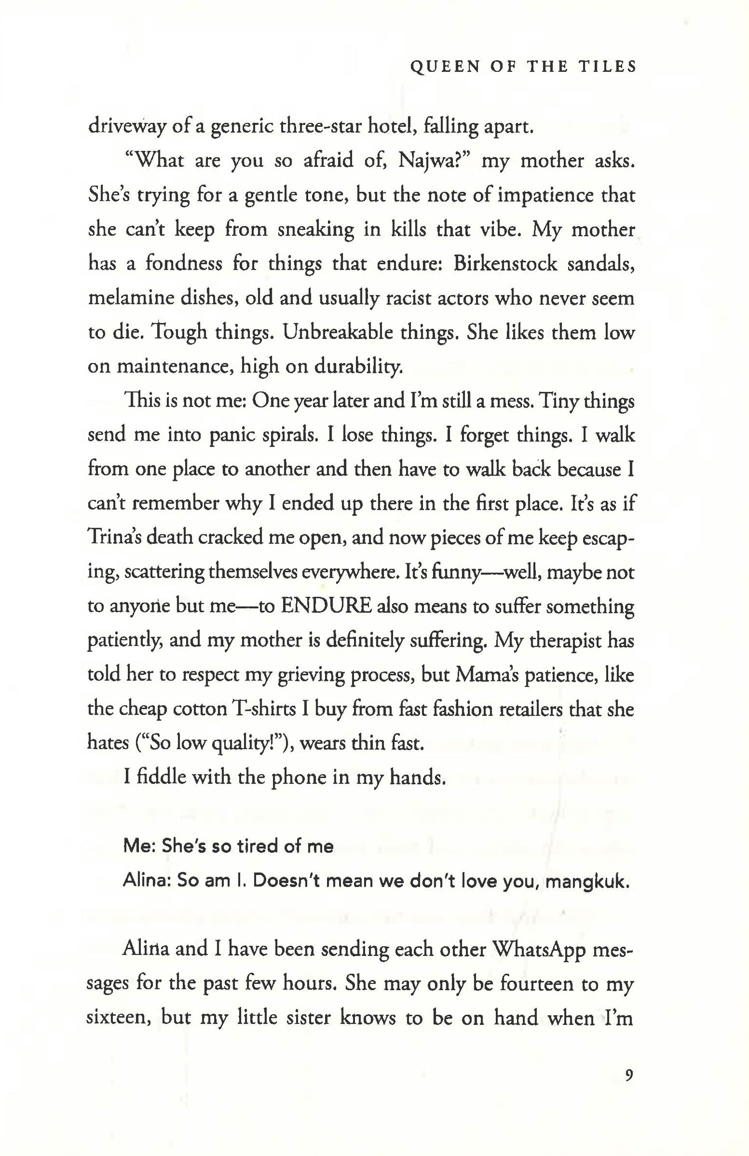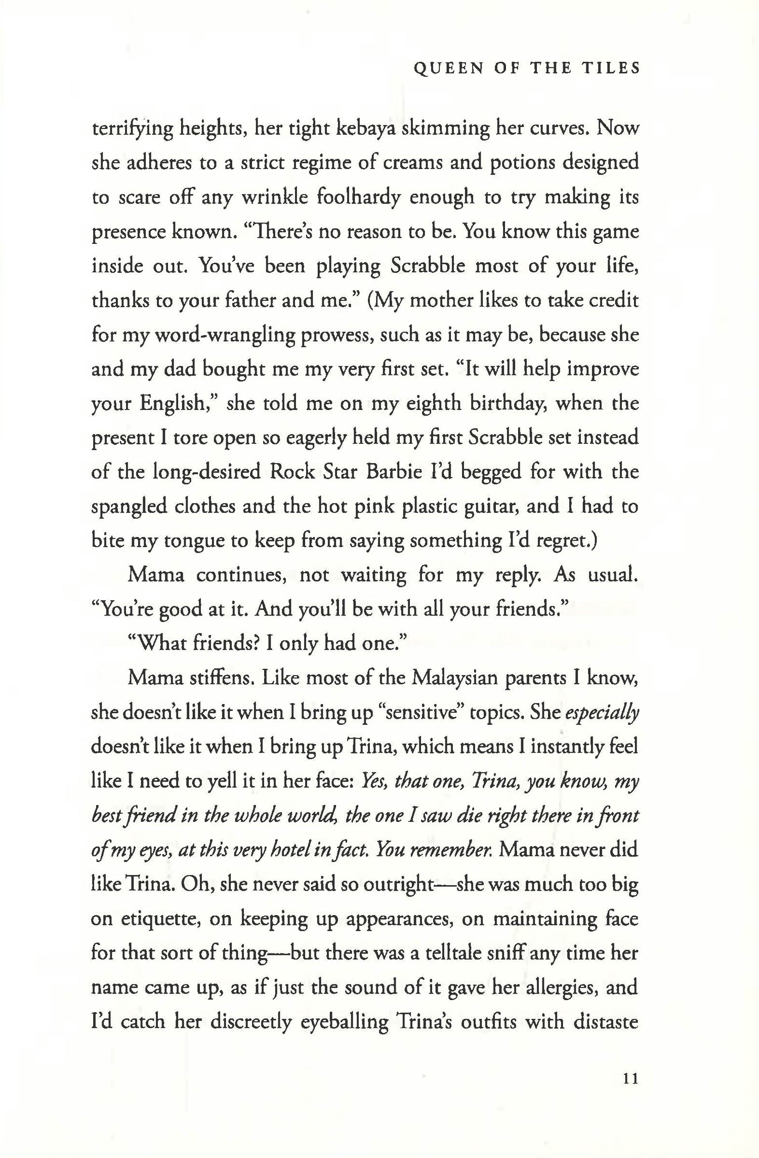 When Najwa Bakri walks into her first Scrabble competition since her best friend’s death, it’s with the intention to heal and move on with her life. Perhaps it wasn’t the best idea to choose the very same competition where said best friend, Trina Low, died. It might be even though Najwa’s trying to change, she’s not ready to give up Trina just yet.