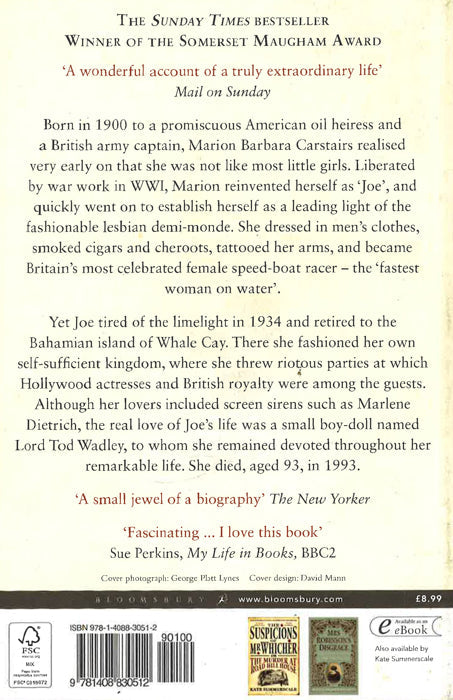 Born in 1900 to a promiscuous American oil heiress and a British army captain, Marion Barbara Carstairs realised very early on that she was not like most little girls. Liberated by war work in WWI, Marion reinvented herself as Joe, and quickly went on to establish herself as a leading light of the fashionable lesbian demi-monde. She dressed in men's clothes, smoked cigars and cheroots, tattooed her arms, and became Britain's most celebrated female speed-boat racer - the 'fastest woman on water'. Yet Joe tired of the lime-light in 1934, and retired to the Bahamian Island of Whale Cay. There she fashioned her own self-sufficient kingdom, where she hosted riotous parties which boasted Hollywood actresses and British royalty among their guests. Although her lovers included screen sirens such as Marlene Dietrich, the real love of Joe's life was a small boy-doll named Lord Tod Wadley, to whom she remained devoted throughout her remarkable life. She died, aged 93, in 1993.
