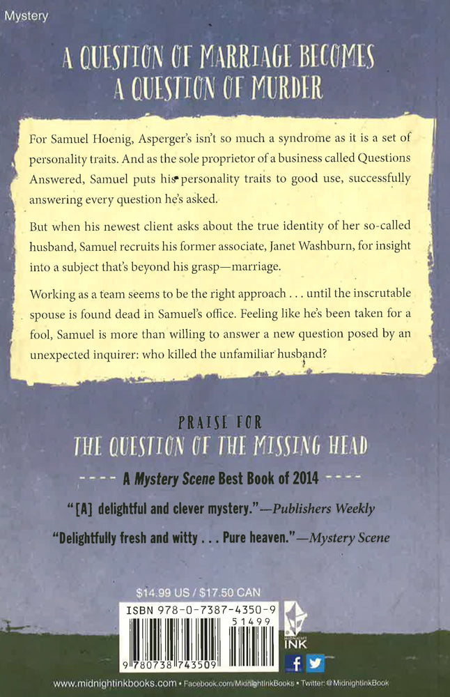 Working as a team seems to be the right approach...until the inscrutable spouse is found dead in Samuel's office. Feeling like he's been taken for a fool, Samuel is more than willing to answer a new question posed by an unexpected inquirer: who killed the unfamiliar husband?