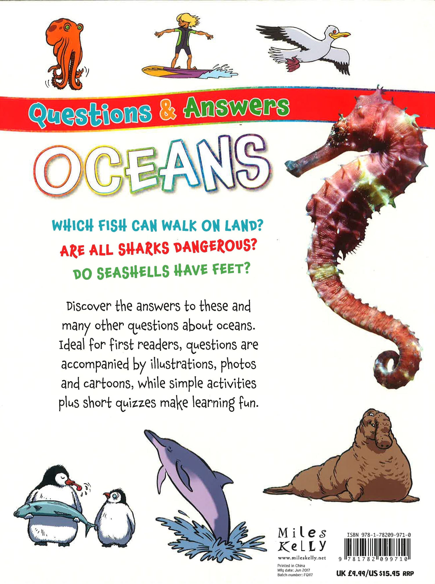 Questions and Answers Oceans is a large format paperback question-and-answer book, perfect for younger readers aged 5+ who want to know more about ocean life. The three main subject areas of Oceans, Seashore and Coral Reef are dealt with in an engaging but concise way, so children will love finding out the answers to the questions posed in the book. Each question is clearly answered, with funny cartoons, stunning illustrations and beautiful photos helping to explain the facts further. Activity panels throughout the book provide tips on further learning.