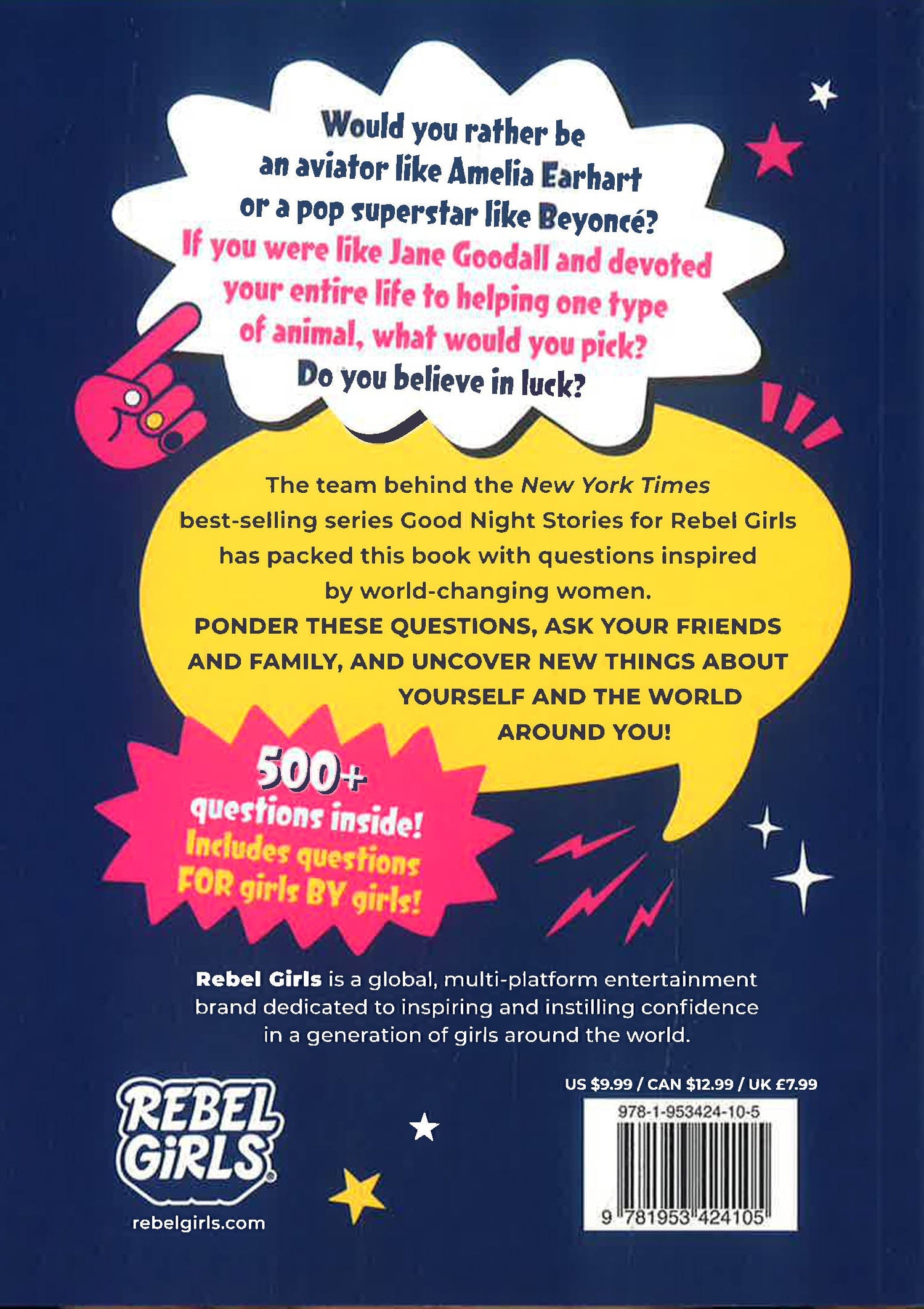 Girls love to explore their feelings, uncover their personality, and decode the world around them. One way to do that is to explore their answers to provocative questions about anything and everything. Questions for Rebel Girls introduces readers to extraordinary women throughout history and asks them to imagine themselves in similar scenarios. Designed to ignite exciting discussions between little rebels and their siblings, friends, and grown-ups, Questions for Rebel Girls is packed with more than 500 entertaining and thought-provoking questions--including some questions submitted by young fans of Good Night Stories for Rebel Girls.