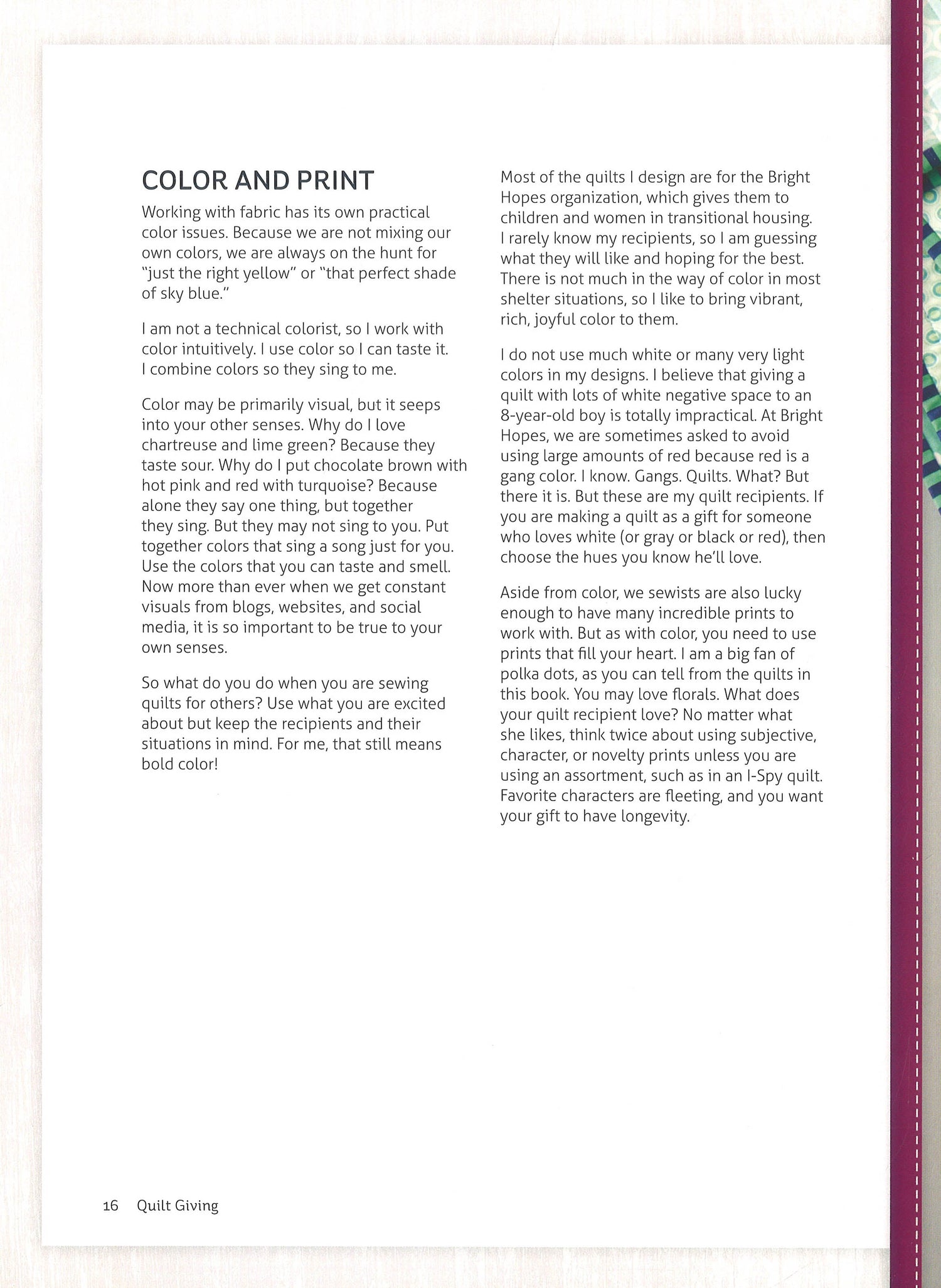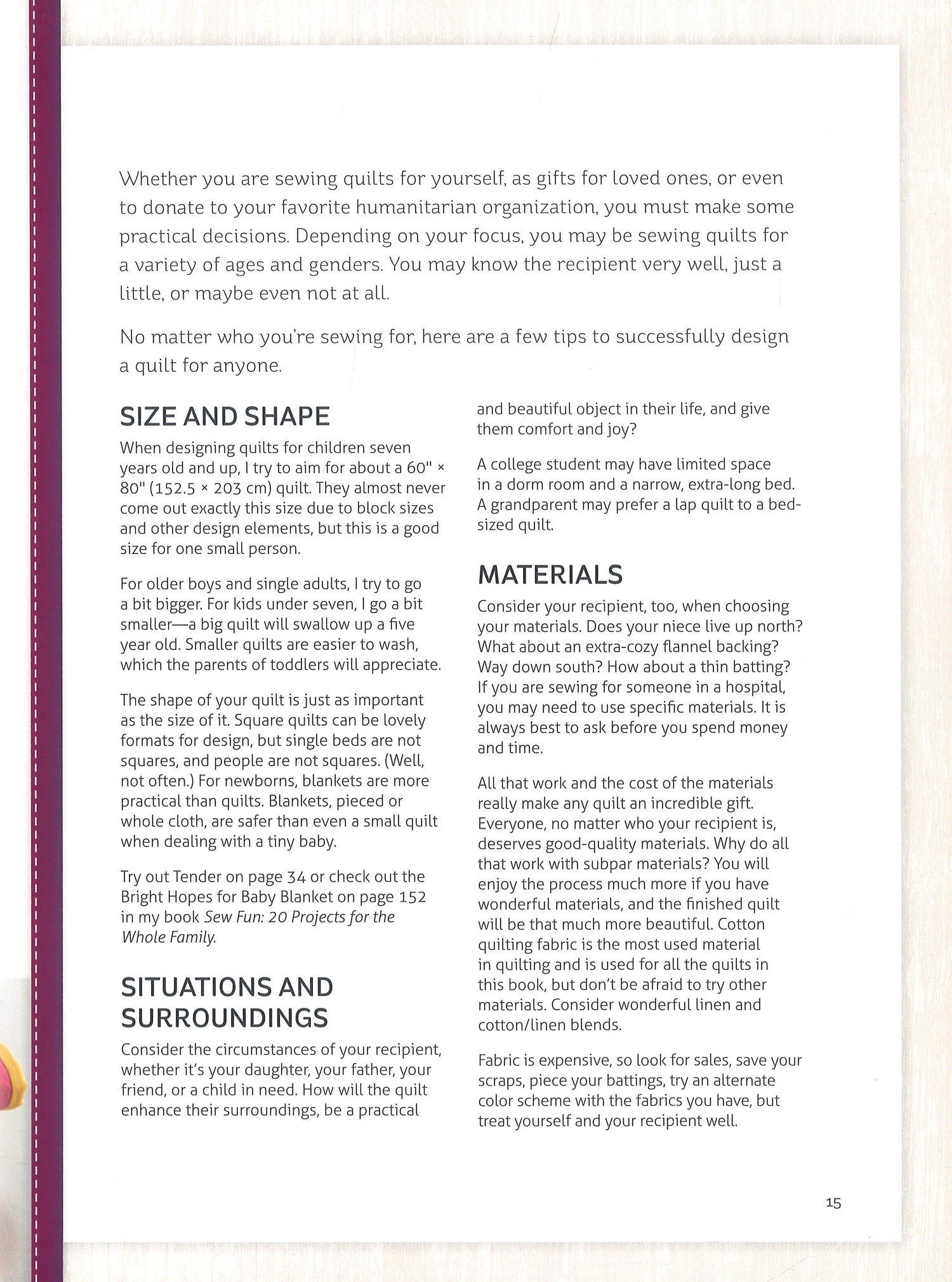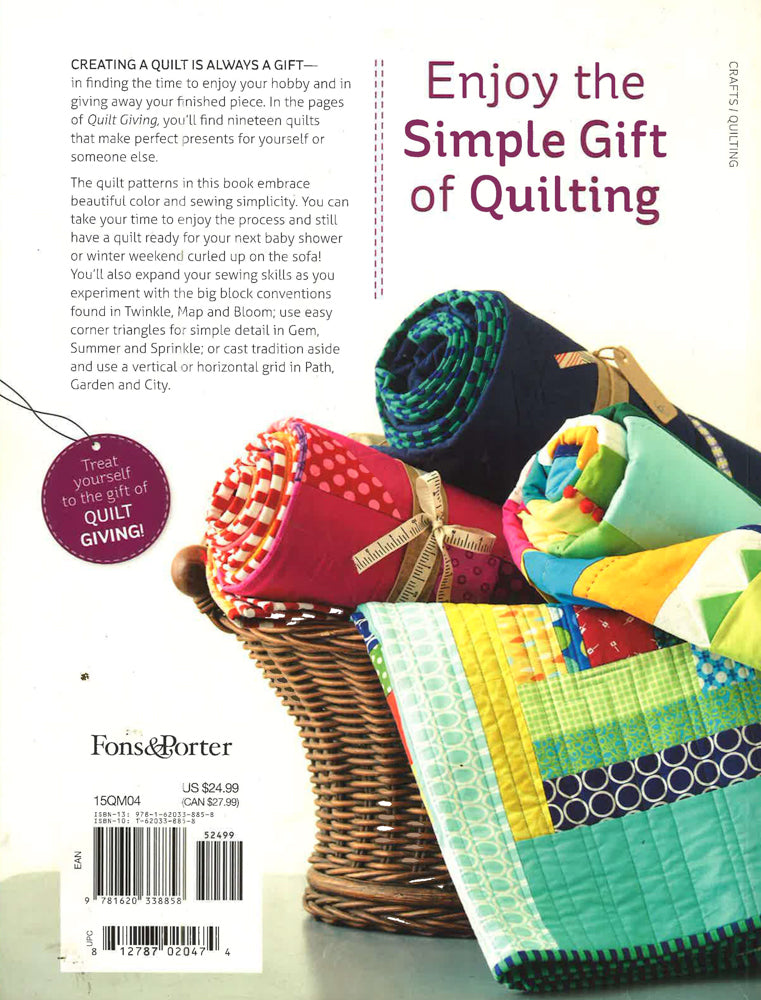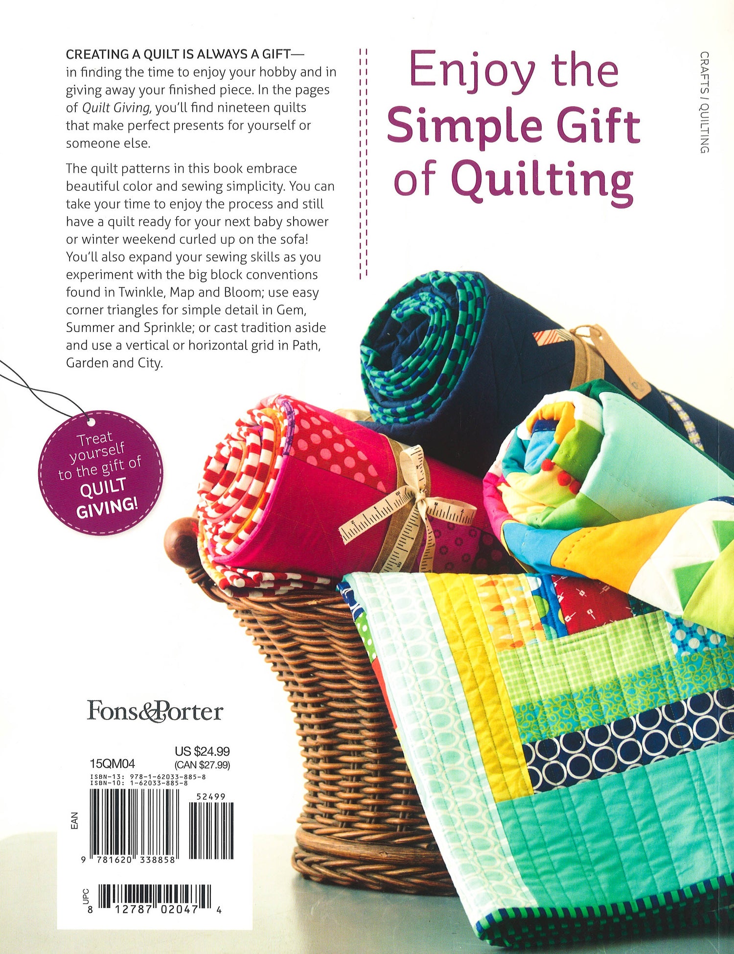 Enjoy the simple gift of quilting! Creating a quilt is always a gift--in finding the time to enjoy your hobby, and in giving away your finished piece. In the pages of Quilt Giving, you'll find nineteen quilts that make perfect presents for yourself or someone else. The quilt patterns in this book embrace beautiful color and sewing simplicity. You can take your time to enjoy the process and still have a quilt ready for your next baby shower or winter weekend curled up on the sofa! You'll also expand your sewing skills as you experiment with the big block conventions found in Twinkle, Map and Bloom; use easy corner triangles for simple detail in Gem, Summer and Sprinkle; or cast tradition aside and use a vertical or horizontal grid in Path, Garden and City. Treat yourself to the gift of Quilt Giving!