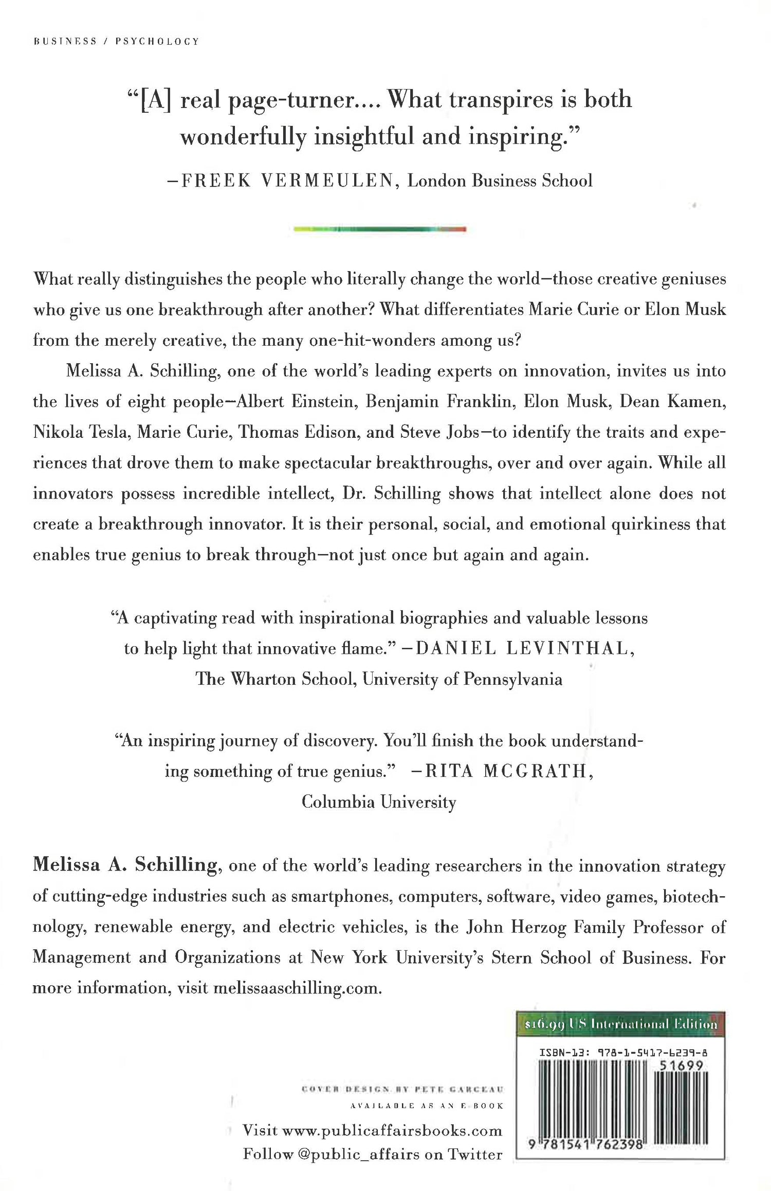 From historical figures such as Marie Curie to contemporaries such as Steve Jobs, a handful of innovators have changed the world. What made them so spectacularly inventive? Melissa A. Schilling, one of the world's leading experts on innovation, looks at the lives of seven creative geniuses--Albert Einstein, Benjamin Franklin, Elon Musk, Dean Kamen, Nicola Tesla, Curie, and Jobs--to identify the traits and quirks that led them to become breakthrough innovators.