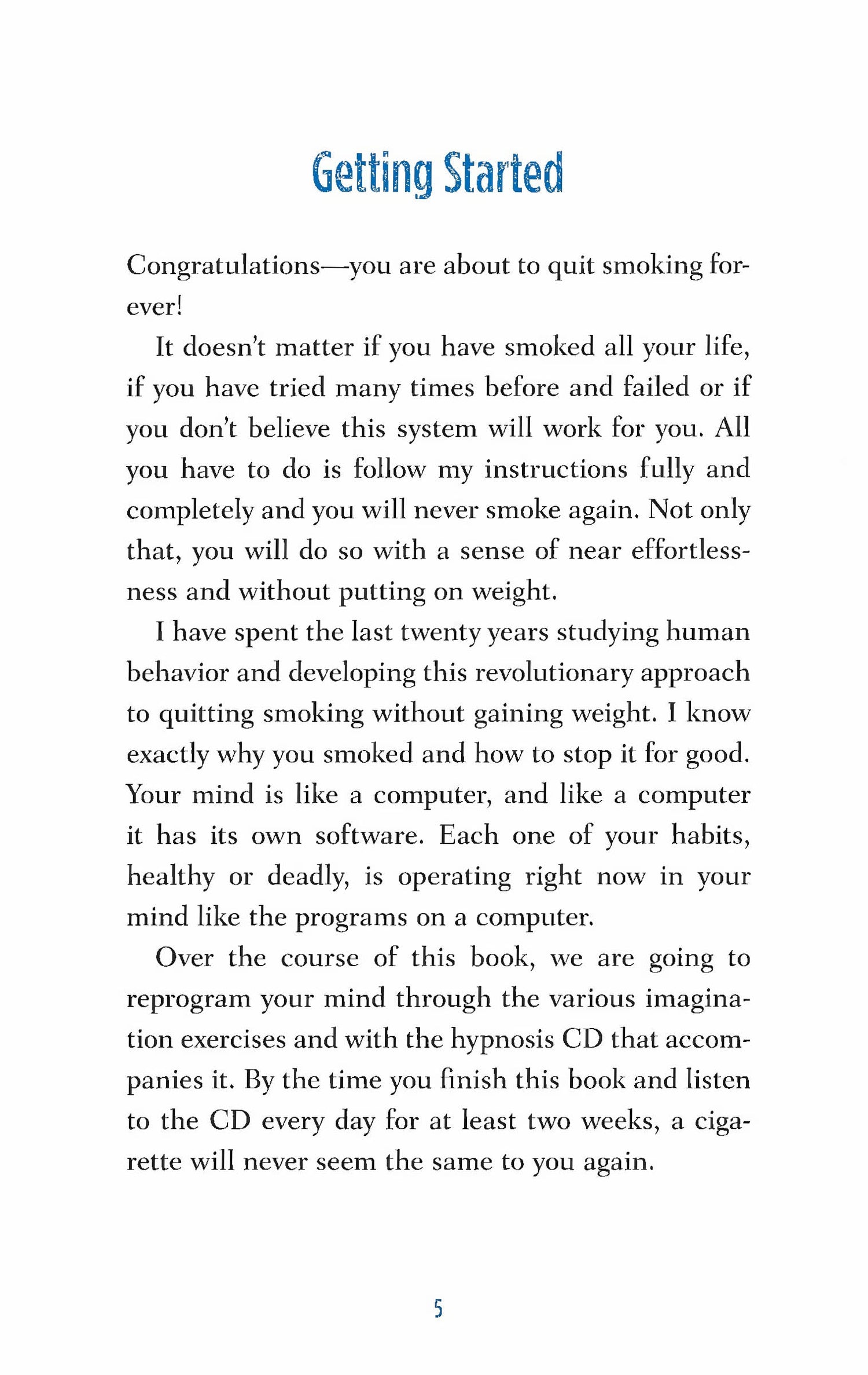 Paul McKenna, PhD, has developed a breakthrough system to help people quit smoking. 97% of people who use it do NOT gain any weight when they quit smoking. Already an international bestseller, this book and hypnosis CD has helped people all over the world to change their lives.Through the simple conditioning system revealed in the book and on the accompanying hypnosis CD, Paul McKenna retrains your mind and body so that you no longer crave cigarettes. Stress-busting exercises, visualizations, helpful questions and answers, and a handful of easy-to-follow rules get to the root of cigarette addiction.