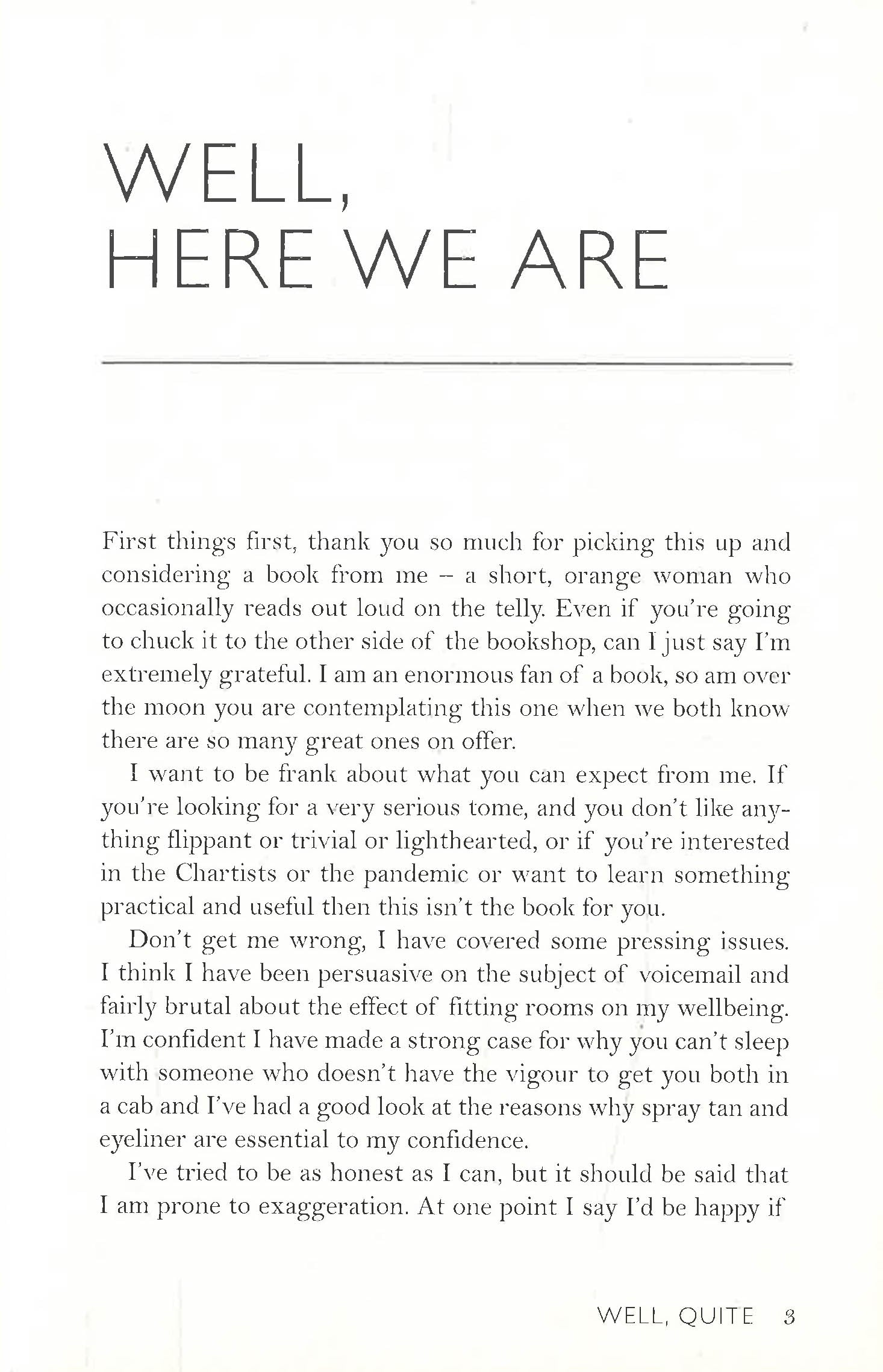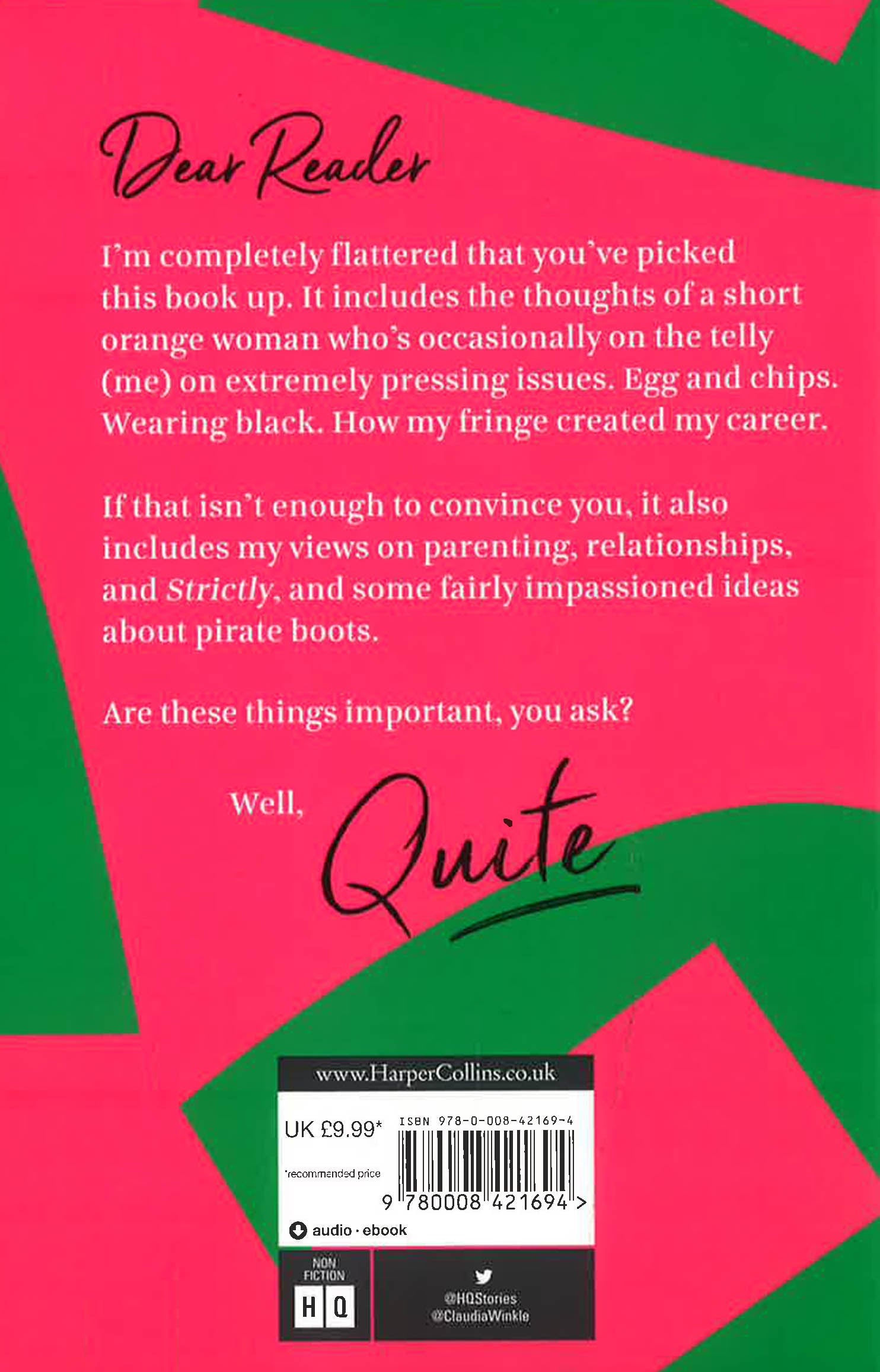 'A delight' Stylist 'Funny, real and caring' YOU Magazine 'Funny, irreverent and moving... everything you would expect from the thick-fringed presenter who's won a place in the nation's hearts' The Sun 'Full of hilarious insights' Vanity Fair A SUNDAY TIMES BESTSELLER Funny, moving and truthful... QuiteClaudia Winkleman's warmth, humour, no-holds-barred attitude and smoky eye have made her the favourite broadcaster of millions and a much-loved household name. In this, her first ever book, Claudia invites us all into her world. She shares her observations on topics such as the importance of melted cheese, why black coats are vital, how it's never okay to have sex with someone who has an opinion on your date outfit, how nurses are our most precious national treasure, and why colourful clothing is only for the under 10s (if you're reading this sporting a bright red jumper and you're 9, great! If you're older, sorry). This is a love letter to life - the real, sometimes messy kind. Quite celebrates friendship, the power of art, the highs and lows of parenting, and of course, how a good eyeliner can really save your life. Heartfelt, wry and unmistakably Claudia, this book gets to the heart of what really matters. Claudia Winkleman's Quite was a No.1 Sunday Times bestseller w/c 27th December 2020.