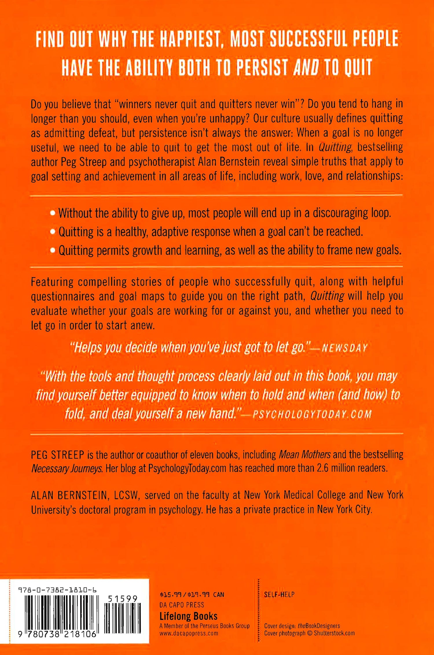Find out why the happiest, most successful people have the ability both to persist and to quitDo you believe that "winners never quit and quitters never win"? Do you tend to hang in longer than you should, even when you're unhappy? Our culture usually defines quitting as admitting defeat, but persistence isn't always the answer: When a goal is no longer useful, we need to be able to quit to get the most out of life. In Quitting , bestselling author Peg Streep and psychotherapist Alan Bernstein reveal simple truths that apply to goal setting and achievement in all areas of life, including work, love, and relationships:Without the ability to give up, most people will end up in a discouraging loop.Quitting is a healthy, adaptive response when a goal can't be reached.Quitting permits growth and learning, as well as the ability to frame new goals.Featuring compelling stories of people who successfully quit, along with helpful questionnaires and goal maps to guide you on the right path, Quitting will help you evaluate whether your goals are working for or against you, and whether you need to let go in order to start anew.