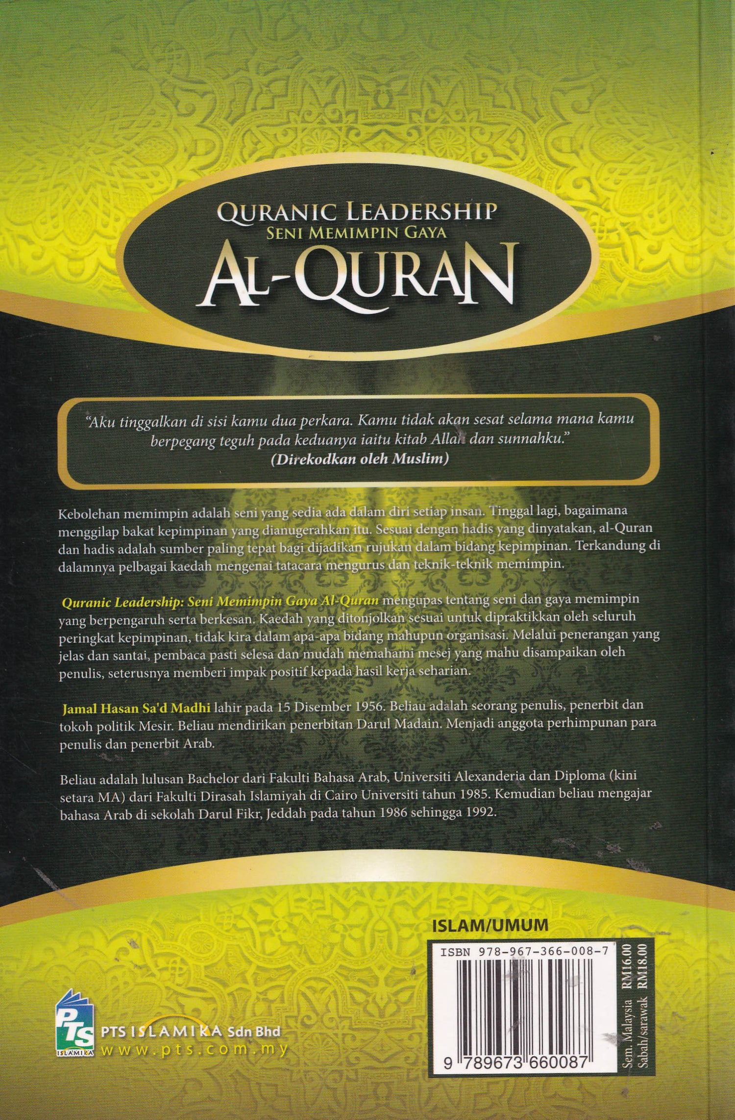 Quranic Leadership: Seni Memimpin Gaya Al-Quran mengupas tentang seni dan gaya memimpin yang berpengaruh serta berkesan. Kaedah yang ditonjolkan sesuai untuk dipraktikkan oleh seluruh peringkat kepimpinan, tidak kira dalam apa-apa bidang mahupun organisasi. Melalui penerangan yang jelas dan santai, pembaca pasti selesa dan mudah memahami mesej yang mahu disampaikan oleh penulis, seterusnya memberi impak positif kepada hasil kerja seharian.