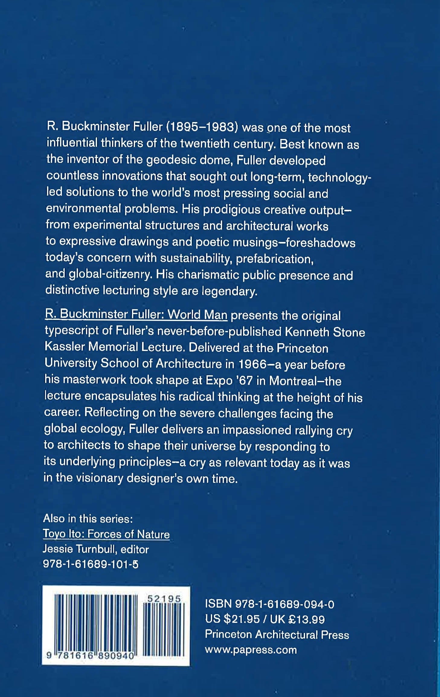 Buckminster Fuller (1895-1983) was one of the most innovative and influential thinkers of the twentieth century. Best known as the inventor of the geodesic dome, Fuller sought out long-term, technology-led solutions to the world's most pressing social and environmental problems. His prodigious creative output-from visionary architectural works and experimental structures to expressive drawings and poetic musings-foreshadowed today's green design and prefab housing movements.R.Buckminster Fuller: World Man documents his never-before-published 1966 Kassler lecture at Princeton University School of Architecture. Delivered at the height of his career (Fuller had appeared on the cover ofTime magazine in 1964), he used the lecture to reflect on and synthesize his most significant concepts. In addition to a faithful facsimile of the lecture's typewritten transcript, the book includes an introductory essay on Fuller's work, a glossary of key terms and phrases, and an interview with Robert Geddes, the dean responsible for bringing Fuller to teach and lecture at the school.