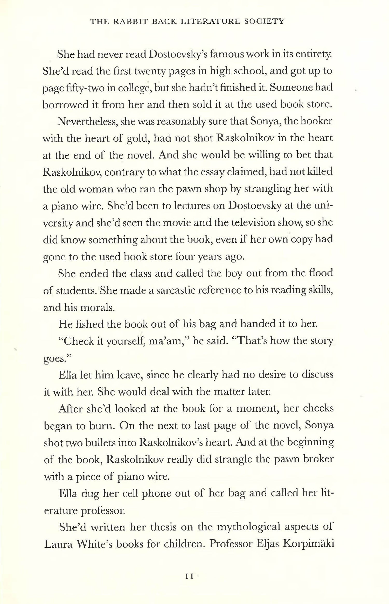 Only nine people have ever been chosen by renowned children's author Laura White to join the Rabbit Back Literature Society, an elite group of writers in the small town of Rabbit Back. Now a tenth member has been selected: a young literature teacher named Ella.