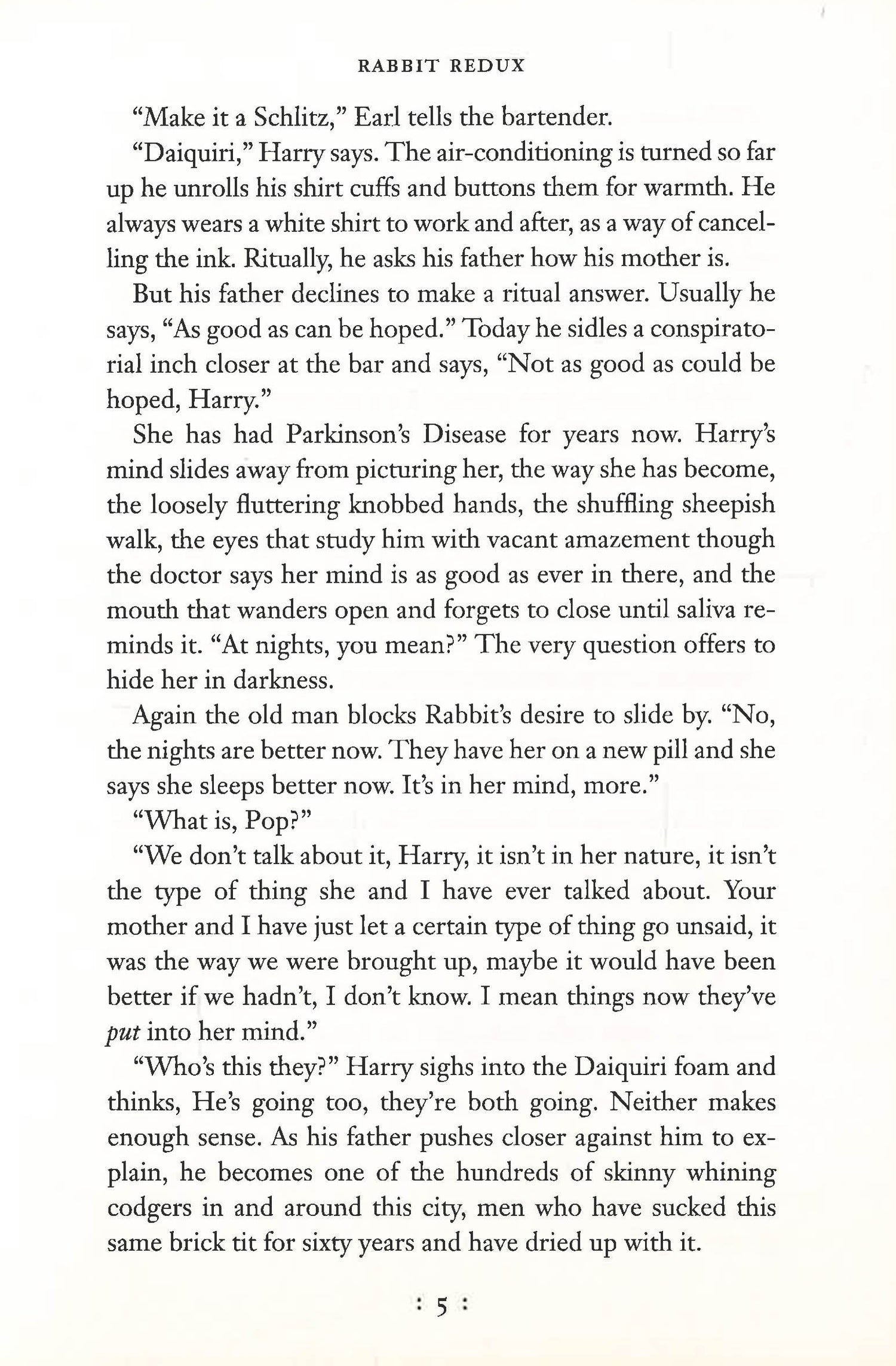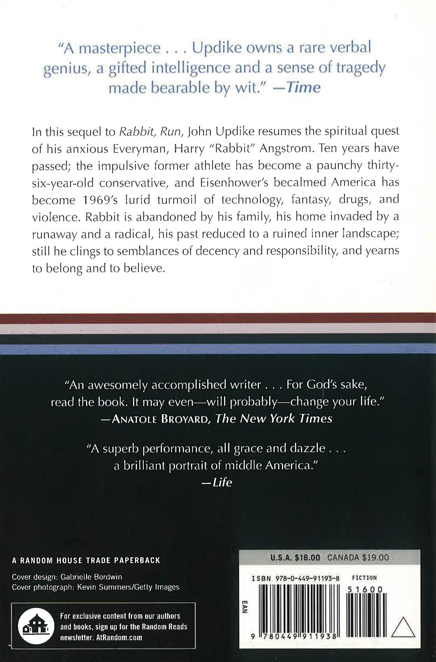 In this sequel to Rabbit, Run, John Updike resumes the spiritual quest of his anxious Everyman, Harry "Rabbit" Angstrom. Ten years have passed; the impulsive former athlete has become a paunchy thirty-six-year-old conservative, and Eisenhower's becalmed America has become 1969's lurid turmoil of technology, fantasy, drugs, and violence. Rabbit is abandoned by his family, his home invaded by a runaway and a radical, his past reduced to a ruined inner landscape; still he clings to semblances of decency and responsibility, and yearns to belong and to believe.