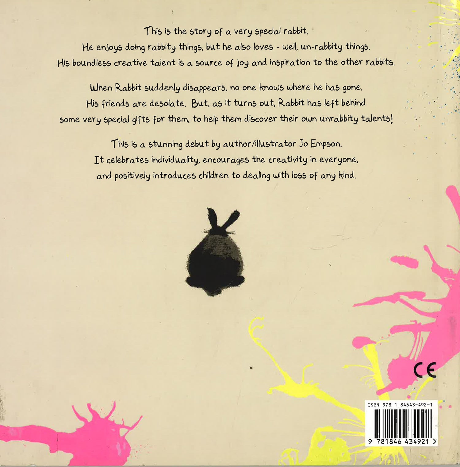 Rabbit enjoys doing rabbity things, but he also loves un-rabbity things! When Rabbit suddenly disappears, no one knows where he has gone. His friends are desolate. But, as it turns out, Rabbit has left behind some very special gifts for them, to help them discover their own unrabbity talents! This is a stunning debut picture book by author/illustrator Jo Empson. Rabbityness celebrates individuality, encourages the creativity in everyone and positively introduces children to dealing with loss of any kind.