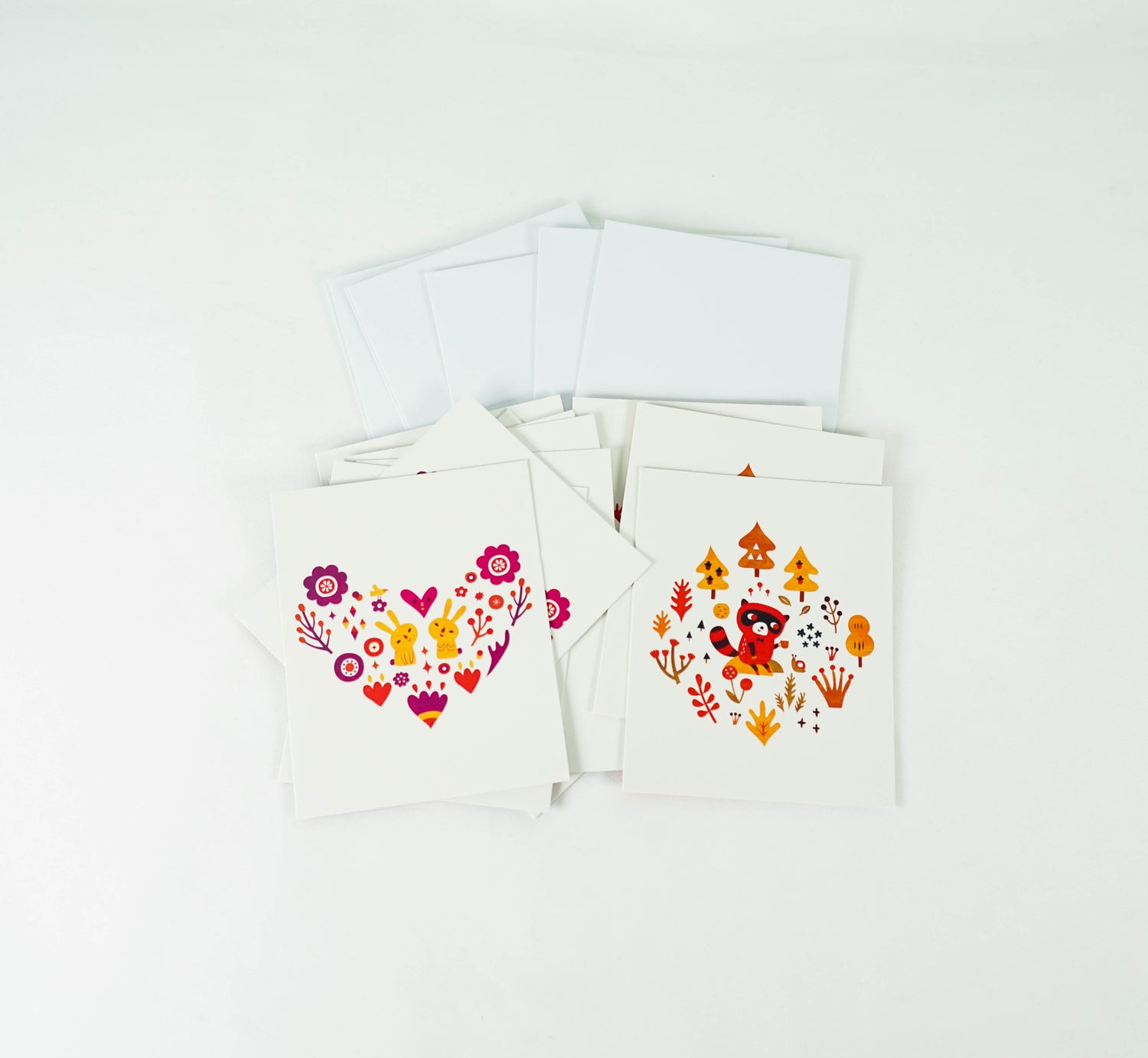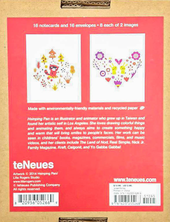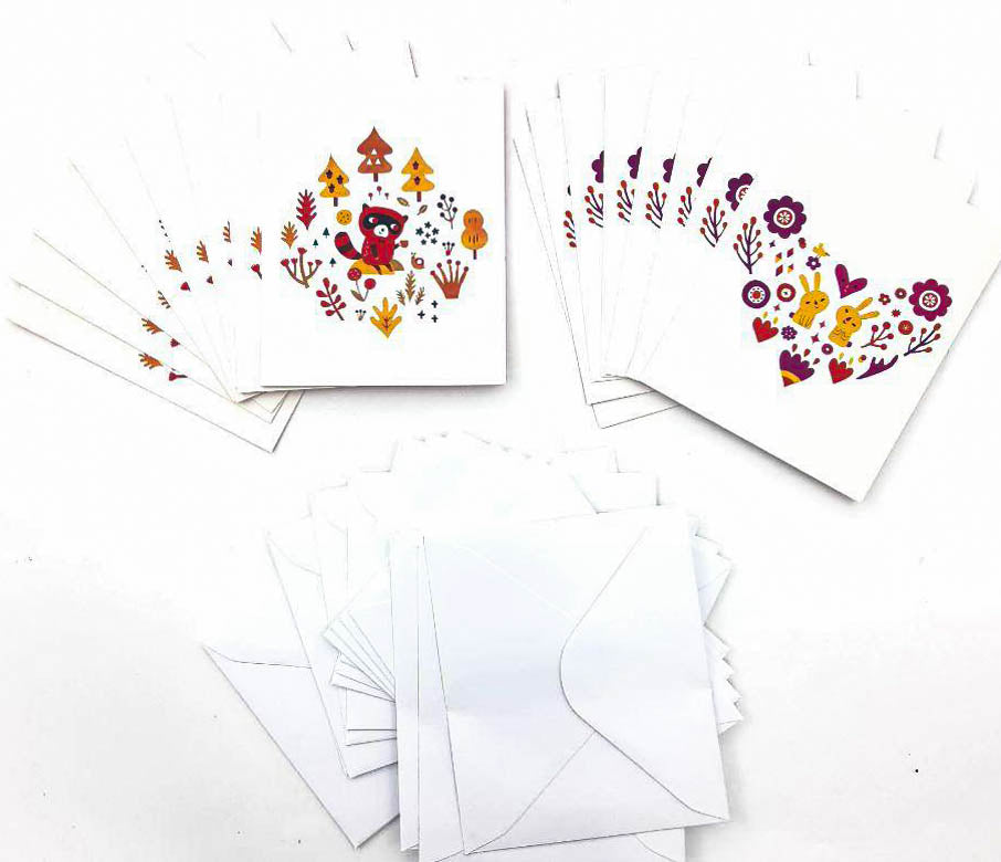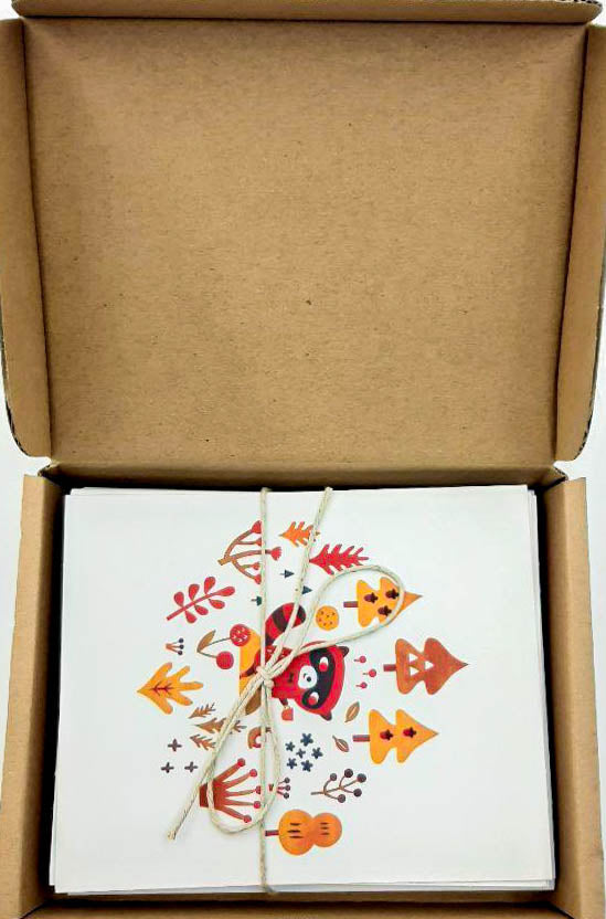 The adorable forest creatures in this set of delightful boxed notecards will help you send memorable notes to friends and family. Packaged in a corrugated cardboard box, our GreenNotes combine old-world charm with modern design. Cards, envelopes, and packaging are printed with soy-based inks and made with environmentally-friendly materials. 16 notecards and envelopes, 8 each of 2 images. Cards, envelopes and packaging made with recycled materials. Packaged in a corrugated flip-top box. Cards printed on uncoated paper stock. Cards and envelopes bundled together with a decorative twine tie.