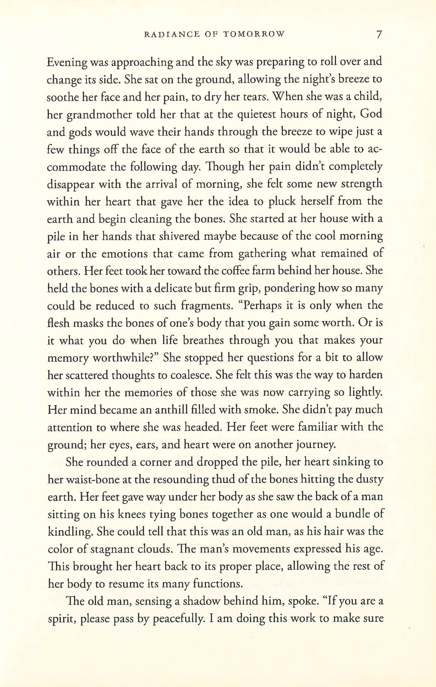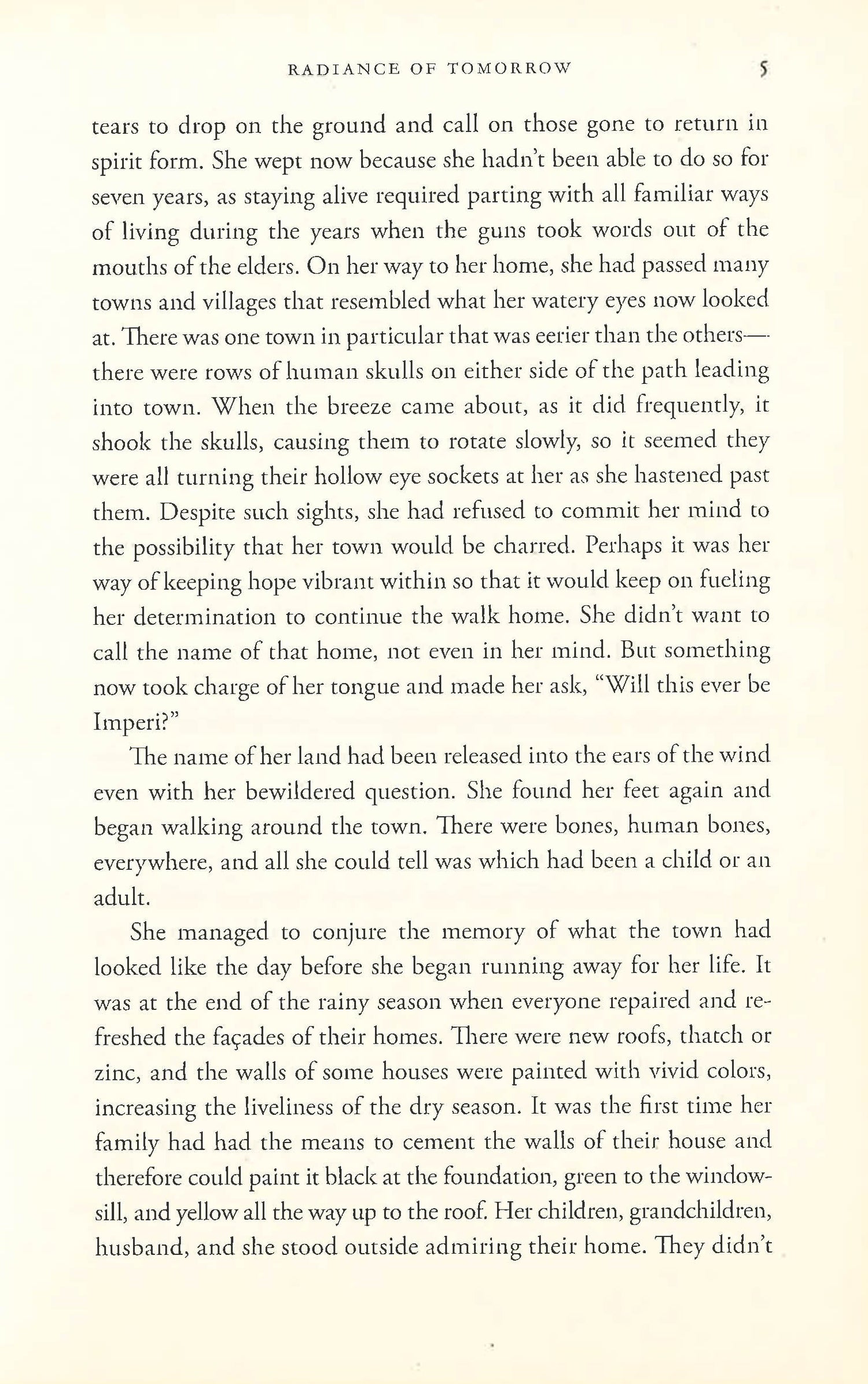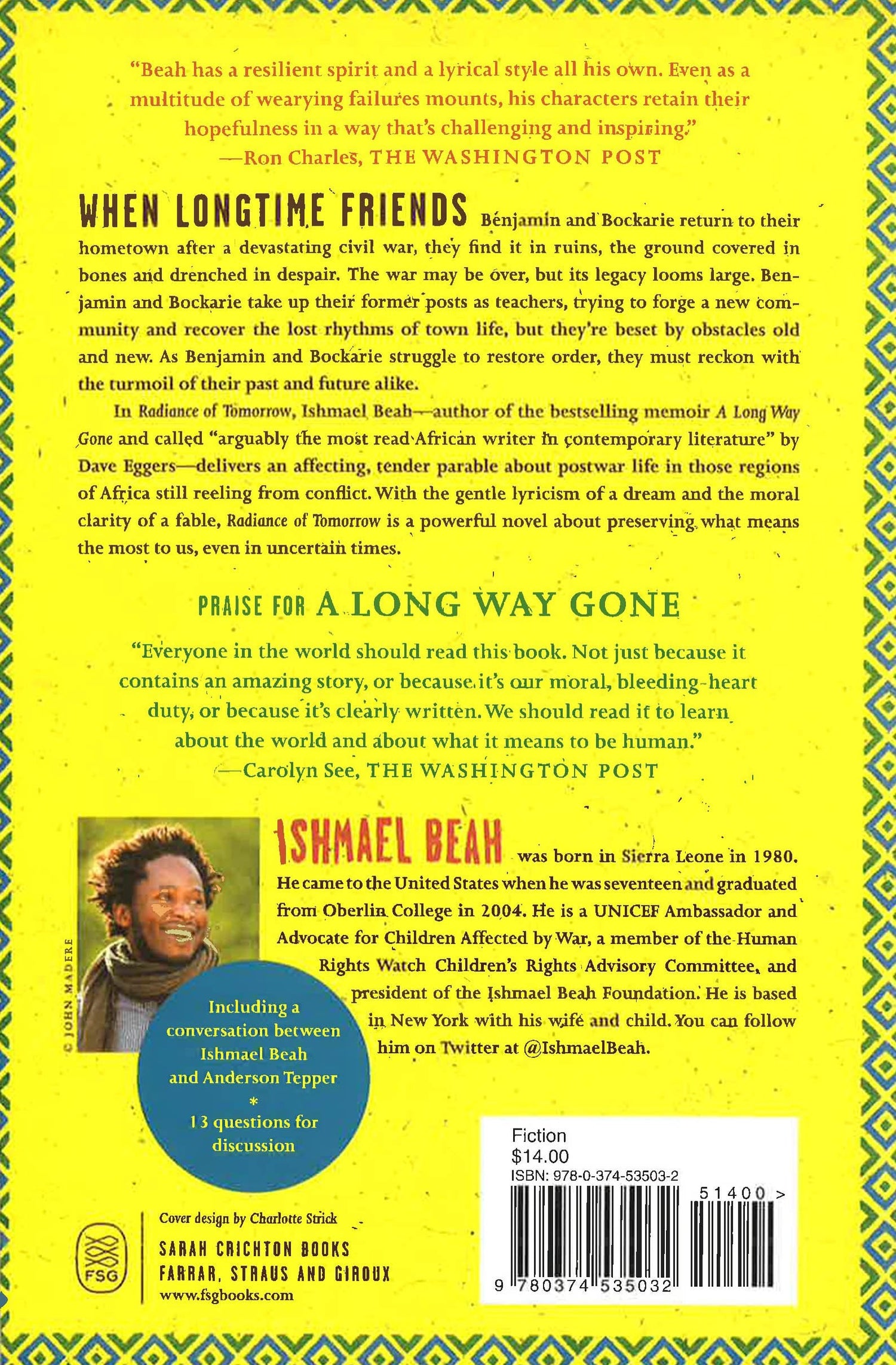 When Ishmael Beah's A Long Way Gone was published in 2007, it soared to the top of bestseller lists, becoming an instant classic: a harrowing account of Sierra Leone's civil war and the fate of child soldiers that "everyone in the world should read" (The Washington Post). Now Beah, whom Dave Eggers has called "arguably the most read African writer in contemporary literature," has returned with his first novel, an affecting, tender parable about postwar life in Sierra Leone. At the center of Radiance of Tomorrow are Benjamin and Bockarie, two longtime friends who return to their hometown, Imperi, after the civil war. The village is in ruins, the ground covered in bones. As more villagers begin to come back, Benjamin and Bockarie try to forge a new community by taking up their former posts as teachers, but they're beset by obstacles: a scarcity of food; a rash of murders, thievery, rape, and retaliation; and the depredations of a foreign mining company intent on sullying the town's water supply and blocking its paths with electric wires. As Benjamin and Bockarie search for a way to restore order, they're forced to reckon with the uncertainty of their past and future alike.