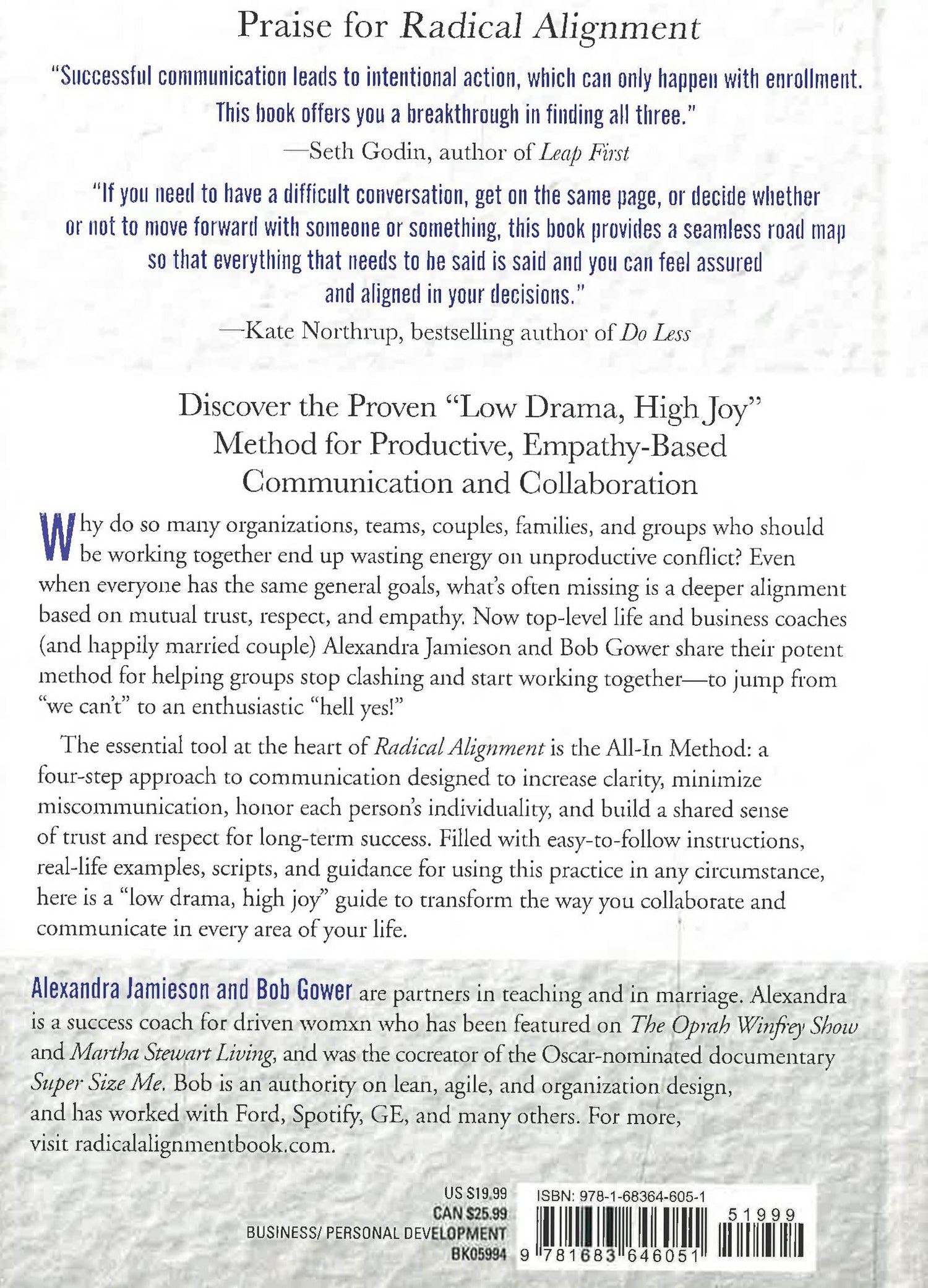A proven method to get your team unstuck and into alignment Why do so many organizations, teams, couples, families and other groups waste energy on unproductive conflict? Even when everyone has the same general goals, what's often missing is a deeper alignment based on mutual trust, respect, and empathy. With Radical Alignment, top-level life and business coaches (and happily married couple!) Alexandra Jamieson and Bob Gower share their potent method for helping groups to stop clashing and start working together-to jump from "we can't" to an enthusiastic "hell yes!" Jamieson and Gower teach practical tools to help each member of a group skillfully express their core values, concerns, and highest hopes for any undertaking-building a foundation of understanding and respect that can support even the most ambitious goals. Their All-In Method starts with making the implicit explicit so collaborators are able to develop a foundation of empathy and trust. "The world needs more people who know how to build aligned and empathic relationships-in businesses, communities, and families-through powerful, clear conversations," write the authors. Radical Alignment brings you a "low-drama, high-joy" technique to transform the way you collaborate and communicate in every area of your life.