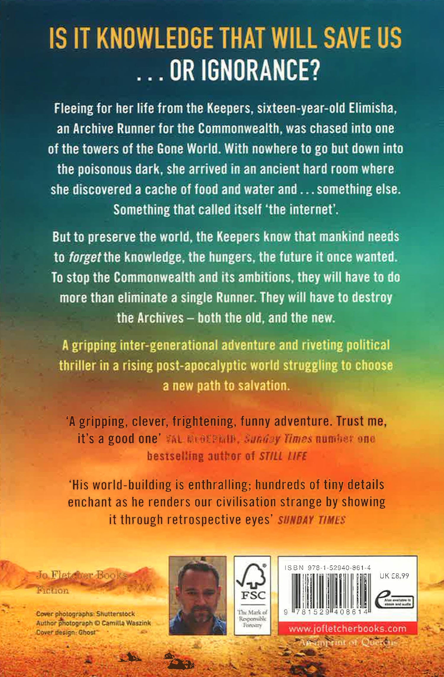 Fourteen days ago the Keepers chased sixteen-year-old Archive Runner Elimisha into a forbidden Old World Tower and brought the entire thing down on her. Instead of being killed, though, she slipped into an ancient unmapped bomb shelter where she has discovered a cache of food and fresh water, a two-way radio like the one Lilly's been working on for years . . . and something else. Something that calls itself 'the internet' . . .