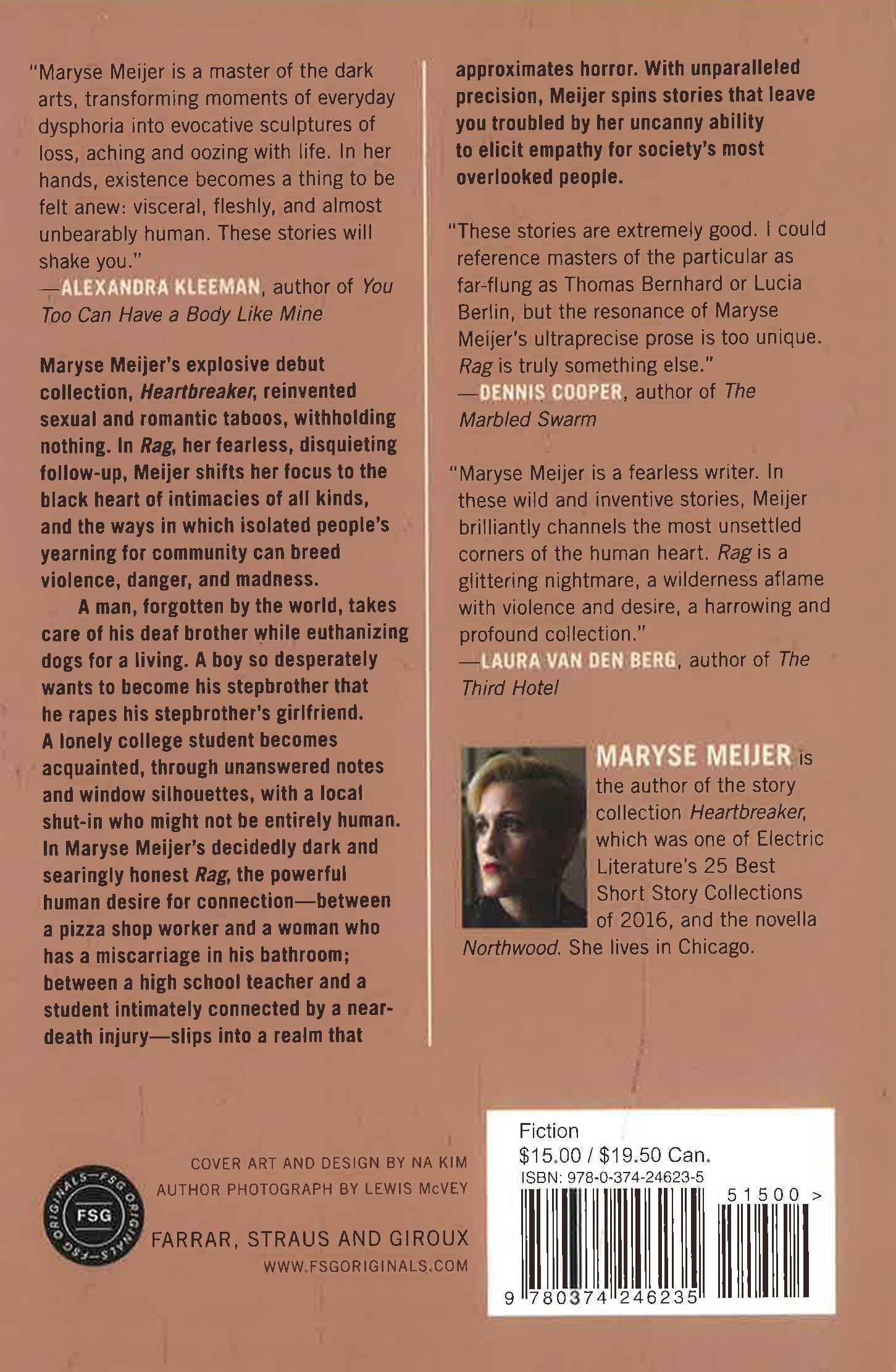 A man, forgotten by the world, takes care of his deaf brother while euthanising dogs for a living. A stepbrother so desperately wants to become his step-sibling that he rapes his girlfriend. In Maryse Meijer’s decidedly dark and searingly honest collection Rag, the desperate human desire for connection slips into a realm that approximates horror. Meijer’s explosive debut collection, Heartbreaker, reinvented sexualised and romantic taboos, holding nothing back. In Rag, Meijer’s fearless follow-up, she shifts her focus to the dark heart of intimacies of all kinds, and the ways in which isolated people’s yearning for community can breed violence, danger, and madness. With unparalleled precision, Meijer spins stories that leave you troubled and slightly shaken by her uncanny ability to elicit empathy for society’s most marginalised people.