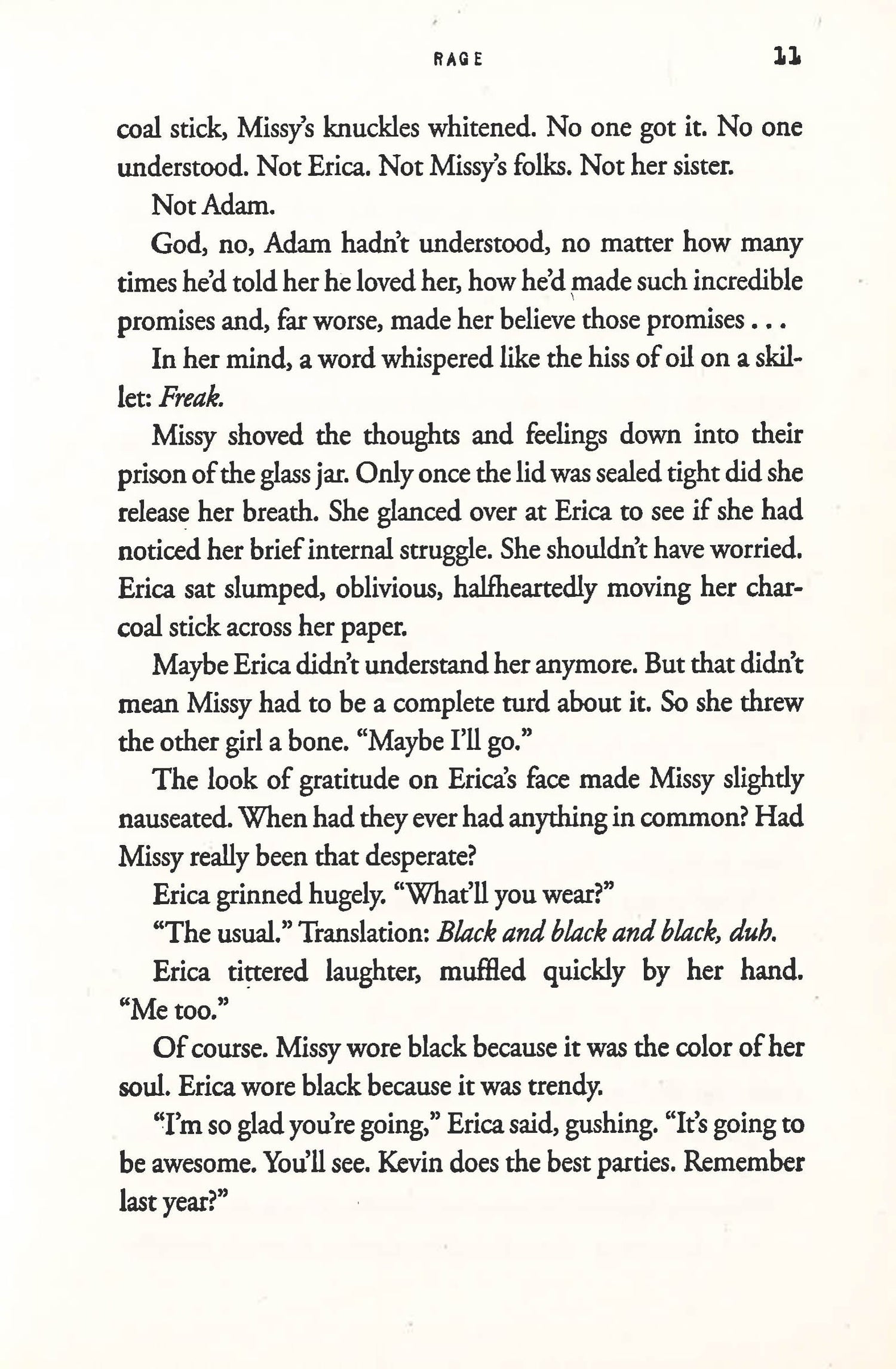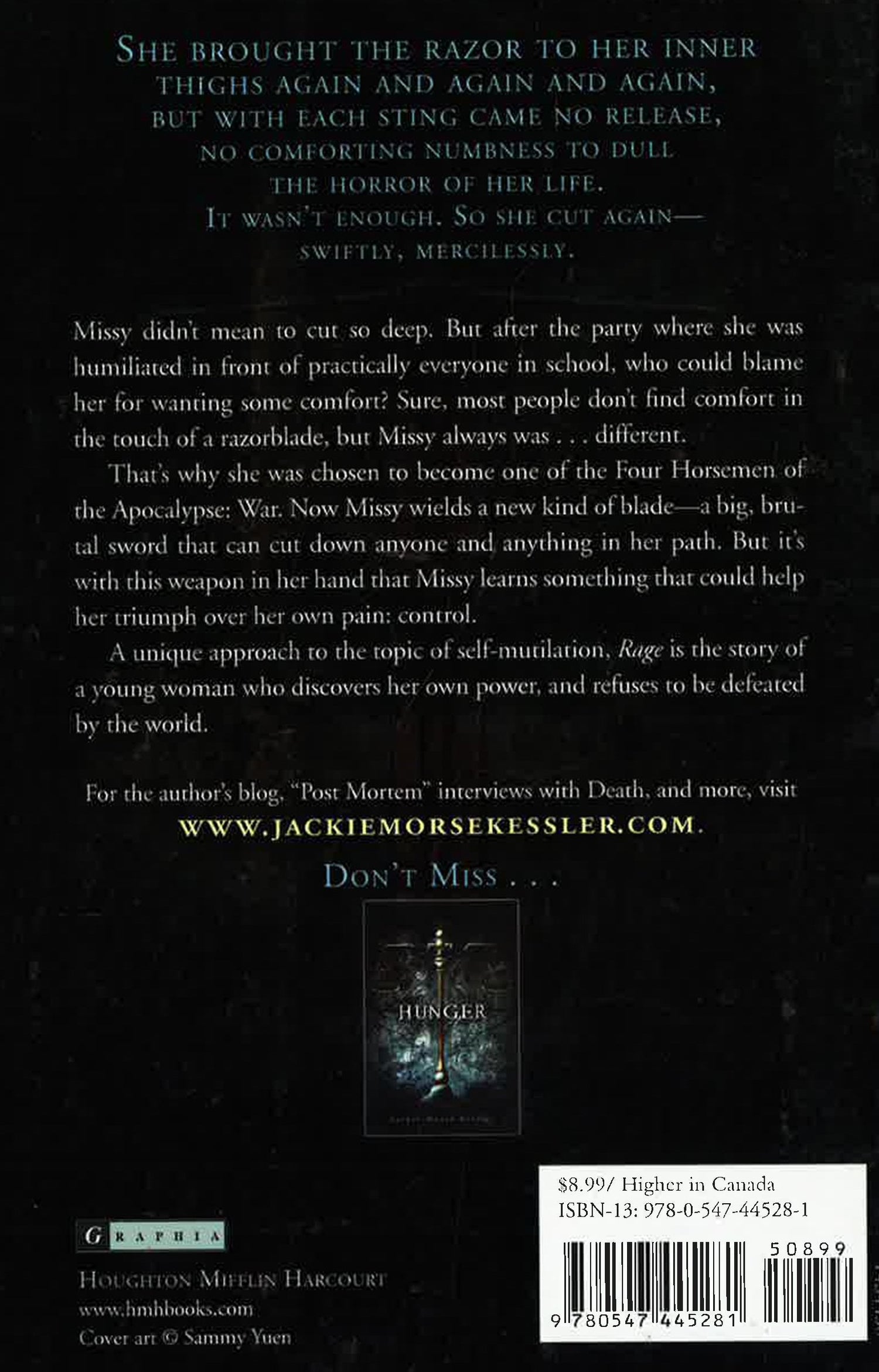 Missy didn't mean to cut so deep. But after the party where she was humiliated in front of practically everyone in school, who could blame her for wanting some comfort? Sure, most people don't find comfort in the touch of a razor blade, but Missy always was . . . different.That's why she was chosen to become one of the Four Horsemen of the Apocalypse: War. Now Missy wields a new kind of blade--a big, brutal sword that can cut down anyone and anything in her path. But it's with this weapon in her hand that Missy learns something that could help her triumph over her own pain: control.A unique approach to the topic of self-mutilation, Rage is the story of a young woman who discovers her own power and refuses to be defeated by the world.