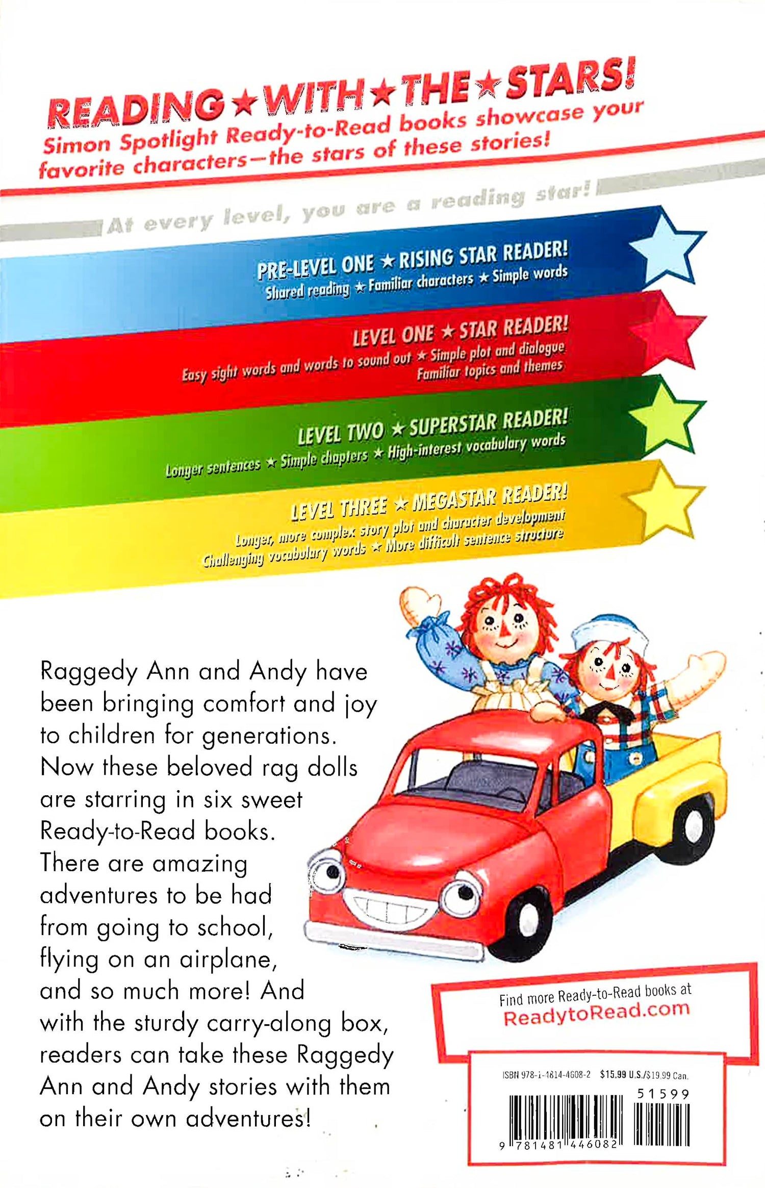Celebrate 100 years of Raggedy Ann and Andy with this sweet Ready-to-Read boxed set featuring six timeless stories! Raggedy Ann and Andy have been bringing comfort and joy to children for generations. Now, these beloved ragdolls are starring in six amazing adventures as they go to school, make new friends, fly on an airplane, and so much more! This beautiful carry-along boxed set includes School Day Adventure; Day at the Fair; Leaf Dance; Going to Grandma's; Hooray for Reading!, and Old Friends, New Friends!