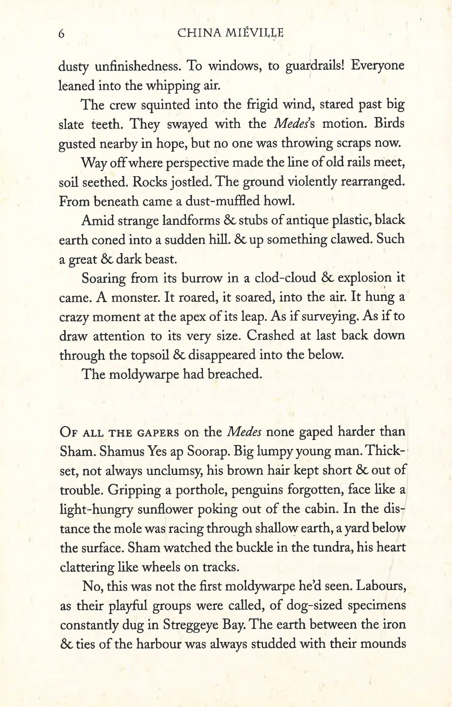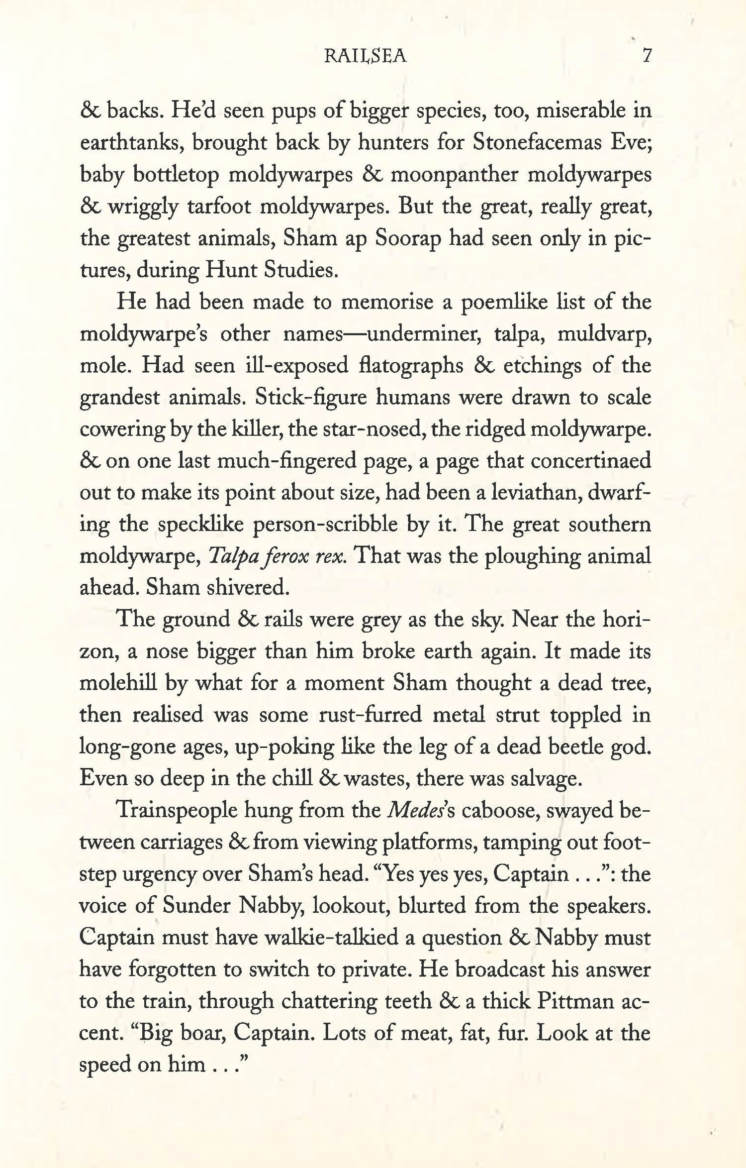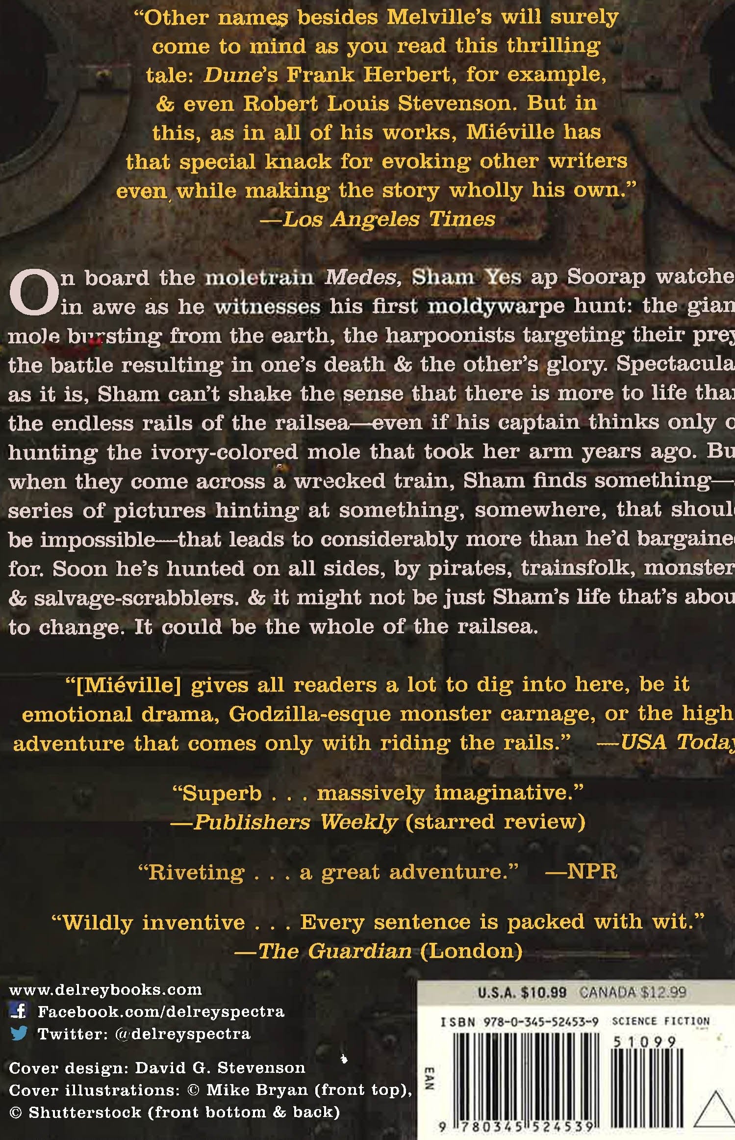On board the moletrain Medes, Sham Yes ap Soorap watches in awe as he witnesses his first moldywarpe hunt: the giant mole bursting from the earth, the harpoonists targeting their prey, the battle resulting in one's death & the other's glory. Spectacular as it is, Sham can't shake the sense that there is more to life than the endless rails of the railsea--even if his captain thinks only of hunting the ivory-colored mole that took her arm years ago. But when they come across a wrecked train, Sham finds something--a series of pictures hinting at something, somewhere, that should be impossible--that leads to considerably more than he'd bargained for. Soon he's hunted on all sides, by pirates, trainsfolk, monsters & salvage-scrabblers. & it might not be just Sham's life that's about to change. It could be the whole of the railsea.