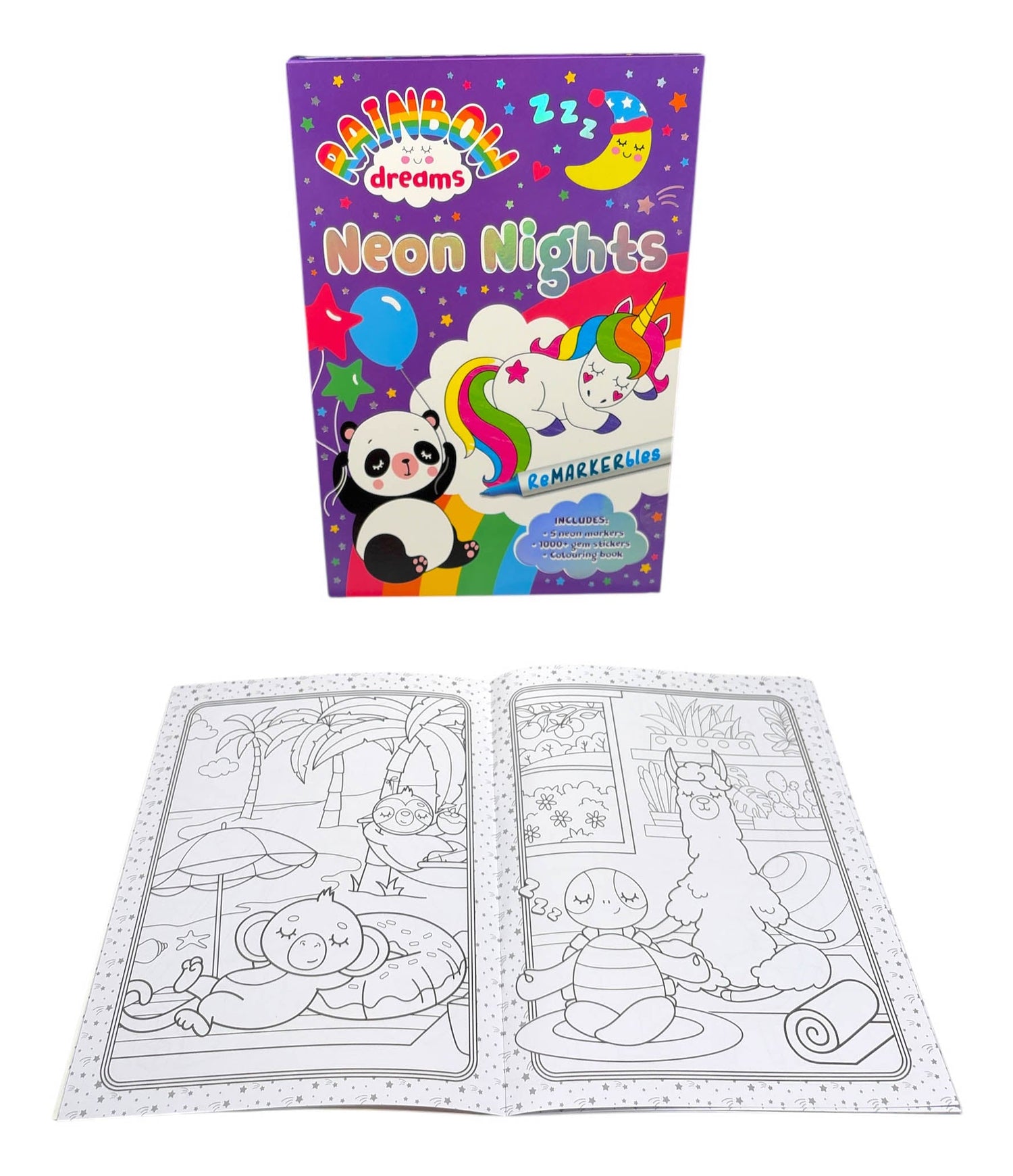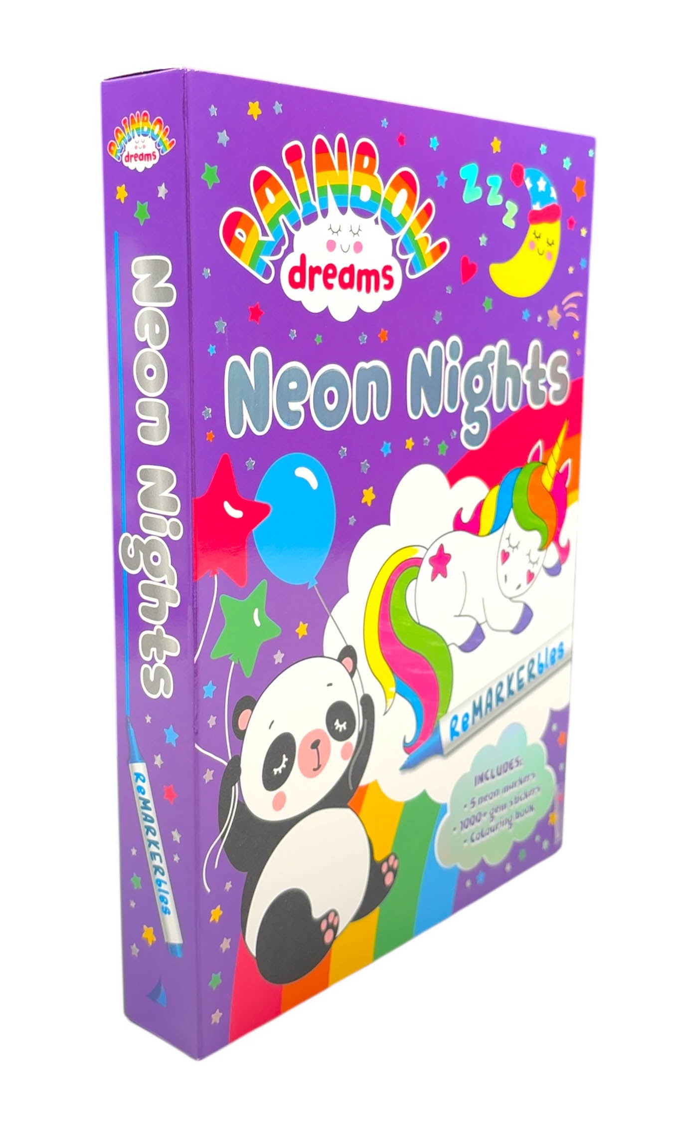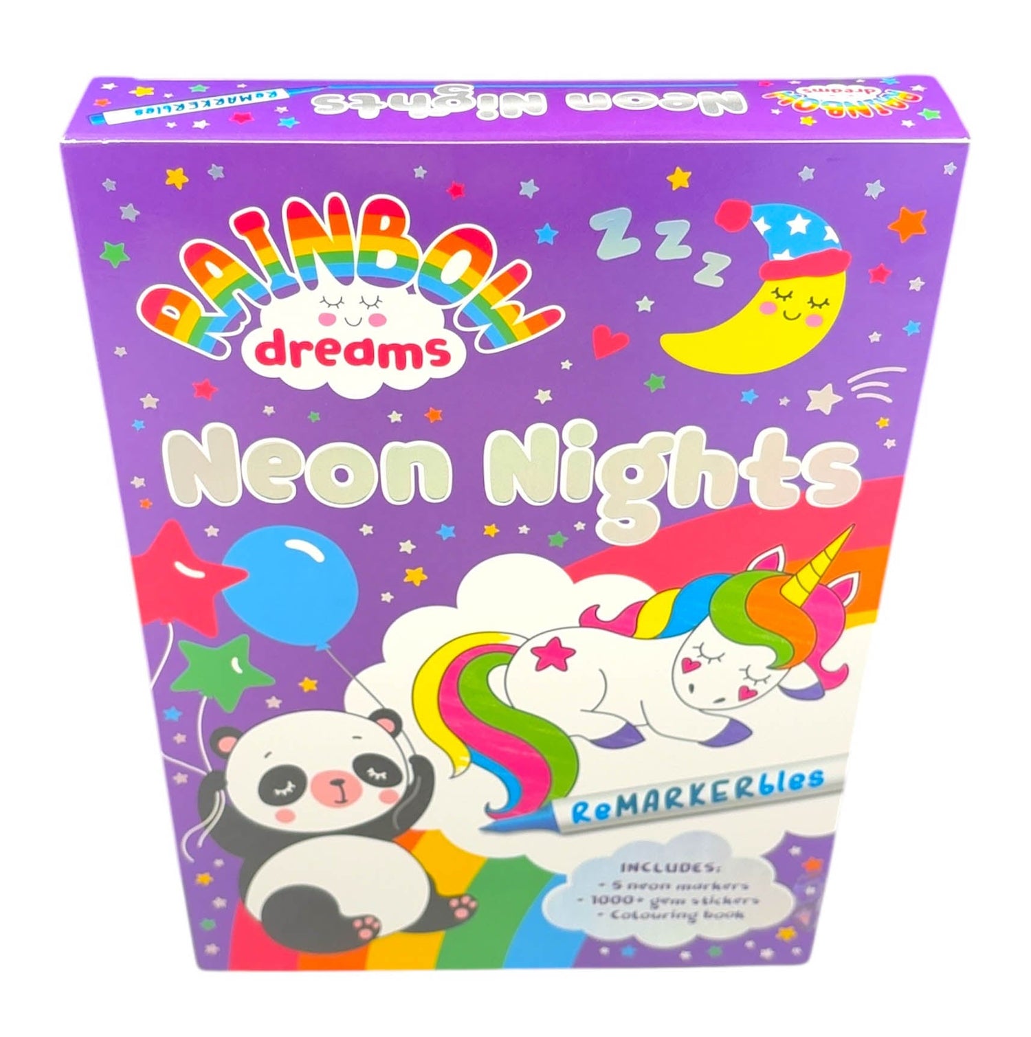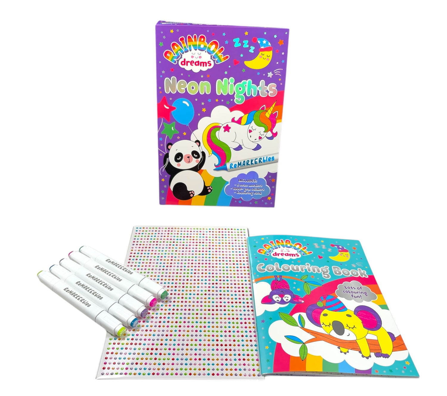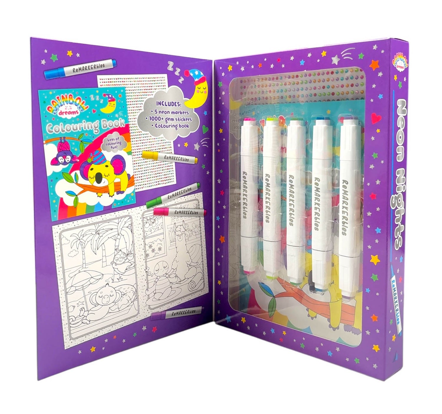 From the popular Rainbow Dreams collection comes a brand-new release - ReMARKERbles: Neon Nights. Colour in and decorate adorable sleepy creatures.This set includes a colouring book, 5 double-ended neon markers and over 1000 gem stickers!