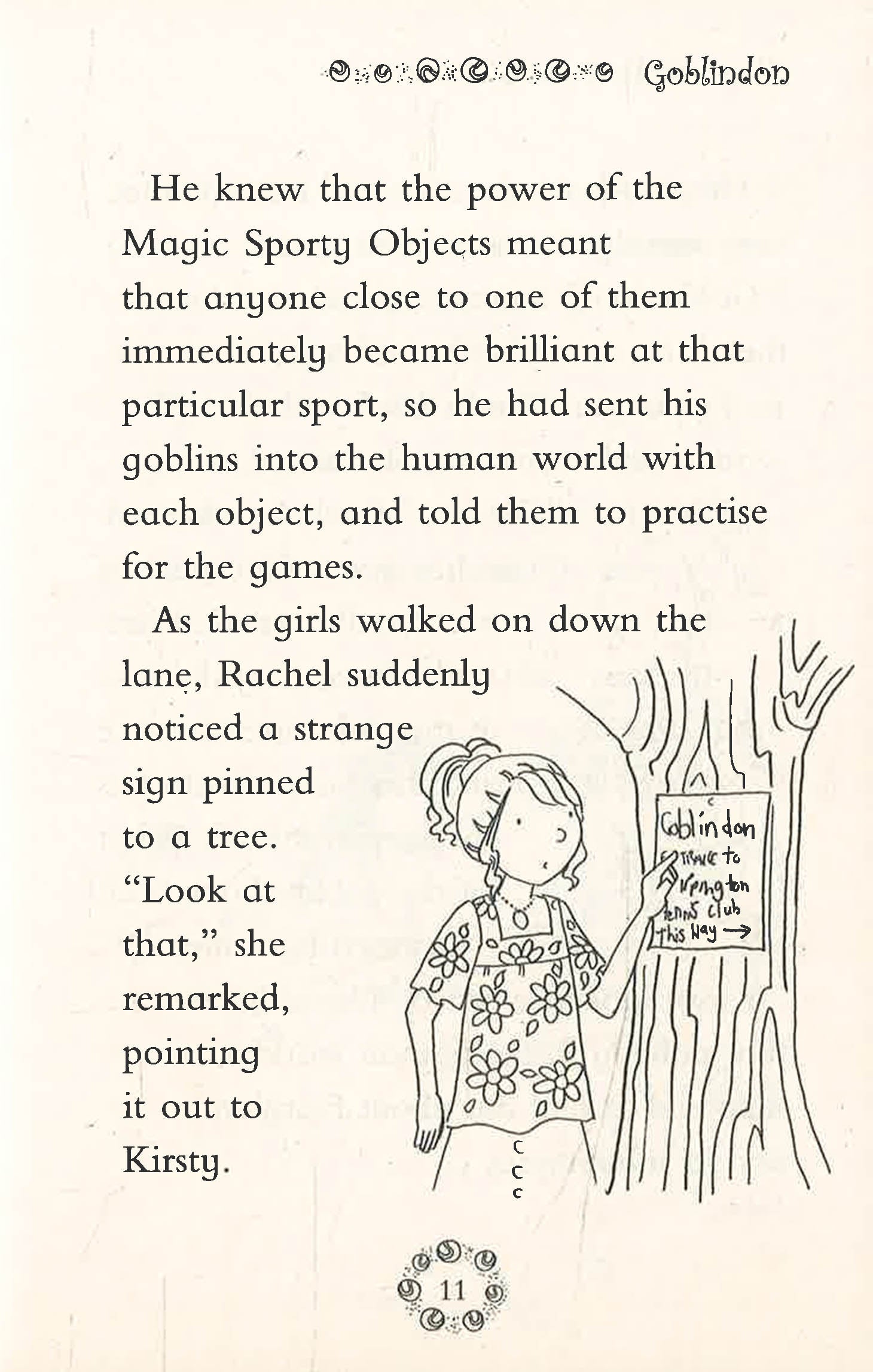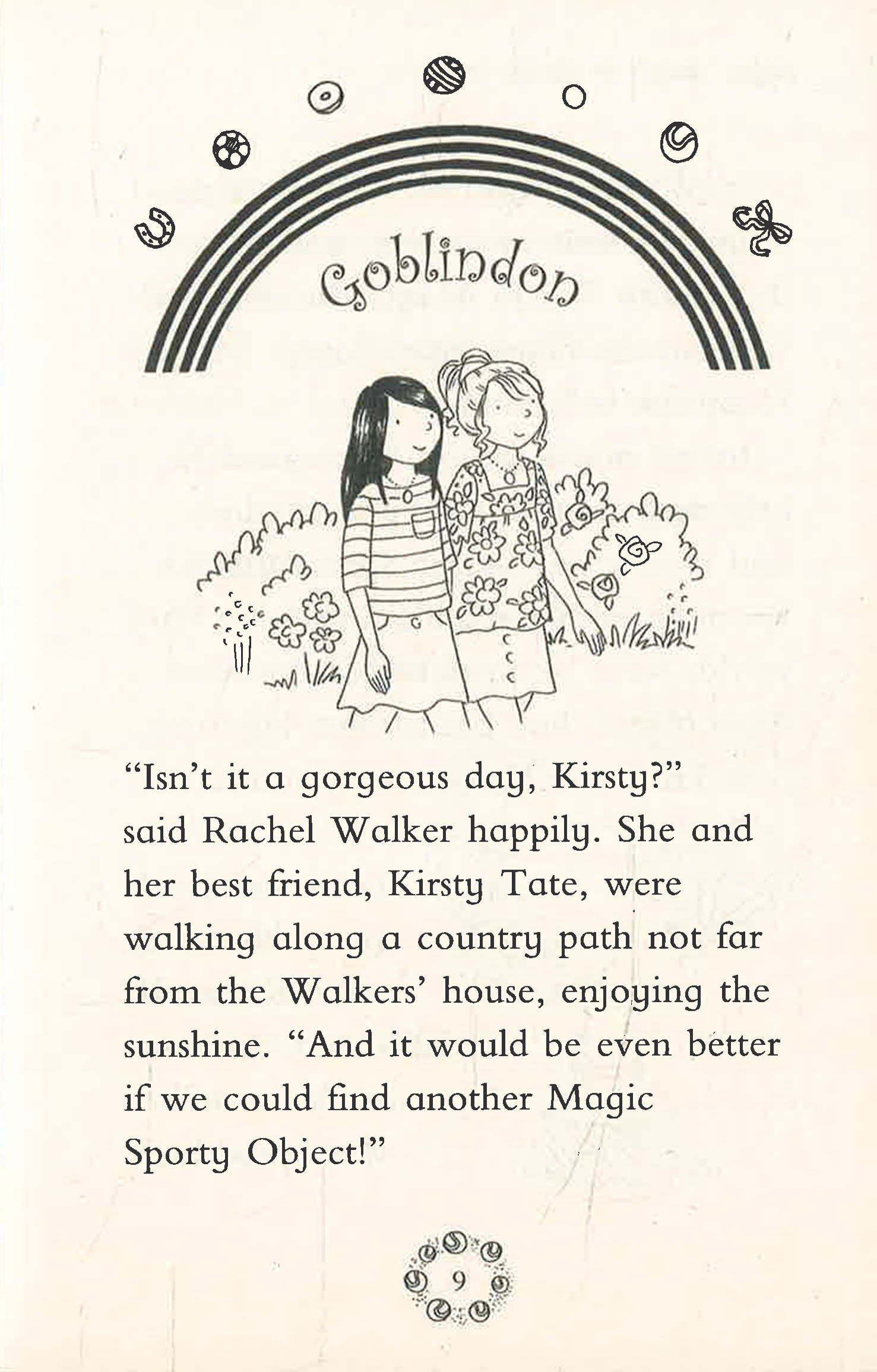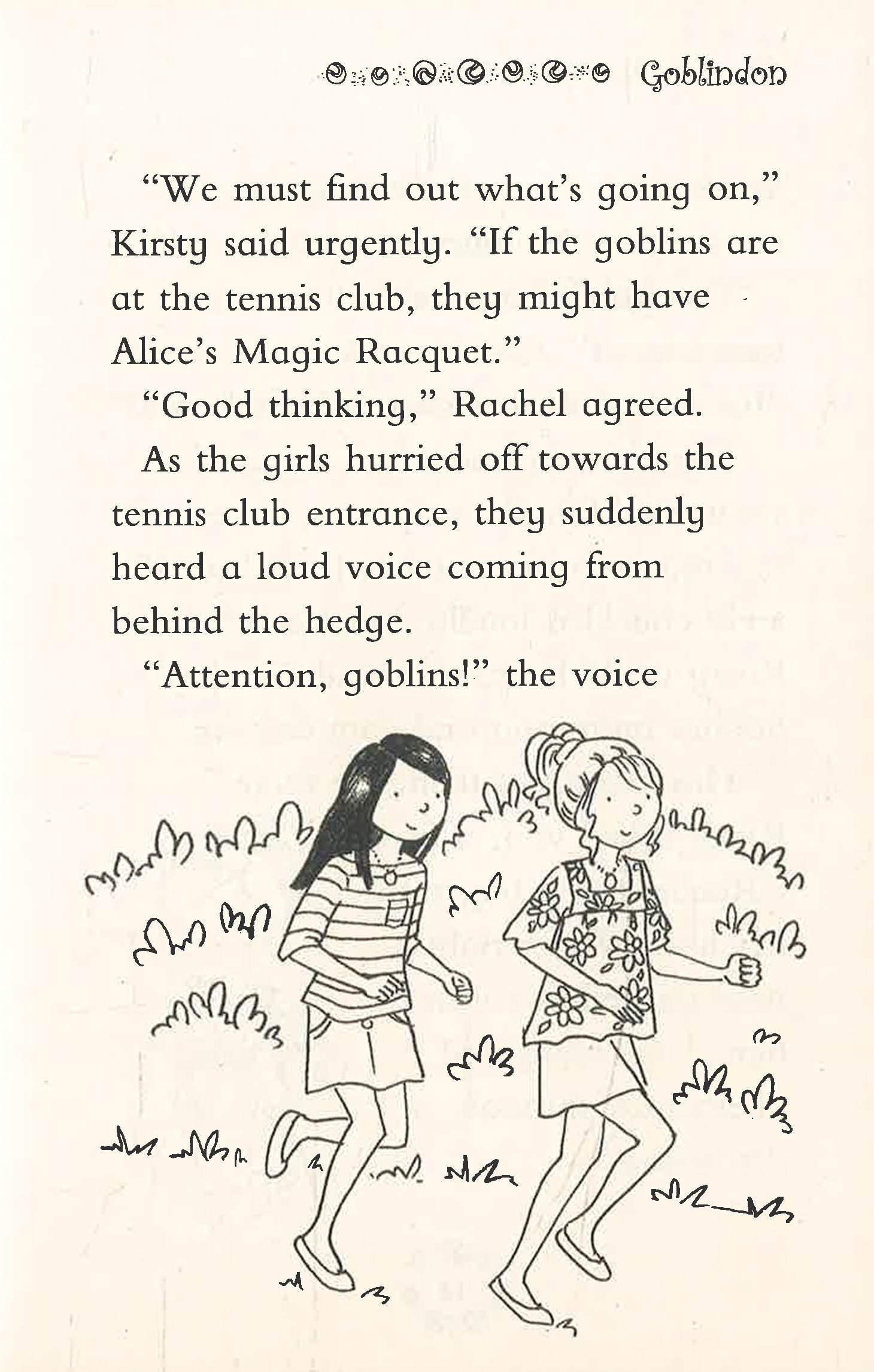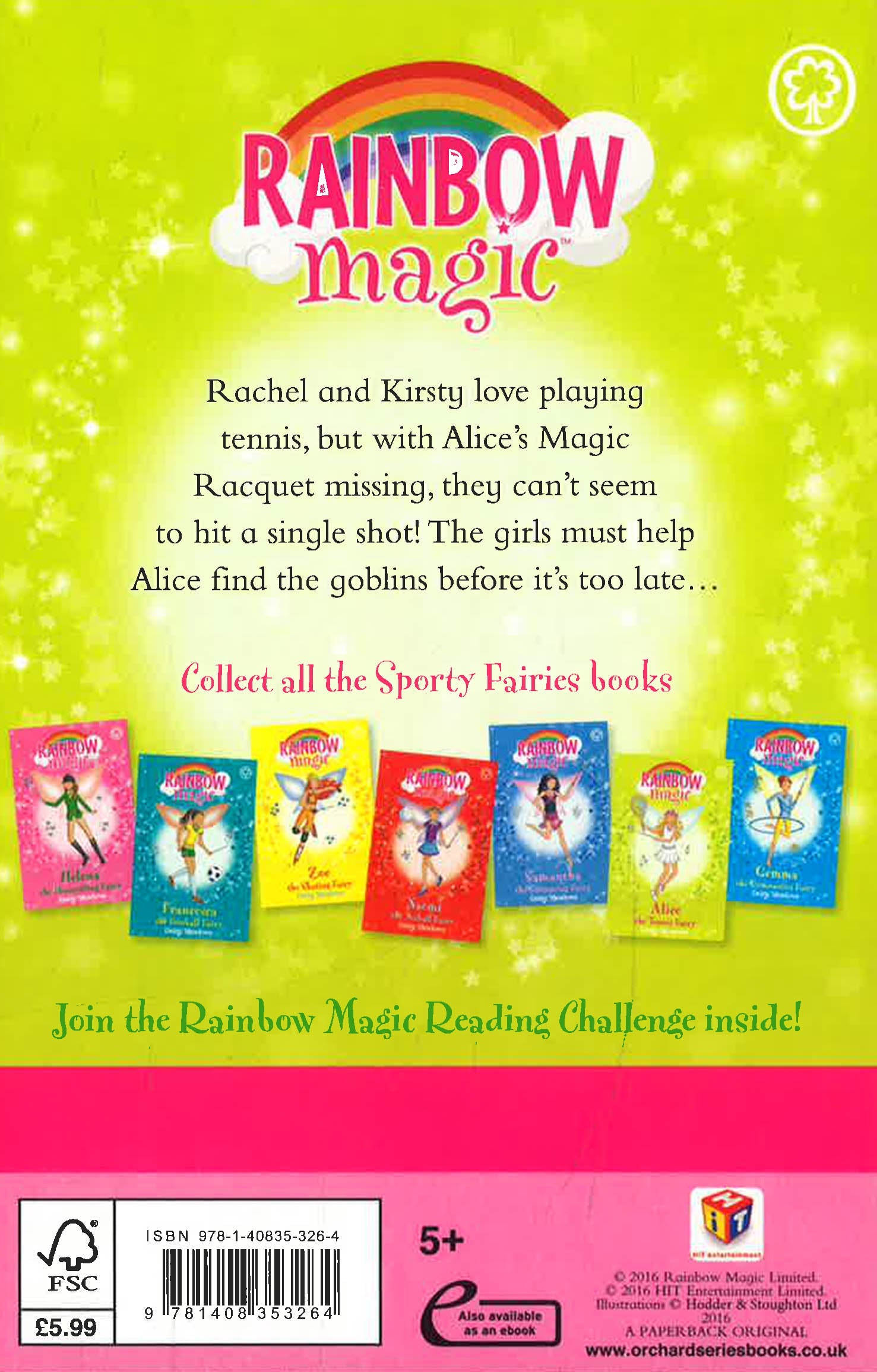 The Sporty Fairies are in need of Rachel and Kirsty's help. Everyone in Fairyland is preparing for the Fairy Olympics, but Jack Frost and his goblins have stolen the magic sporty items so they can win by cheating! What's more, with the items missing, everyone in the human world is playing sports really badly, and so the human Olympics is in danger of being ruined too! Rachel and Kirsty love playing tennis, but with Alice's Magic Tennis Ball missing, they can't seem to hit one shot! The girls must help Alice find the goblins before it's too late.